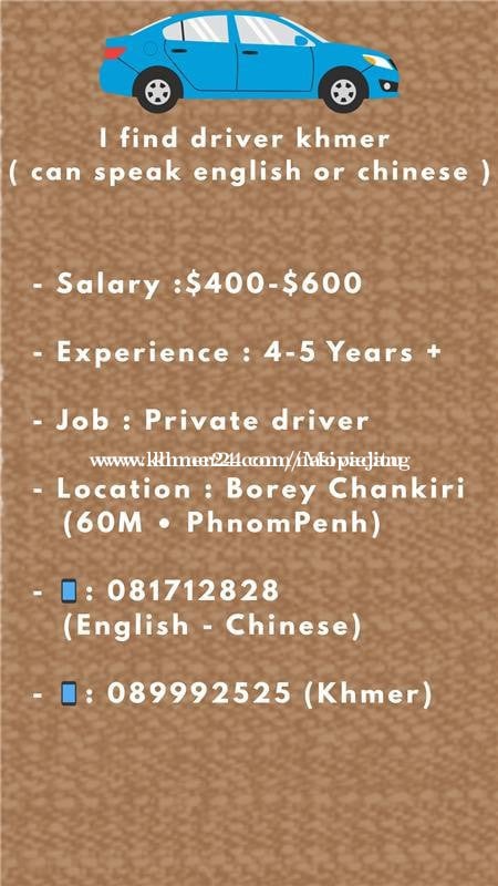 I find driver khmer ( can speak english or chinese ) Salary :$400-$600 Experience : 4-5 Years + Job : Private driver Location : Borey Chankiri ( 60M β’ PhnomPenh ) π±: 081712xxxClick To Call ( English - Chinese ) π±: 089992xxxClick To Call ( Khmer )
