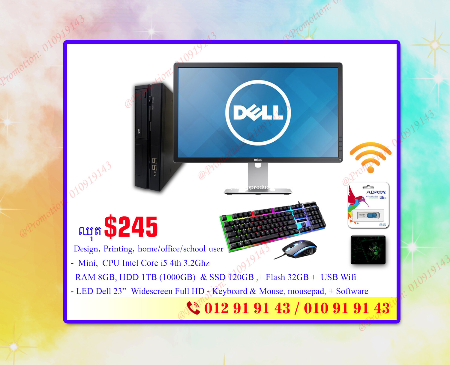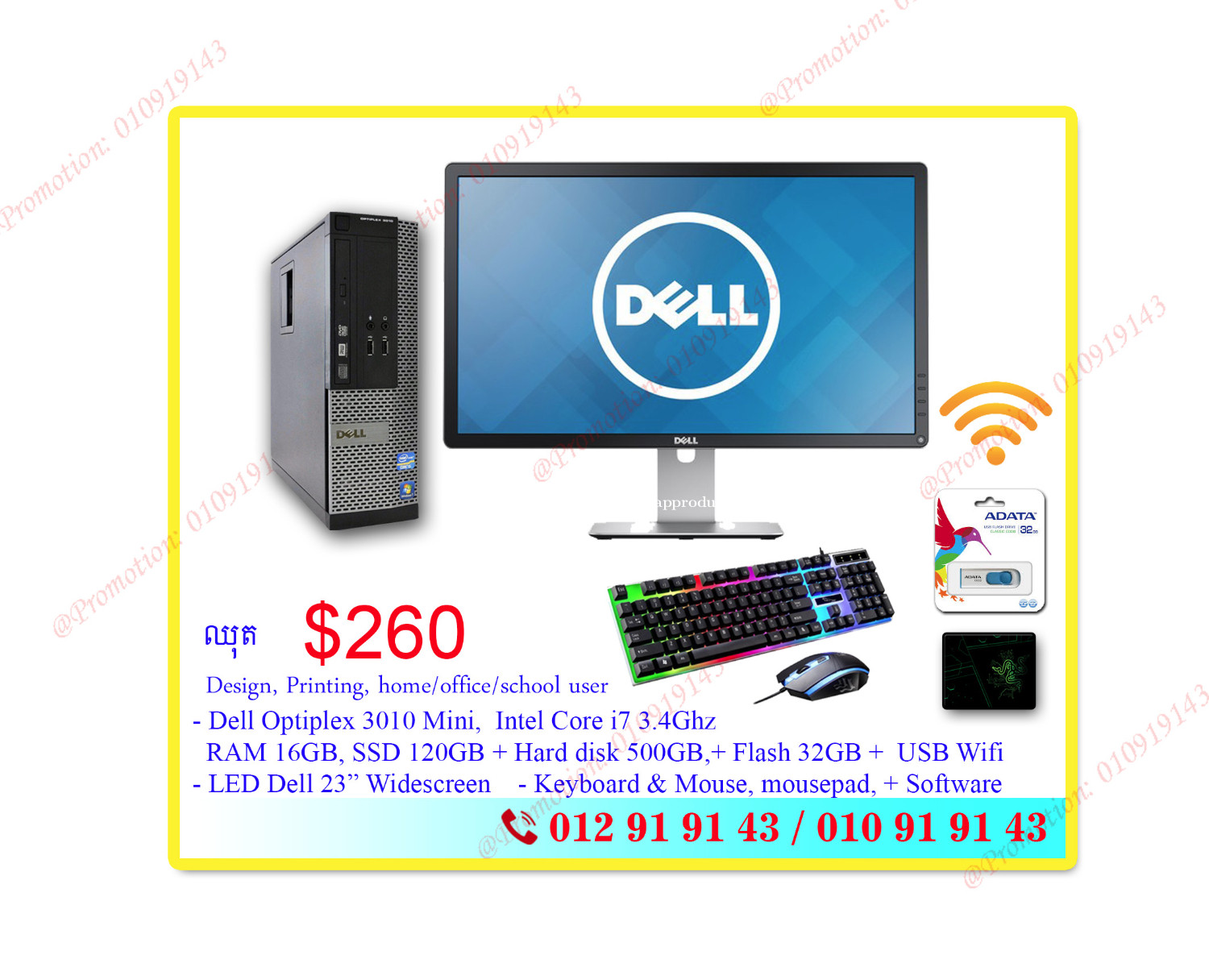 Promotion Set available in stock! ឈុត Computer i5 4th 3.2Ghz / Ram 8GB/ HDD 1TB & SSD 120GBfor Designer Office&home user 2=>(ឈុត Set 2) for Design, Printing, home/office/online/school user System Mini - CPU: - CPU: Intel Core i5 4th 3.2Ghz (= Faster Core i7 3rd Gen) - RAM: 8GB - Hard Disk: 1000GB (1TB) + SSD 120GB **Display: LED Dell 23 Inch Widescreen Full HD **Free Keyboard, Mouse, Mousepad + Cable ** Free Flash 32GB + Free Design Software ** Free USB Wifi **Free window & software installation Good for Designer, Printing, Home/School, office, online use ***** Reference #: Set0195-02 = Normal price: $275 =>Promotion Price: $245 -------------------------------- Special Promotion Limited offer Welcome for school / learning user/ Office user, Designer **ទំនិញមានក្នុងស្តុក ------------------------------------------------- ☎️ H/P: 010919xxxClick To Call | 012919xxxClick To Call ------------------------------------------------- Working Hour: 8:00 am to 6:00 pm សំរាប់ការកម្មង់ទិញ ឬ ពត៍មានបន្ថែម សូម CALL ទាក់ទងលេខខាងលើ៖ 3=>(ឈុត Set 3) for Design, Printing, home/office/online/school user Dell Mini 3020 - CPU: Intel Core i3 3.2Ghz - RAM: 8GB - HDD 500GB + SSD 120GB **Display: LED 22 inch Widescreen **Free Keyboard, Mouse, Mouse pad + Cable ** Free Design Software ** Free USB Wifi ** Good for Designer, Printing, Home/School, office, online use ***** Reference #: Set0195-03 ** Regular Price $195 => Promotion Price: $170 -------------------------------- 4=>(ឈុត Set 4) for Design, Printing, home/office/school user Reference # S026-04 System Dell OptiPlex 3010 mini SFF - CPU: Intel Core i7 3.4Ghz - RAM: 16GB - SSD 120GB + Hard Disk: 500GB **Display: LED Dell 23 Inch Widescreen Full HD (Slim) **Free Keyboard, Mouse, Mousepad + Cable ** Free Flash 32GB + Free Design Software ** Free USB Wifi **Free window & software installation = Normal price: $285 =>Promotion Price: $260 -------------------------------- 💥💥 ទំនិញមានក្នុងស្តុក ------------------------------------------------- H/P: 010919xxxClick To Call | 012919xxxClick To Call ------------------------------------------------- Working Hour: 8:00 am to 6:00 pm សំរាប់ការកម្មង់ទិញ ឬ ពត៍មានបន្ថែម សូម CALL ទាក់ទងលេខខាងលើ៖