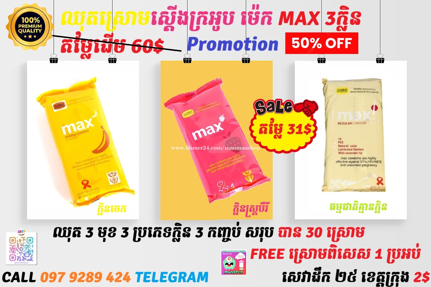Promotions 50% Max condoms ស្រោម ស្តើងក្រអូបលេខ1 (3 ប្រភេទក្លិនខុសៗគ្នា) មានច្រើនក្លិន មួយកញ្ចប់មាន10 ស្រោម (ក្រអូបខ្លាំង) 👉 សូមពាក់ស្រោមដើម្បីជួយការពារ ✅ការពារការឆ្លងមេរោគកាមរោគ ✅ការពារការឆ្លងមេរោគHIV ✅ការពារមានកូនដោយចៃដន្យ ✅ការពាររោគផ្សេងៗដែលឆ្លងតាមការរួមភេទ ✅មានស្តង់ដារ ទទួលស្គាល់ Certification: CE,ISO,FSC,SABS សូមរក្សាសុខភាពទាំងអស់គ្នា 🙏🙏 ស្រោមប្រភេទមាន គុណភាពស្តង់ ដារ ធានាបាននៅសុខ សុវត្ថិភាព 🥰មាន 3 ក្លិន សំរាប់ ជ្រើសរើស បាទ 🍓💧🍌 សេវាដឹកជញ្ជូន 25 ខេត្តក្រុង 2$ 📦 🛵🚛 ☎️📞 0979289xxxClick To Call or Inbox 📨Telegram https://t.me/MAXMMMAN