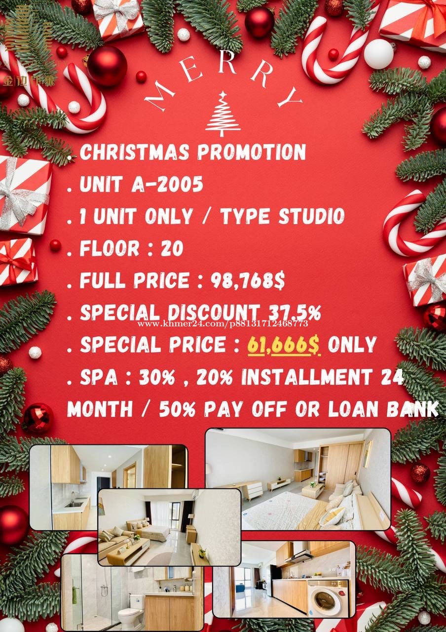 Big 🎄 Christmas Promotion🎅 - unit : A-2005 - 1 unit only / ប្រភេទ studio - ជាន់ទី : 20 - តម្លៃពេញ : 98,768$ - បញ្ចុះរហូតដល់ : 37.5% - តម្លៃពិសេស : 61,666$ - spa 30% | 20% x 24ខែ | 50% បង់ផ្ដាច់ or loan bank