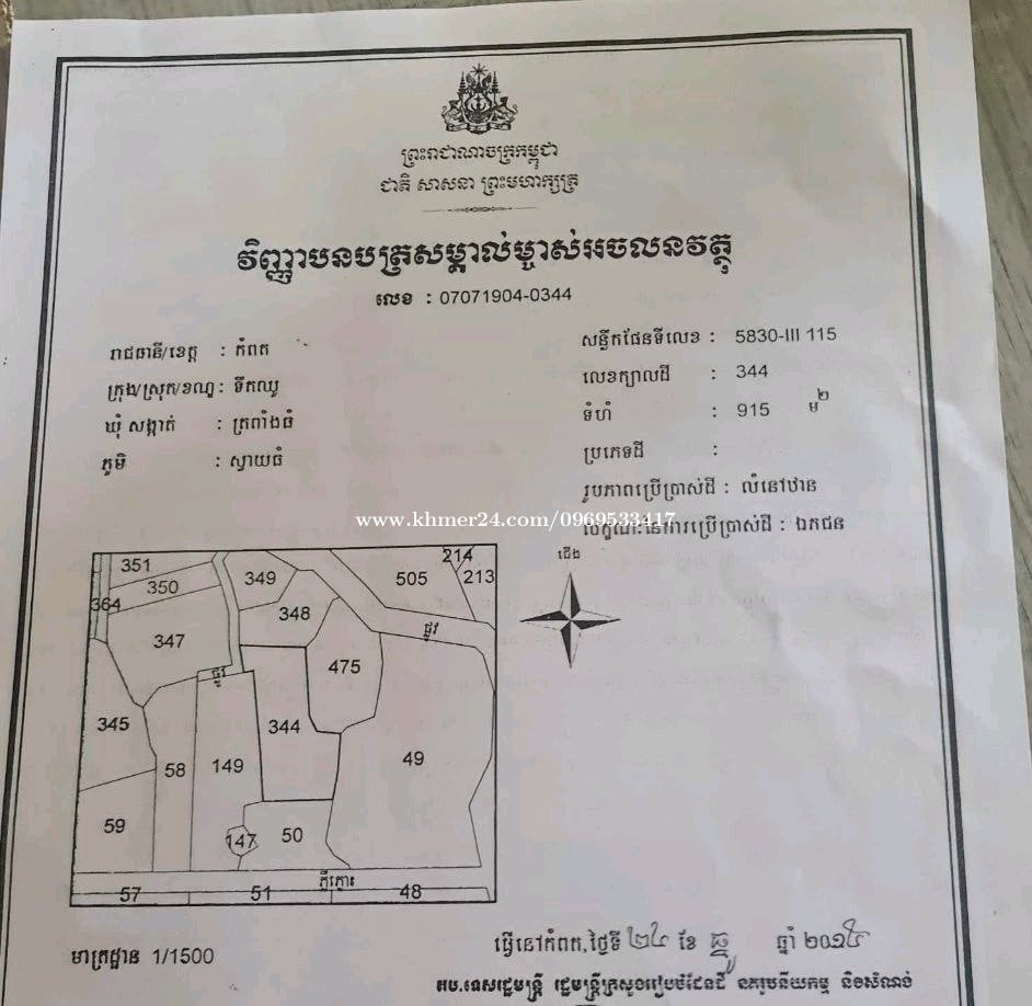 ផ្ទះនិងដីលក់⚡️ នៅក្នុងខេត្តកំពត ក្រុងកំពត ។ Property for sale in Kampot Provinc. English below. 👉ទីតាំងល្អ ដែលមានចម្ងាយ2km ពីផ្សារសាមគ្គីក្រុងកំពត ជាតំបន់ទីប្រជុំជន ស្ងប់ស្ងាត់ ងាយស្រួលរស់នៅ ជាប់ផ្លូវបេតុងរដ្ឋ. 👉 ដីទំហំ: ទទឹងខាងមុខ 19ម ខាងក្រោយ25ម×បណ្តោយ41ម សរុប 915មការ៉េ។ 👉ទំហំផ្ទះ ៖ 7m x 15m 👉ផ្ទះមានបន្ទប់ចំនួនគេង 3, បន្ទប់ទឹក 4, ផ្ទះបាយ កន្លែងទទួលភ្ញៀវ 👉 👉ផ្ទះបែរមុខទៅទិសខាងជើង 👉 លក់តំលៃ 130.000ដុល្លា (ចរចា) ផ្ទេរកម្មសិទ្ធិជូន(ប្លង់រឹង) និងផ្តល់ជួនសំភារៈប្រើប្រាស់ទាំងអស់ 👉 House and land for sale in Kampot. - Location address: Svay Thom village, Kampot province. It is about 2km from Kampot market. 👉 Land size: 915 square meter. 👉 Hard title. 👉 This house has 3 bedrooms, 4 bathrooms, 1 kitchen, 1 living area with fully furnished. 👉 Full fenced around the property 👉 Sell cost: 130.000$. (Negotiate) Includes name transfer and taxes, and furniture in the house. 👉 Please let me know if you are interested to visit. _ Call: 0969533xxxClick To Call _ Telegram: t.me/pusalim Thanks