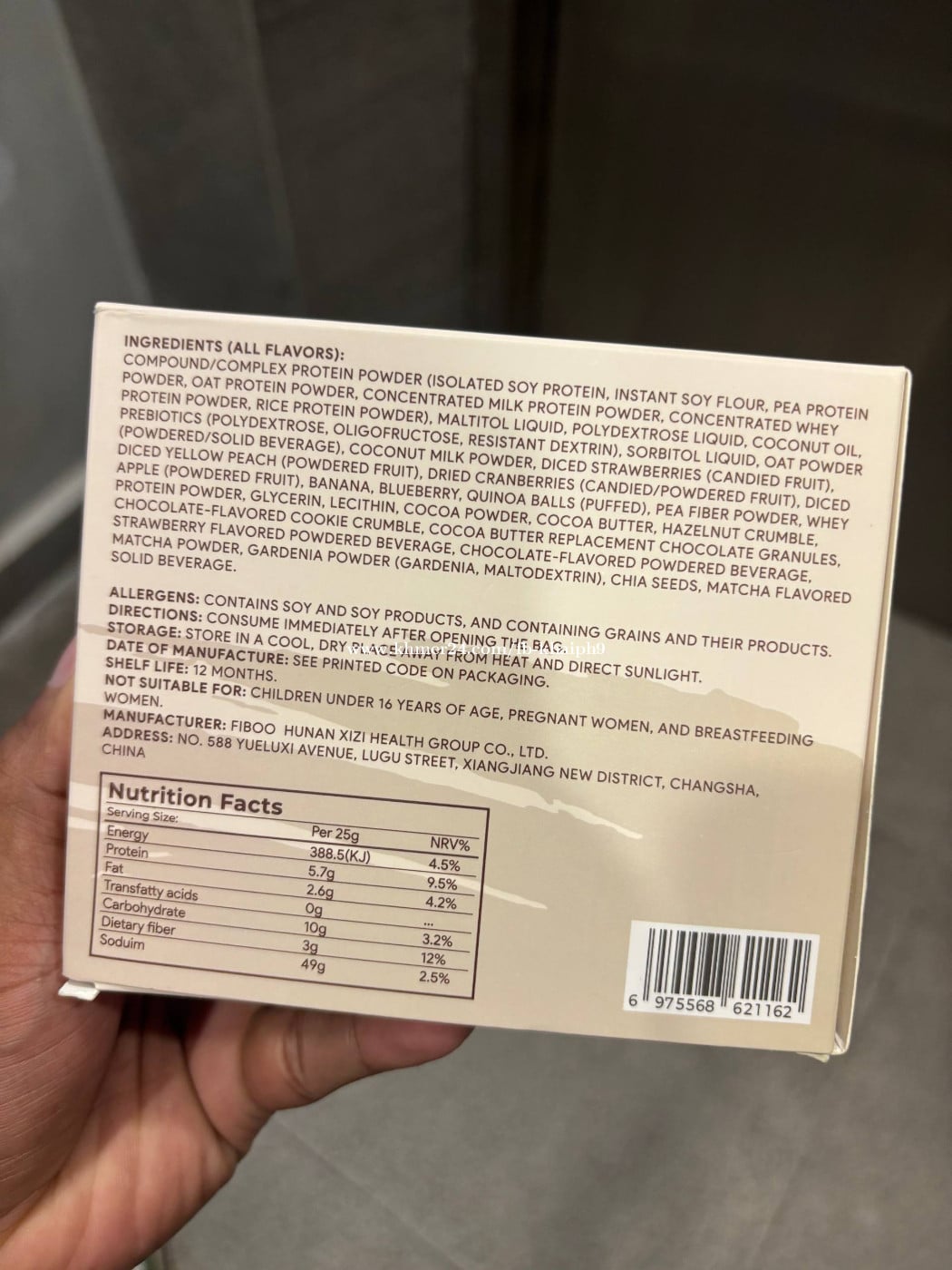 Protein Bar box =5$ (7pcs) COMPOUND/COMPLEX PROTEIN POWDER (ISOLATED SOY PROTEIN, INSTANT SOY FLOUR, PEA PROTEIN POWDER, OAT PROTEIN POWDER, CONCENTRATED MILK PROTEIN POWDER, CONCENTRATED WHEY PROTEIN POWDER, RICE PROTEIN POWDER), MALTITOL LIQUID, POLYDEXTROSE LIQUID, COCONUT OIL, PREBIOTICS (POLYDEXTROSE, OLIGOFRUCTOSE, RESISTANT DEXTRIN), SORBITOL LIQUID, OAT POWDER (POWDERED/SOLID BEVERAGE), COCONUT MILK POWDER, DICED STRAWBERRIES (CANDIED FRUIT). DICED YELLOW PEACH (POWDERED FRUIT), DRIED CRANBERRIES (CANDIED/POWDERED FRUIT), DICED APPLE (POWDERED FRUIT), BANANA, BLUEBERRY, QUINOA BALLS (PUFFED), PEA FIBER POWDER, WHEY PROTEIN POWDER, GLYCERIN, LECITHIN, COCOA POWDER, COCOA BUTTER, HAZELNUT CRUMBLE. CHOCOLATE-FLAVORED COOKIE CRUMBLE, COCOA BUTTER REPLACEMENT CHOCOLATE GRANULES, STRAWBERRY FLAVORED POWDERED BEVERAGE, CHOCOLATE-FLAVORED POWDERED BEVERAGE, MATCHA POWDER, GARDENIA POWDER (GARDENIA, MALTODEXTRIN), CHIA SEEDS, MATCHA FLAVORED SOLID BEVERAGE.