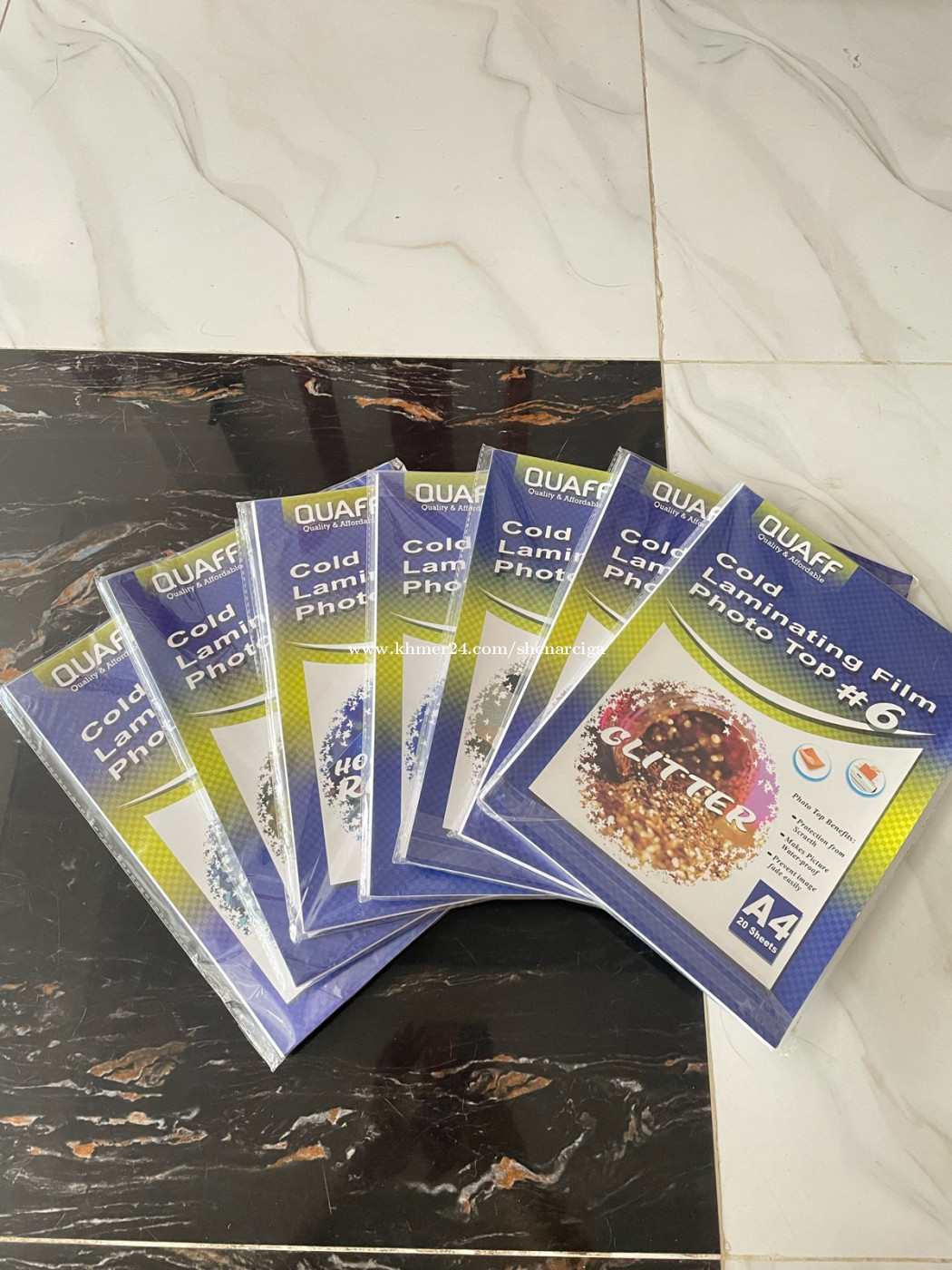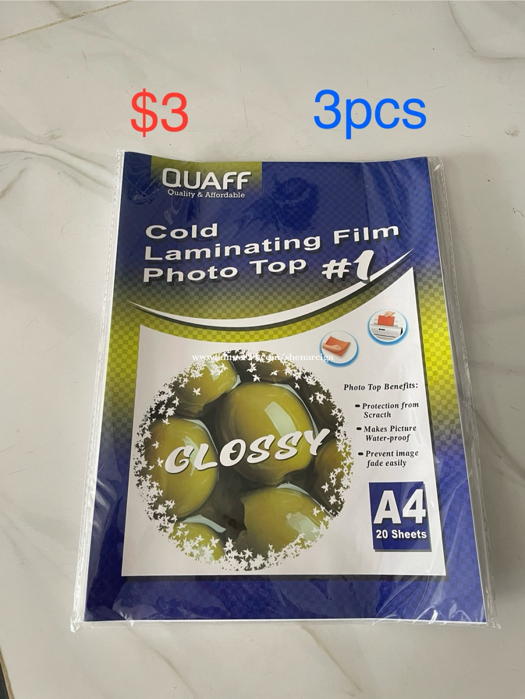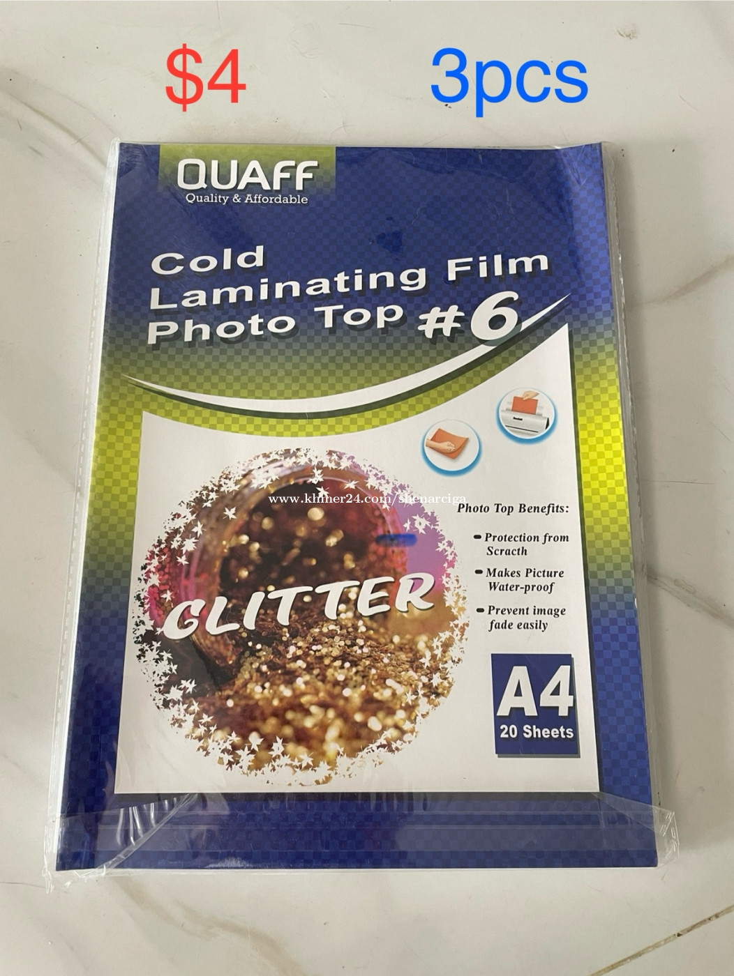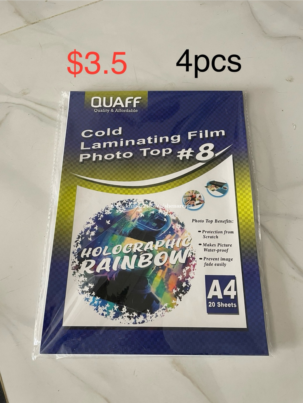 Price starts from $3-$4. Cold Laminating Film with 7 different design (Rainbow, Broken Glass, Glitter, Matte, Glossy, Leather, 3D). Price and stocks listed in the picture.