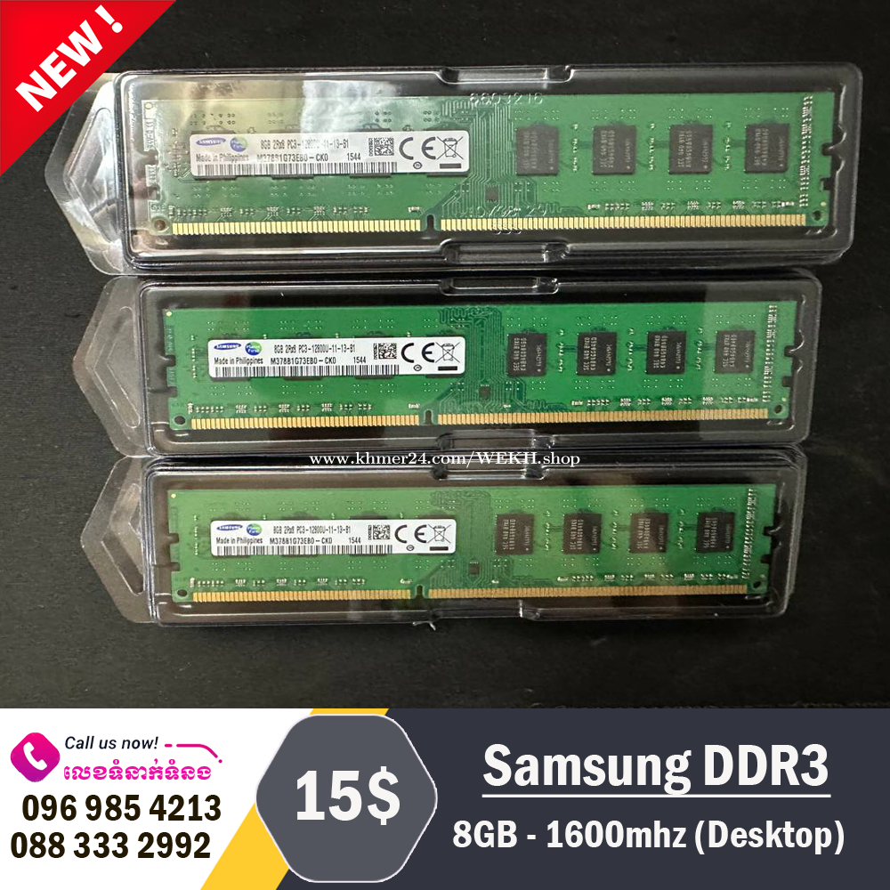Memory Type: DDR3 Type: Desktop Capacity: 8GB Speeds: 1600MHz Operating Voltage: DDR4 STD 1.5V Warranty: 1 year ------------------------------------------------------------------------------------------- # RAM =>Desktop – - ADATA DDR3 8GB: $15 (New) - ADATA DDR4 8GB: $18 (New) - Samsung DDR4 18GB: $30 (New) # RAM =>Laptop – - ADATA DDR3 8GB: $15 (New) - ADATA DDR4 8GB: $18 (New) # New SSD HY - SSD 128GB: $15 (New) - SSD 256GB: $25 (New) -SSD 512GB: $35 (New) # New M2 - SK 128GB: $20 (New) - SK 256GB: $30 (New) -SSD 512GB: $50 (New) # Motherboard => Desktop – - Gigabyte H61: $30 (support Intel gen 2&3) - Asus H85: $35 (support Intel gen 4) - Gigabyte H110m: $40 (support Intel gen 6&7) - MSI H310m: $40 (support Intel gen 8&9) - MSI B560m: $50 (support Intel gen 10&11) ទំនិញមានក្នុងស្តុក - ដើម្បីទទួលបាន ព័ត៌មានថ្មីៗ លម្អិត និងការផ្តល់ជូនតម្លៃពិសេសៗ សូមទំនាក់ទំនង៖ Contact: 0969854xxxClick To Call / 0883332xxxClick To Call Telegram: https://t.me/yukmongkol