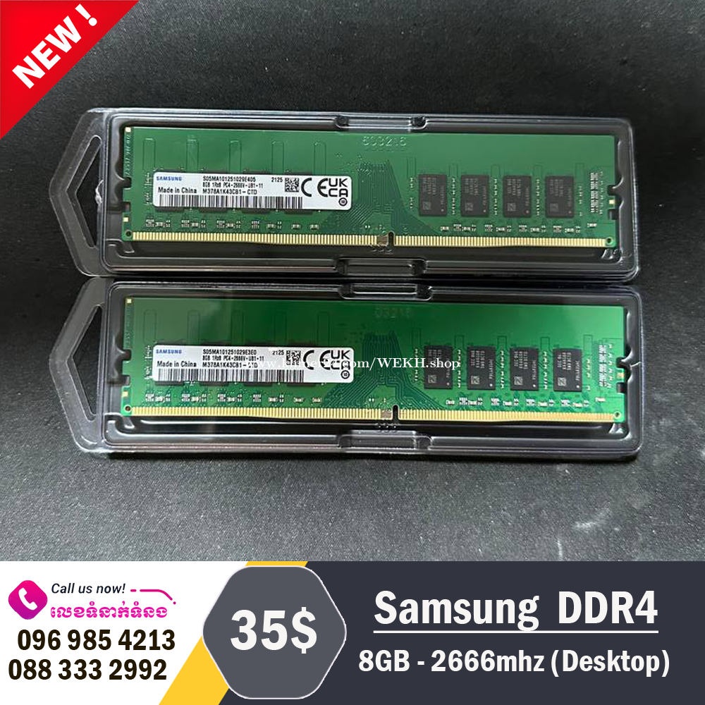 Memory Type: DDR4 Type: Desktop Capacity: 8GB Speeds: 2666MHz Operating Voltage: DDR4 STD 1.5V Condition: New Warranty: 1 year ------------------------------------------------------------------------------------------- # RAM =>Desktop – - ADATA DDR3 8GB: $15 (New) - ADATA DDR4 8GB: $18 (New) - Samsung DDR4 18GB: $30 (New) # RAM =>Laptop – - ADATA DDR3 8GB: $15 (New) - ADATA DDR4 8GB: $18 (New) # New SSD HY - SSD 128GB: $15 (New) - SSD 256GB: $25 (New) -SSD 512GB: $35 (New) # New M2 - SK 128GB: $20 (New) - SK 256GB: $30 (New) -SSD 512GB: $50 (New) # Motherboard => Desktop – - Gigabyte H61: $30 (support Intel gen 2&3) - Asus H85: $35 (support Intel gen 4) - Gigabyte H110m: $40 (support Intel gen 6&7) - MSI H310m: $40 (support Intel gen 8&9) - MSI B560m: $50 (support Intel gen 10&11) ទំនិញមានក្នុងស្តុក - ដើម្បីទទួលបាន ព័ត៌មានថ្មីៗ លម្អិត និងការផ្តល់ជូនតម្លៃពិសេសៗ សូមទំនាក់ទំនង៖ Contact: 0969854xxxClick To Call / 0883332xxxClick To Call Telegram: https://t.me/yukmongkol