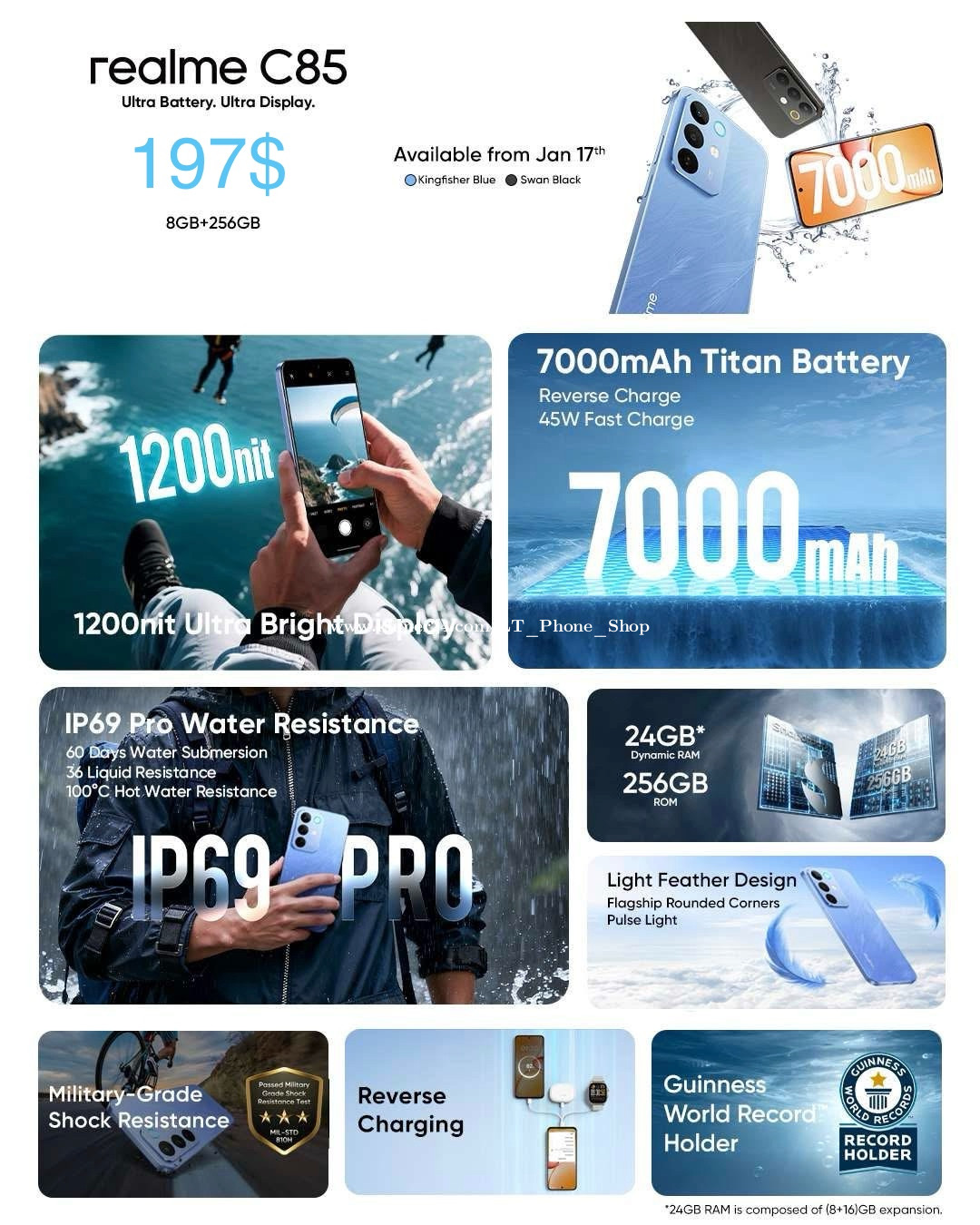 🤩 Realme C85 (8GB+16GB/256GB) កំពូលទូរសព្ទ័ស្មាតហ្វូនគុណភាពប្រើប្រាស់លើស6ឆ្នាំតម្លៃក្រោម 200$ realme លេងហើយ 🤩🎉💰💎 💰 realme C85 តំលៃ 197$ បញ្ចុះតំលៃនៅសល់ត្រឹម 178$ តែប៉ុណ្ណោះ 💎 បន្ទៈឈីប Snapdragon 685 💎 រ៉េមដំឡើងដល់ 24GB (8GB + 16GB dynamic expansion) 💎 ទហំផ្ទុកឯកសារ 256GB, expandable up to 1TB via a card slot 💎 អេក្រង់ 6.8" Eye Comfort display 💎 Brightness: Up 1,200-nit peak Brightness 💎 ថ្ម 7000mAh ឆ្នាំសាក 45W 💎 អាវក្រោះការពារទឹក IP69Pro 💎 កំពូល AI 💎 អេក្រង់ល្បឿនលឿន 144Hz 💎 កាម៉េរា 50MP 🏡 ហាងលក់ទូរស័ព្ទដៃទំនើប អិលធី 📲 ទំនាក់ទំនងលេខទូរស័ព្ទ: 016711xxxClick To Call (Telegram) / 099333xxxClick To Call / 0888884xxxClick To Call 📩 Telegram: https://t.me/LTPhoneShop 📬 Facebook Page: https://www.facebook.com/share/165XEwR2ZA/?mibextid=wwXIfr 🗺️ ផ្ទះលេខ139c, ផ្លូវលេខ143 កែងផ្លូវលេខ376, សង្កាត់បឹងកេងកង3, ខណ្ឌបឹងកេងកង, រាជធានីភ្នំពេញ 📍Google map: https://maps.app.goo.gl/phENGCSAT33SaM9r7?g_st=com.google.maps.preview.copy 🛵 មានសេវាដឹកជញ្ជូនគ្រប់ខេត្តក្រុងរាជធានី