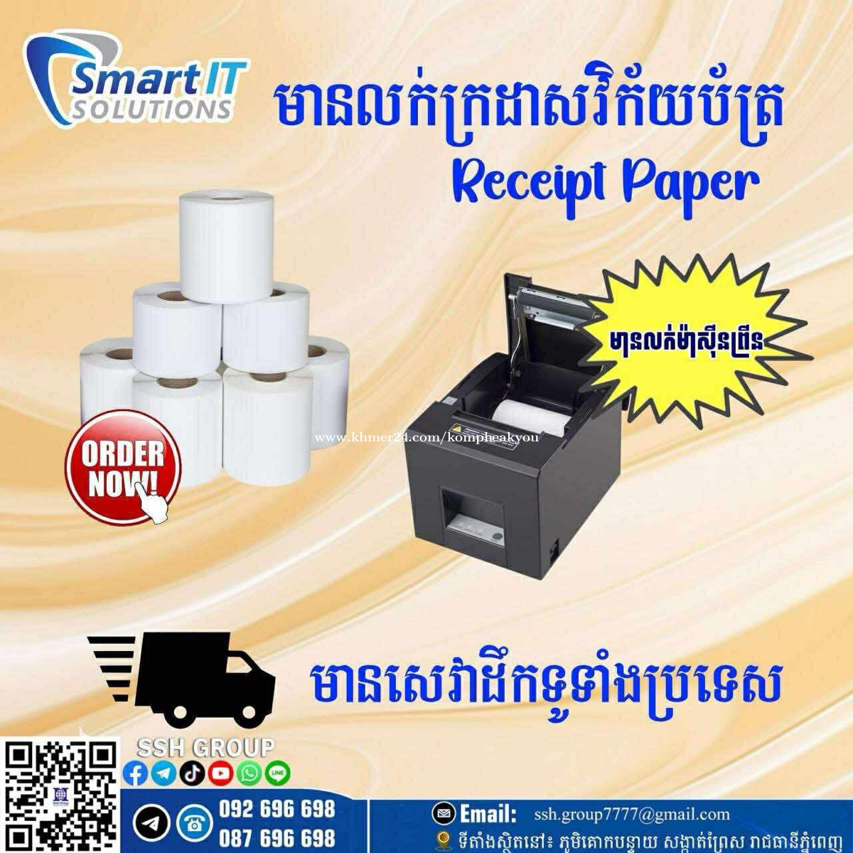 ជម្រាបសួរបង ដែលមាននូវតម្រូវការចង់បានប្រភេទក្រដាស Receipt យកទៅប្រើប្រាស់ឬលក់បន្ដបោះដុំនិងលក់រាយ SSH យើងមានផ្គត់ផ្គង់នូវប្រភេទក្រដាស Receipt ដែលមានដូចជាខ្នាត -80*80mm -57*40mm -80*40mm Free ដឹកជញ្ជូនក្នុងរាជធានីភ្នំពេញ សម្រាប់ព័ត៍មានបន្ថែម លេខទូរស័ព្ទ និងតេឡេក្រាម 016859xxxClick To Call