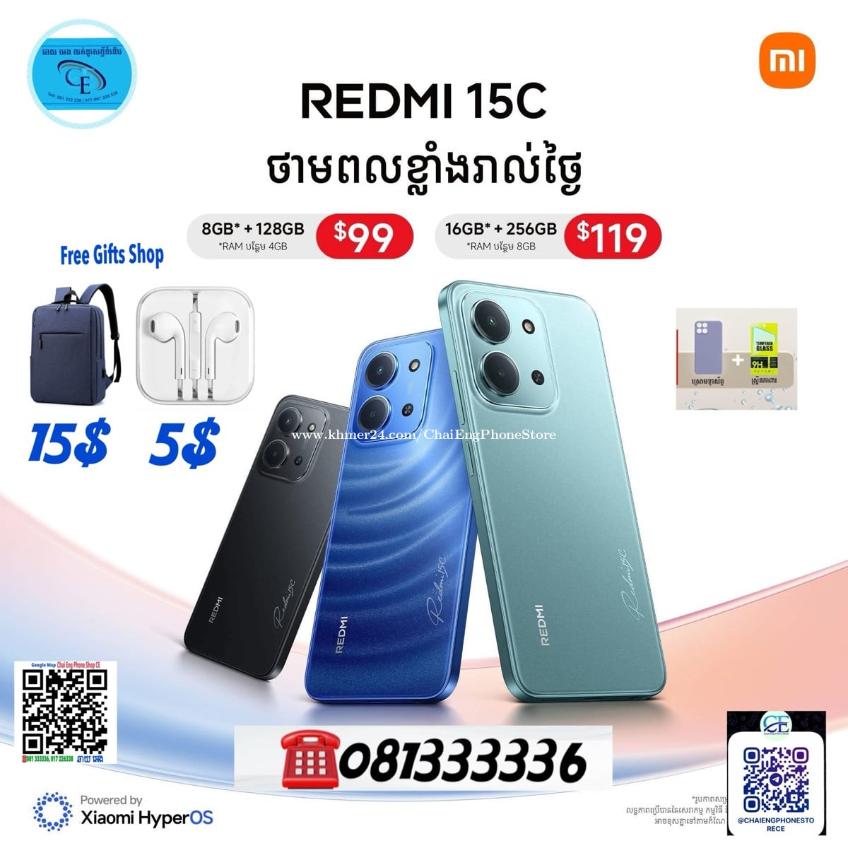 Redmi 15c Global Version ថ្មីប្រអប់មានធានាក្រុមហ៊ុន1ឆ្នាំត្រឹមត្រូវ ប្រូម៉ូសិនតម្លៃពិសេសជូន 👉 Ram4G+4G/128GB តម្លៃ 99$ ចុះសល់ 90$ 👉 Ram8G+8G/256GB តម្លៃ 119$ ចុះសល់ 109$ 👉 ថែមជូនស្រោម និង ស្គ្រីន 👉 ទិញក៏បាន | បង់រំលស់ក៏បាន | ប្រើVISA Cardក៏បាន 👉 មានសេវាកម្មដឹកជញ្ជូនដល់កន្លែងនិងផ្ញើរជូន25ខេត្តក្រុង សំរាប់ពត័មានបន្ថែមសូមទាក់ទងមកកាន់លេខទូរសព្ទ័ ☎️ 081333xxxClick To Call, 0762333xxxClick To Call, 017226xxxClick To Call, 067226xxxClick To Call 👉 Telegram Shop:☎️ 081333xxxClick To Call https://t.me/CE_PhoneShop តម្លៃពិសេសល្អមាននៅទីនេះ 🗳 សូមចុចលីង Channel Telegram : https://t.me/ChaiEngPhoneStoreCE ✅ Group Telegram: https://t.me/joinchat/LVrUvnFniQpkODBl 📍https://goo.gl/maps/KjDyGuoDN4dMjiah9 📍អាស័យដ្ឋាន ផ្ទះលេខ68BE0 ផ្លូវ215 នេរុហ៍ សង្កាត់វាលវង់ ខណ្ឌ័7មករា រាជធានីភ្នំពេញ។ នៅខាងជើងផ្សារដេប៉ូប្រហែល 500ម៉ែត្រ #ChaiEngPhoneShop #CE #ChaiEngPhoneStore2
