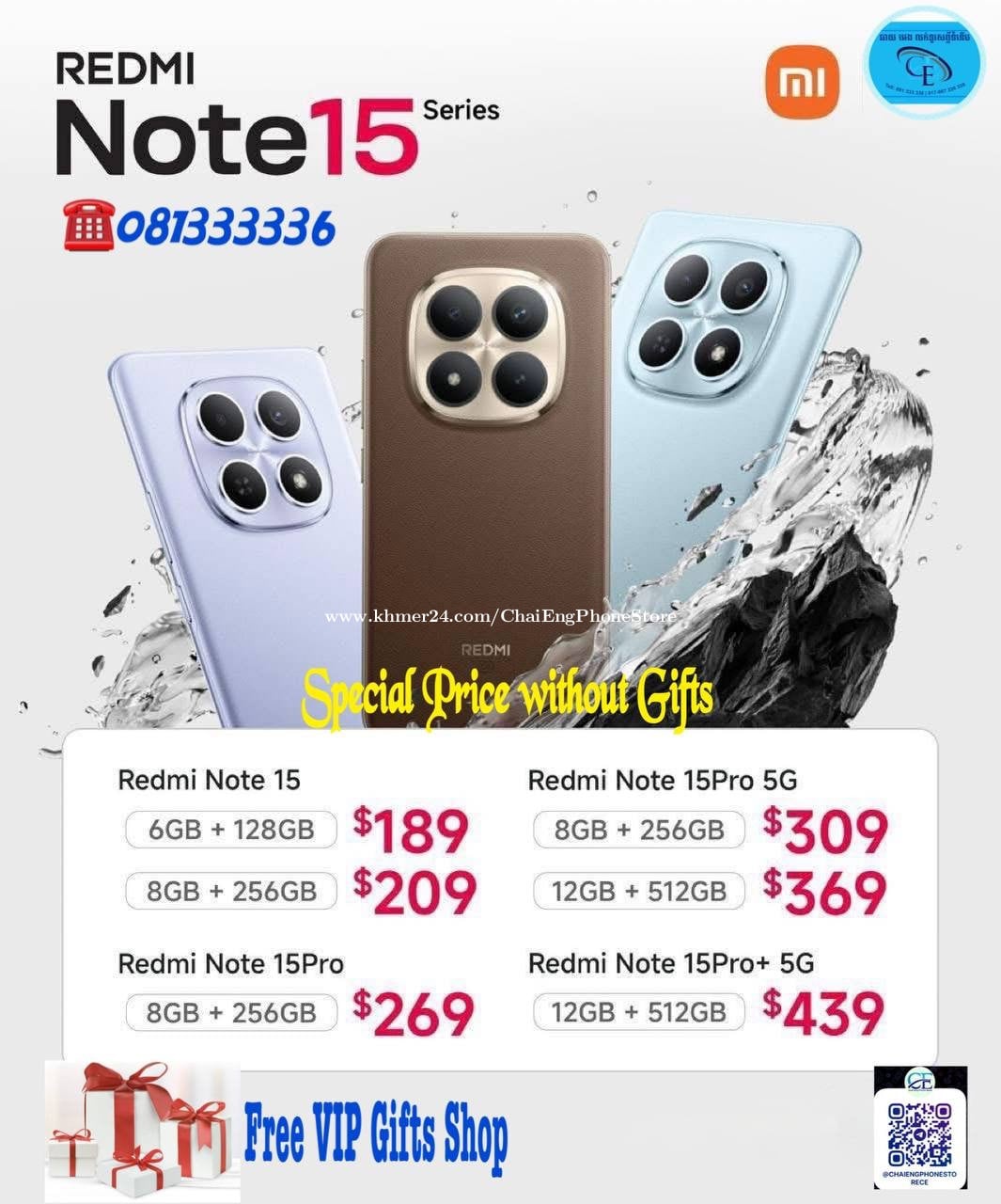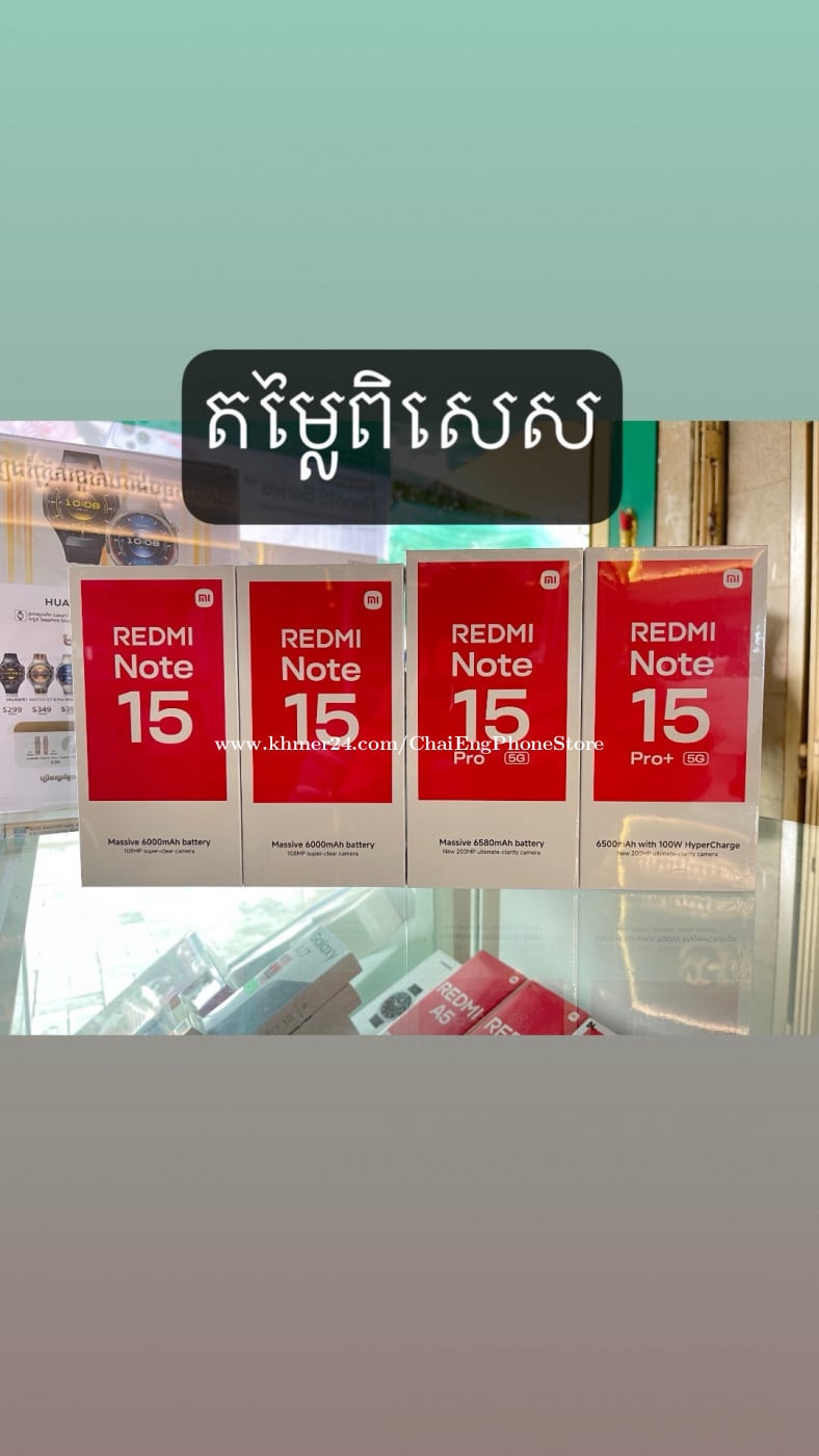 Redmi Note 15 Series5G មកដល់ហើយ ផ្តល់ជូនតម្លៃពិសេសណាស់✅ 🔥 Redmi Note15 Ram6G/128GB តម្លៃ 189$ ចុះសល់តែ 170$✅ 🔥 Redmi Note15 Ram8G/256GB តម្លៃ 209$ ចុះសល់តែ 190$✅ 🔥 Redmi Note15 Pro5G Ram8G/256GB តម្លៃ 309$ ចុះសល់តែ 285$ 🔥 Redmi Note15 Pro5G Ram12G/512GB តម្លៃ 369$ ចុះសល់តែ 345$ 🔥 Redmi Note15 Pro+ Ram12G/512GB តម្លៃ 439$ ចុះសល់តែ 415$ 🔥 ទិញអីឡូវនេះហាងយើងនឹងផ្តល់ជូនតម្លៃពិសេស VIP🌟 🔥 បើអត់យកការដូថែមទេចុះតម្លៃពិសេសជូនអោយវិញ✅ 📥 ដើម្បីសាកសួរតម្លៃពិសេស! សូមចូលកាន់Telegram Link: https://t.me/CE_PhoneShop តម្លៃល្អជូន✅ ☎️ 081 333336, 076 2333336, 017 226338, 067 226338 ✅ Group Telegram: https://t.me/joinchat/LVrUvnFniQpkODBl 🗳 ចុចលីងនេះចូល Channel Telegram: https://t.me/ChaiEngPhoneStoreCE 📍អាស័យដ្ឋាន ផ្ទះលេខ68BE0 ផ្លូវ215 នេរុហ៍ សង្កាត់វាលវង់ ខណ្ឌ័7មករា រាជធានីភ្នំពេញ។ នៅខាងជើងផ្សារដេប៉ូប្រហែល 500ម៉ែត្រ 📍https://goo.gl/maps/KjDyGuoDN4dMjiah9 🚚🛵មានសេវាដឹកជញ្ជូនទាំងប្រទេស