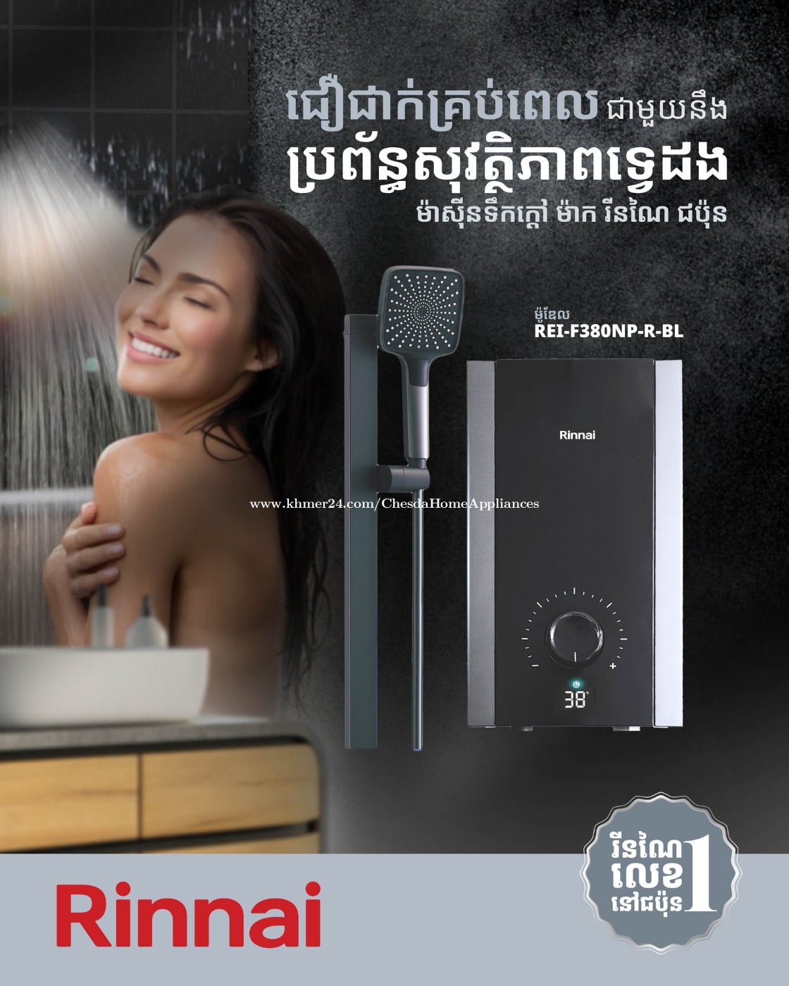 Rinnai Japan No.1 Brand. Code: REI-F380NP-BL ម៉ាស៊ីនទឹកក្តៅឌីជីថល 3.8KW អត់ម៉ូទ័ររុញសម្ពាធ ប្រើថាច់ (Touch)