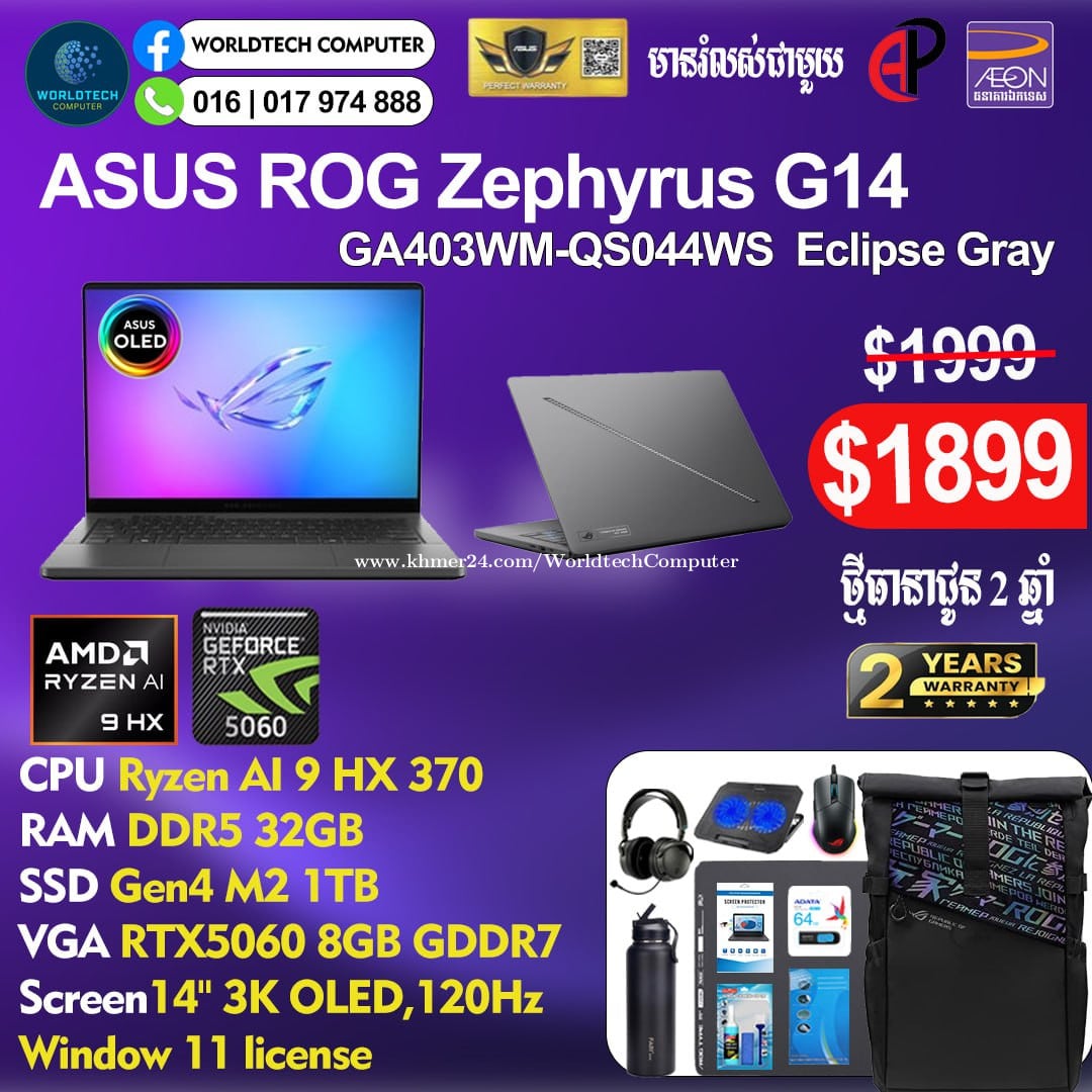 ថ្មីកេស100% ធានាជូន២ឆ្នាំ 1149$ និងមានច្រើនជុំរើសសំរាប់បងៗ ជ្រើសរើសតាមតំរូវការ Asus ROG G16, Warranty 02Years (Perfect Warranty 1Year) i7-14650HX 16G| M2 1TB | RTX5050 8G FHD+16" 165Hz New2025=1399$ i7-14650HX 16G| M2 1TB | RTX5060 8G FHD+16" 165Hz New2025=1499$ Asus ROG G18 , Warranty 02Years (Perfect Warranty 1Year) i7-13650HX 16G| M2 1TB | RTX4060 8G FHD+16" 165Hz New2025=1299$ i7-13650HX 16G| M2 1TB | RTX4060 8G 2K+18" 240Hz New2025=1399$ Telegram: 017974xxxClick To Call , 011777xxxClick To Call ទីតាំងហាង: ផ្ទះ39Eo ផ្លូវ257 ទឹកល្អក់3 ទួលគោក ភ្នំពេញ (ខាងលិចស្តុបទេពផនប្រហែល 300ម)។ Location: #39E0 St257, Tuol Kouk , Tuek L'ak Bei , Phnom Penh
