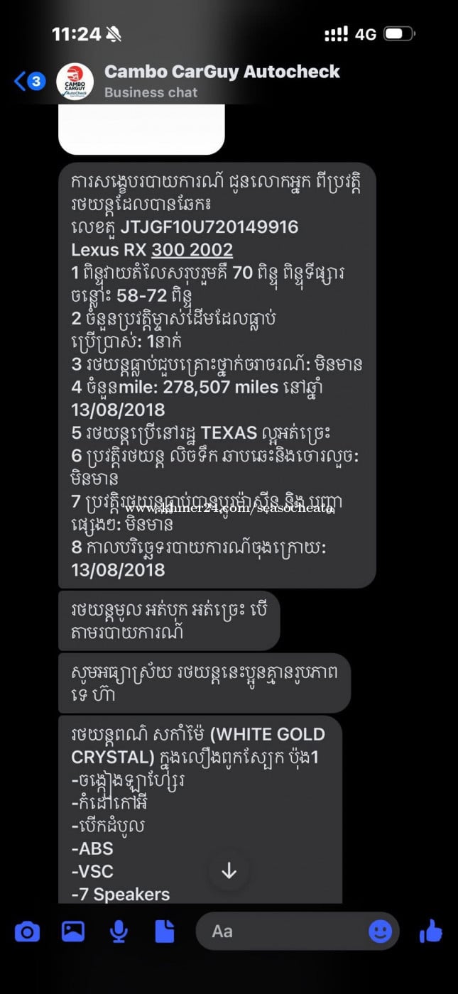 Rx300 2002 សកាំម៉ៃ ប៉ុង1 ក្នុងលឿង ធានាទឹកថ្នាំហ្សីន1ជុំ🥇 ☎️: 098488xxxClick To Call 068488xxxClick To Call 014488xxxClick To Call Telegram: https://t.me/henghtauto8888 📍ផ្ទះលេខ7 ABE0ផ្លូវ 162 សង្កាត់ផ្សារដេប៉ូ1 ខណ្ឌទួលគោក ភ្នំពេញ 🗺Map : https://maps.app.goo.gl/91nbhgt4jsMKrnxK9?g_st=