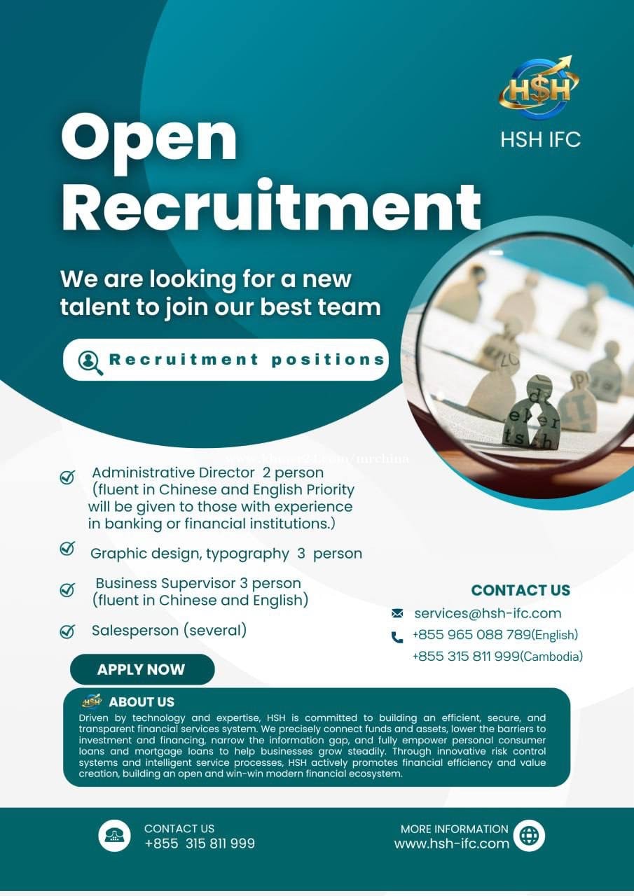 អ្នកប្រឹក្សាយោបល់ផ្នែកទីផ្សារ (ប្រហែល 30 មុខតំណែង) អ្នកដែលឧស្សាហ៍ព្យាយាម លះបង់ មានចំណង់ចំណូលចិត្តលើការលក់ និងមានបំណងប្រាថ្នាយ៉ាងខ្លាំងក្នុងការរកប្រាក់ និងផ្លាស់ប្តូរជីវិតរបស់ពួកគេតាមរយៈការលក់ គឺជាការពេញចិត្ត។ អាយុ៖ 17-45 ឆ្នាំ មិនកំណត់ភេទ។ តម្រូវការភាសា៖ យ៉ាងហោចណាស់ភាសាអង់គ្លេស និងខ្មែរ (ភាសាអង់គ្លេសត្រូវតែមានកម្រិតភាសាអង់គ្លេសអាជីវកម្មយ៉ាងហោចណាស់) ជំនាញភាសាចិនគឺជាការបូកបន្ថែម។ ប្រាក់ខែ៖ 250-300 ដុល្លារអាមេរិក/ខែ + កម្រៃជើងសារផ្ទាល់ខ្លួន + ប្រាក់រង្វាន់លើការអនុវត្ត + អត្ថប្រយោជន៍។ អ្នកត្រួតពិនិត្យអាជីវកម្ម៖ ៥០០ ដុល្លារ-៨០០ ដុល្លារ; ជំនួយការអ្នកគ្រប់គ្រងទូទៅ៖ ១.៥០០ ដុល្លារអាមេរិក - ២.៥០០ ដុល្លារអាមេរិក ការបកប្រែភាសាអង់គ្លេស-ចិន៖ ១០០០-១៥០០ ដុល្លារអាមេរិក ព័ត៌មានទំនាក់ទំនង៖ ០៩៦៥០៨៨៧៨៩ 0965088xxxClick To Call