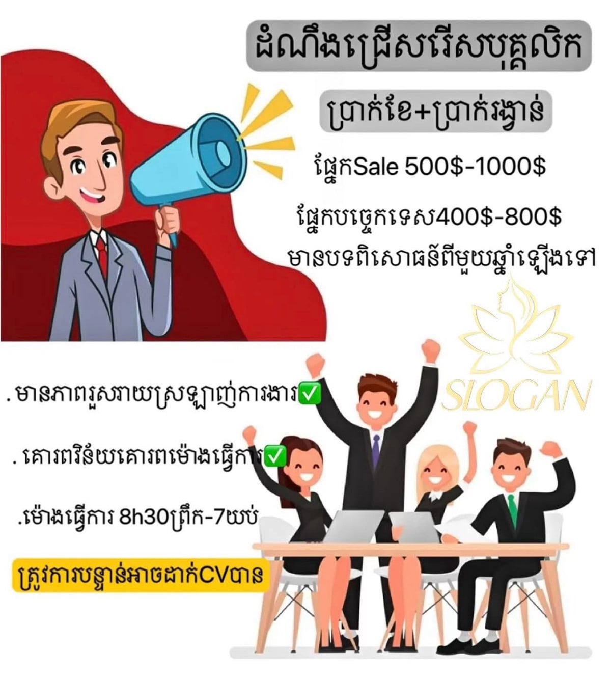 ឪកាសការងារពិសេស នៅហាង #Slogan កំពុងជ្រើសរើសបុគ្គលិក ✅ផ្នែក Sale ចំនួន2នាក់(ភេទស្រី)បន្ទាន់ ✅ផ្នែកបច្ចេកទេស2នាក់(ភេទស្រី)បន្ទាន់ 📌 POSITIONS - ប្រាក់ខែចាប់ពី 250$-1000$ - ប្រាក់រង្វាន់ប្រចាំខែ និង ភាគរយ - មួយខែសម្រាកបានចំនួន 4ថ្ងៃ - ម៉ោងធ្វើការចាប់ពីម៉ោង 8:30am-7:00am 📌 លក្ខខណ្ឌបុគ្គលិក - មានបទពិសោធន៍ខាងស្ប៉ាចាប់ពីមួយឆ្នាំឡើងទៅ - មានការតស៊ូអត់ធ្មត់នឹងមានទំនួសខុសត្រូវ - រូបសម្បត្តិសមរម្យនិងមានភាពរស់រាយ 📩 ឆាត ក្នុងប្រអប់សារ ឬតាមលេខតេឡេក្រាមដាក់ខាងក្រោម093575xxxClick To Call