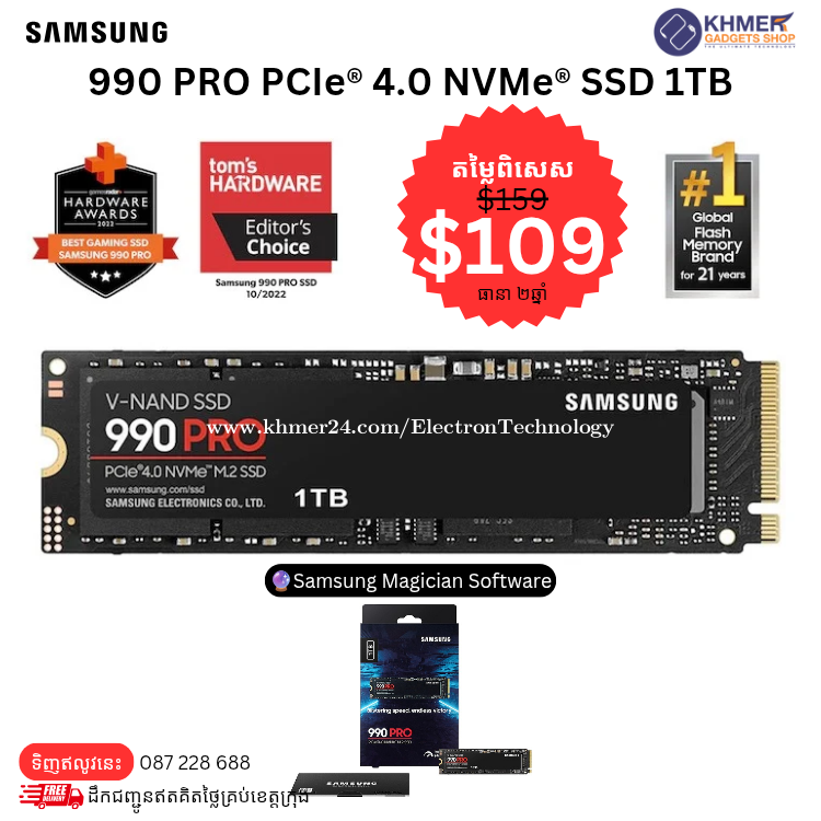 Samsung 990 PRO SSD 1TB PCIe 4.0 M.2 2280 Internal Solid State Hard Drive, Seq. Read Speeds Up to 7,450 MB/s for High End Computing, Gaming, and Heavy Duty Workstations, MZ-V9P1T0B/AM โ Original ๐ฏ% from Samsung Company โ Warranty 2 Years โ Authentication Samsung Magician Software โ Made in Korea โ New in Sealed Box โ Free Delivery ๐ โ แแถแแถแแแแแแ 2แแแแถแแแแ(แแผแ แแผแแแแแธแแผแแแแแถแ) โ แแแแธแแแแปแแแแแขแแ (แแถแแถแแแทแแแแแปแแแ100%) โ แแแทแแแ แแแแแแแแผแแแ โ แแถแแแแแแแแแแถแแแแแแทแแแปแแแแแถแ (Samsung Magician) โ แแนแแแแแแผแแฅแแแทแแแแแ ๐ฅแแแแแแแแถแ https://t.me/KhmerGadgetsSHOP ๐แแแแแถแแแแแแแแถแแแแแขแทแแแถแแแแแแแแแแแผแแแแแ 015727xxxClick To Call โ HUGE SPEED BOOST: Get random read/write speeds that are 40%/55% faster than 980 PRO; Experience up to 1400K/1550K IOPS, while sequential read/write speeds up to 7,450/6,900 MB/s reach near the max performance of PCIe 4.0* โ BREAKTHROUGH POWER EFFICIENCY: Use less power and get more performance; Enjoy up to 50% improved performance per watt over 980 PRO, plus optimal power efficiency with max PCIe 4.0 performance** โ SMART THERMAL CONTROL: Samsung's own nickel-coated controller delivers effective thermal control; With its slim size, 990 PRO is a perfect fit for desktops and laptops that meet the PCI-SIG D8 standard*** โ THE CHAMPION MAKER: Up to 65% improvement in random performance enables faster loads for an ultimate gaming experience on PS5 and DirectStorage PC games**** โ SAMSUNG MAGICIAN SOFTWARE: Get the most out of your SSD with Samsung Magician's advanced yet intuitive optimization tools; Monitor drive health, protect valuable data, and receive important updates for your 990 PRO
