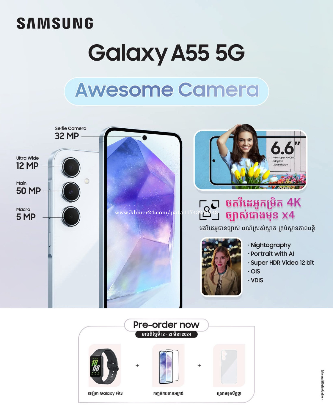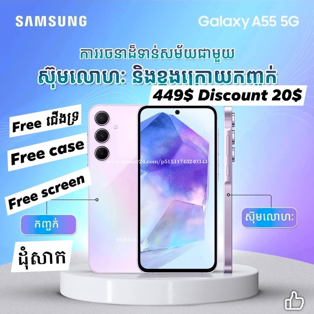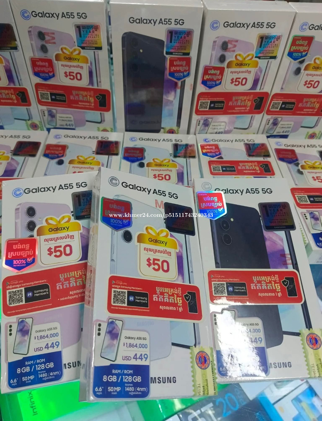 ● Galaxy A55 5G 💥▪︎Ram 8GB 💥▪︎ROM 256GB ▪︎អេក្រង់ 6.6" Inches Super AMOLED ▪︎Refresh Rate 120Hz,HDR10+,1000 nits (HBM) ▪︎ប្រើបន្ទះឈីប Exynos 1480 (4nm) ▪︎មានការពារជំរាបទឹក (IP67) ▪︎ប្រើស៊ីម 2(Nano-SIM) ▪︎អាចថែម MicroSDCard (uses shared SIM slot) ▪︎កាមេរ៉ាក្រោយ 50MP,f/1.8,(wide)+ 12MP + 5MP ▪︎កាមេរ៉ាមុខ 32MP ,f/2.2,26mm (wide) ▪︎USB Type-C 2.0,OTG ▪︎ថាមពលថ្ម 5000mAh ▪︎Fast charging 25W ▪︎ស្កេនក្រយៅដៃលើអេក្រង់ (under display,optical) 🛵មានសេវាដឹក ជញ្ចូន 25ខេត្ត នឹង រាជធានី 💬Telegram ខាងក្រោម t.me/Neth99097 Tel Cellcard 011599xxxClick To Call , 077675xxxClick To Call Smart 087675xxxClick To Call