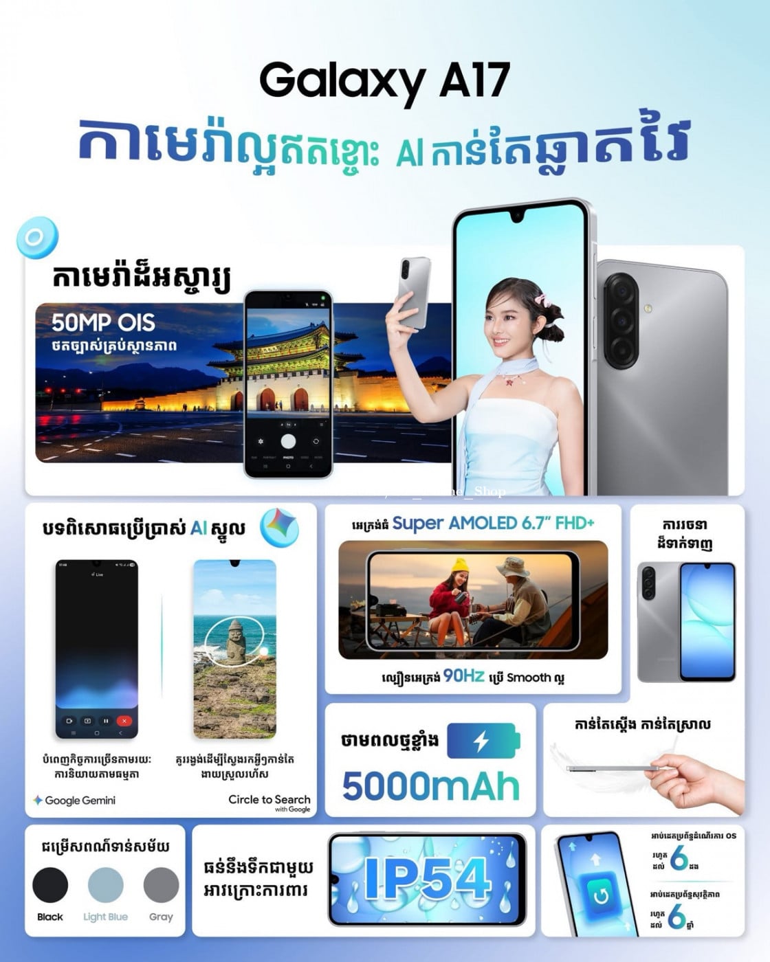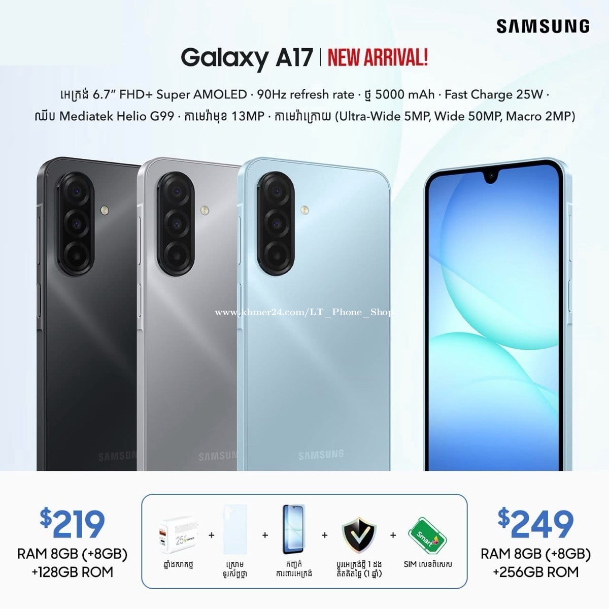 📣 Galaxy A17 កាមេរ៉ាល្អឥតខ្ចោះ, AI កាន់តែឆ្លាតវៃ, ស្វែងរកអ្វីៗកាន់តែងាយ ✨ ✨ 8GB/128GB តំលៃពេញ 219$ បញ្ចុះតំលៃនៅសល់ត្រឹមតែ 198$ ✨ 8GB/256GB តំលៃពេញ 249$ បញ្ចុះតំលៃនៅសល់ត្រឹមតែ 224$ #GalaxyA17 មកជាមួយមុខងារពិសេសៗដូចជា 👇 👍 📷 កាមេរ៉ាក្រោយ បីគ្រាប់ 50MP+5MP+2MP និងកាមេរ៉ាមុខ 13MP 👍 បំពាក់ដោយមុខងារ AI ✨ , Google Gemini និង Circle to Search 👍 អេក្រង់ធំ 6.7” FHD+ Super AMOLED, Refresh Rate 90Hz 🏎️ 👍 ទំហំផ្ទុក RAM 8GB / ROM 128GB ឬ 256GB អាចថែមមេម៉ូរីកាតបានរហូតដល់ 2TB 👍 ទំហំថ្ម 5,000mAh 🔋 👍 ការពារជម្រាបទឹកកម្រិត IP54 💦 👍 ដំណើរការដោយ One UI7 និងមានប្រព័ន្ធការពារសុវត្ថិភាពដោយ Knox Security 🛡️ 🔴 អាប់ដេត OS បាន 6 ដង និងអាប់ដេតប្រព័ន្ធសុវត្ថិភាពបាន 6 ឆ្នាំ 💪 📌 លោកអ្នកអាចស្វែងរកទិញបាននៅតាមបណ្តាហាងលក់ទូរស័ព្ទទូទាំងប្រទេសជាមួយនឹងការផ្តល់ជូនដូចជា៖ 🎁 ថែមជូនឆ្នាំងសាកល្បឿនលឿន 25W 🎁 កញ្ចក់ការពារអេក្រង់ 🎁 ស្រោមទូរស័ព្ទថ្លា 🎁 ការធានាលើអេក្រង់ពេញមួយឆ្នាំ* 🎁 ស៊ីមកាតលេខពិសេសមួយពីស្មាត 🏡 ហាងលក់ទូរស័ព្ទដៃទំនើប អិលធី 📲 ទំនាក់ទំនងលេខទូរស័ព្ទ: 016711xxxClick To Call (Telegram) / 099333xxxClick To Call / 0888884xxxClick To Call 📩 Telegram: https://t.me/LTPhoneShop 📬 Facebook Page: https://www.facebook.com/share/165XEwR2ZA/?mibextid=wwXIfr 🗺️ ផ្ទះលេខ139c, ផ្លូវលេខ143 កែងផ្លូវលេខ376, សង្កាត់បឹងកេងកង3, ខណ្ឌបឹងកេងកង, រាជធានីភ្នំពេញ 📍Google map: https://maps.app.goo.gl/phENGCSAT33SaM9r7?g_st=com.google.maps.preview.copy 🛵 មានសេវាដឹកជញ្ជូនគ្រប់ខេត្តក្រុងរាជធានី