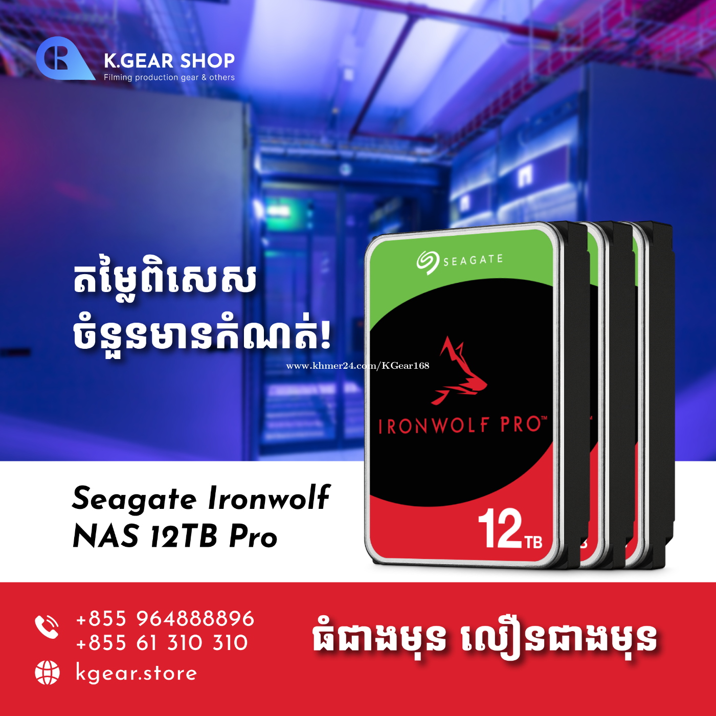 Recommend for Media Production and Network Attached Storage (NAS) Seagate 12TB IronWolf Pro 7200 rpm SATA III 3.5" Internal NAS HDD (CMR) ការធានារហូតដល់១ឆ្នាំពេញ!! Price: $385 contact us: 061310xxxClick To Call Telegram: t.me/Kgear_66 Specification: 12TB Storage Capacity SATA III 6 Gb/s Interface 3.5" Form Factor 256MB Cache 7200 rpm Up to 250 MB/s Data Transfer Rate Designed to deliver performance, reliability, and dependability in multi-bay, multi-user RAID and NAS environments within commercial and enterprise settings, the 12TB IronWolf Pro 7200 rpm SATA III 3.5" Internal NAS HDD from Seagate is built to withstand 24/7 operation, or 8760 hours per year. This 12TB drive has been equipped