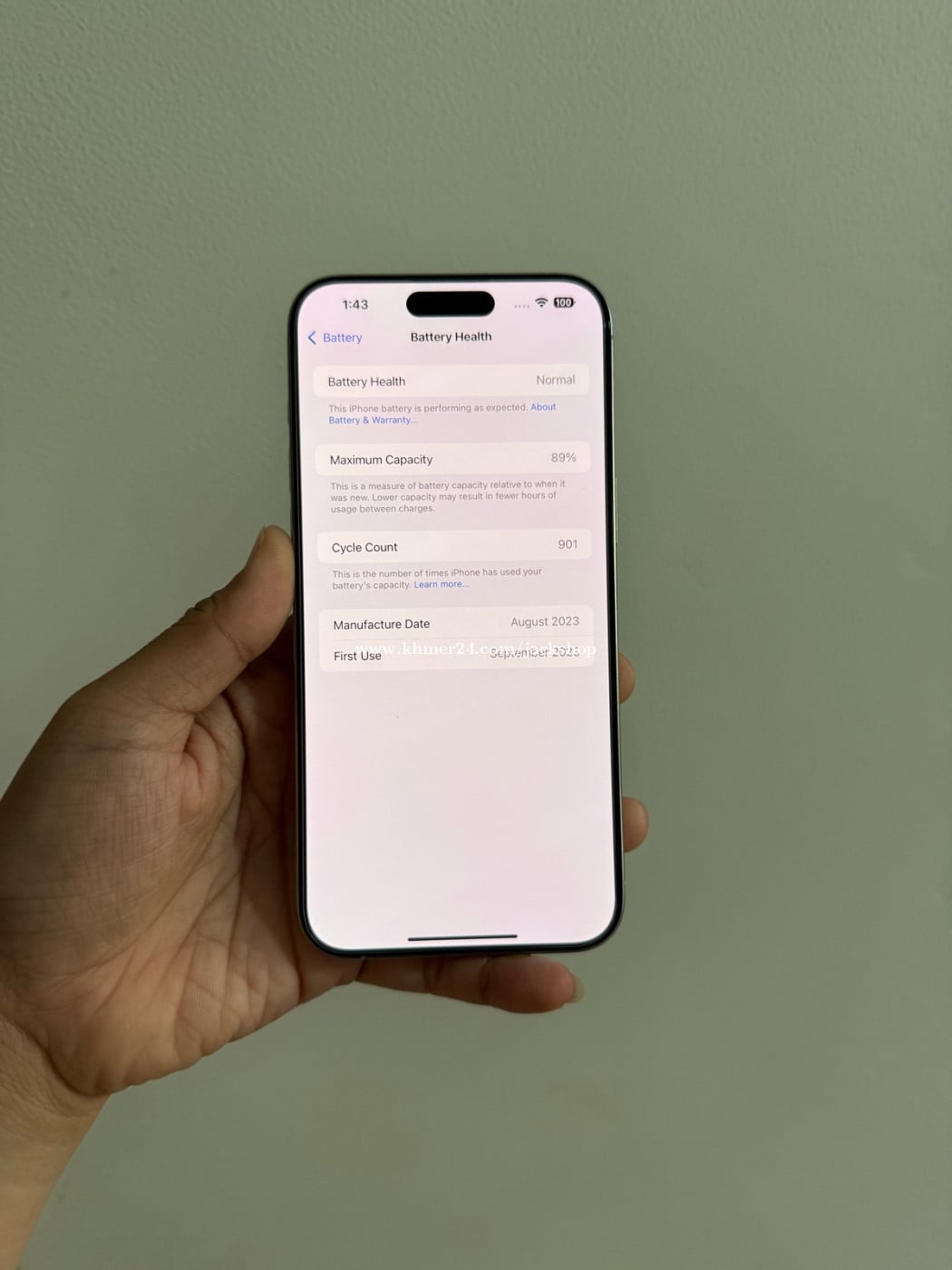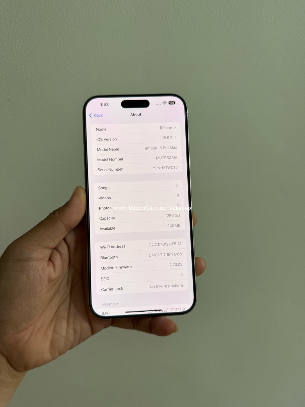 iPhone 15pro max 256g Za Sim2 Scan 98.9% ធានាទូរស័ព្ទនឹងម៉ាសុីនសុំនុំហ្សុីនណែន100% Freeផ្លុំ មិនដែរដោះមិនដែរជួសជុល ថ្មកាន់ កាំមេរ៉ាច្បាស់មុខក្រោយ ធានាលើការប្រើប្រាស់15ថ្ងៃ(only phone)0969000xxxClick To Call telegram