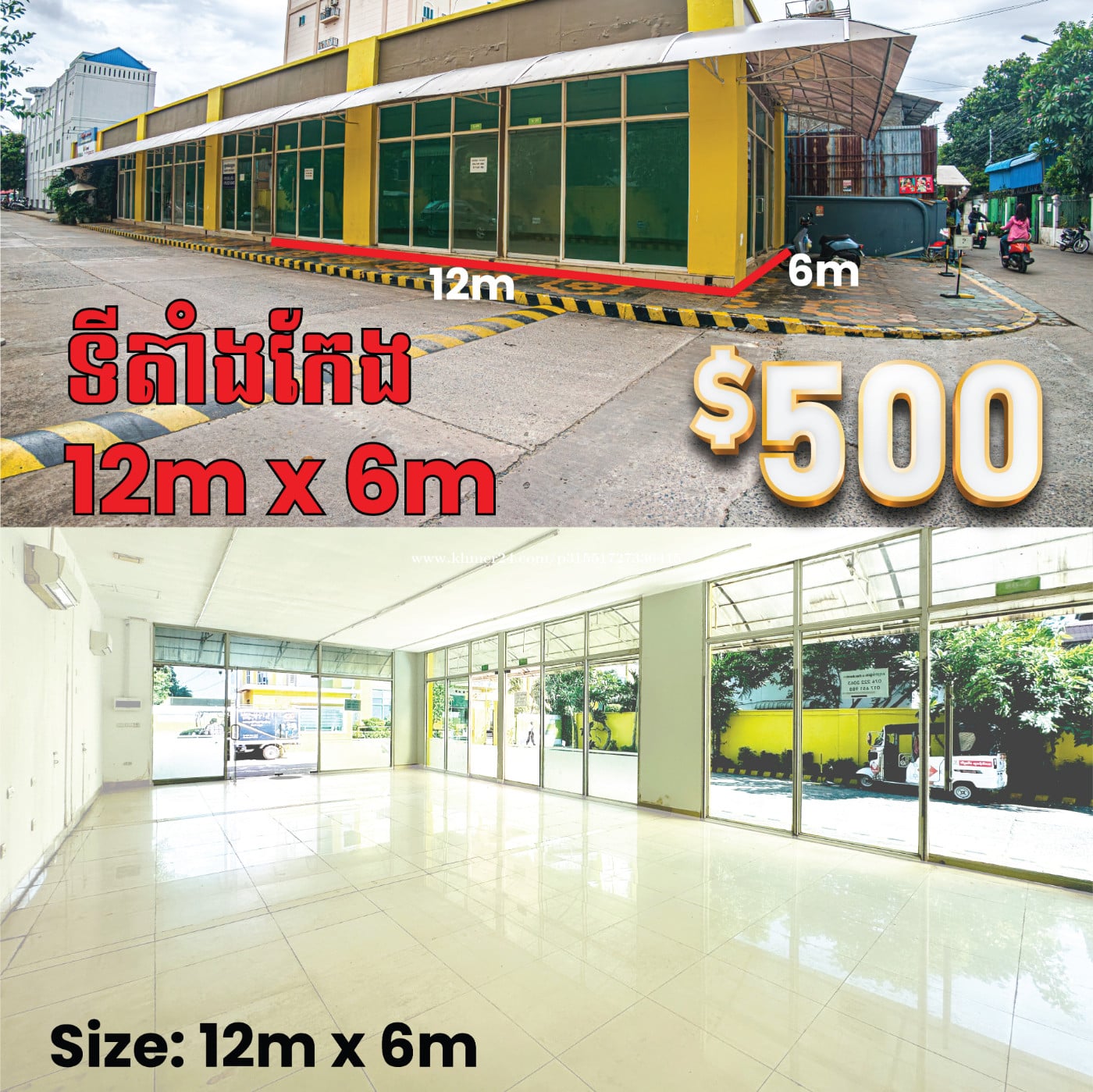 ទីតាំងជួល ✅ ទំហំ: 4m x 6m (ទីតាំងមួយប្រឡោះ) ✅តម្លៃ$230/ខែ ✅សេវាគ្រប់គ្រង១ហាងតូច $10/ខែ សម្រាប់ទីតាំងកែង ទំហំ 12m x 6m ✅ តម្លៃជួល $500/ខែ ✅បូកសេវាគ្រប់គ្រង $30/ខែ ✅បញ្ជាក់បន្ទប់ទឹកប្រើរួម។ ក្នុងទីតាំងនីមួយៗអត់មានបន្ទប់ទឹកទេ។ 📌ទីតាំង៖ https://maps.app.goo.gl/tK4pqaE8c9kHE7MW7 📞ទំនាក់ទំង៖ 078333xxxClick To Call