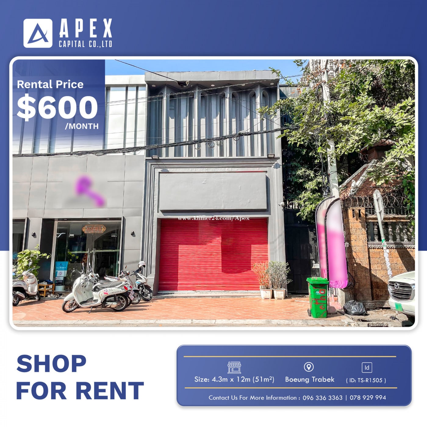 ๐ Price: $600/month ๐ LOCATION: Boeung Trabek โข Property ID: TS-R1505 - Size: 4.3m x 12m (51mยฒ) - Bathroom: 01 - Parking Space