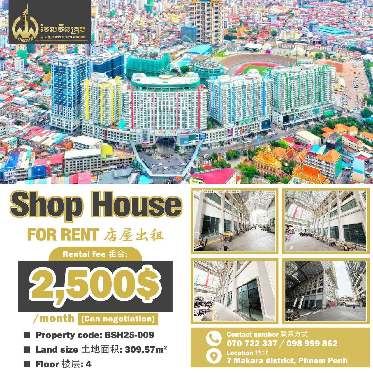 Shop house for rent 店屋出租 Property code: BSH25-009 Rental fee租金: 2,500$/month (Can negotiation) Land size 土地面积: 309.57m² Floor 楼层: 4 Location 地址: 7 Makara district, Phnom Penh Contact number 联系方式: 070722xxxClick To Call / 098999xxxClick To Call