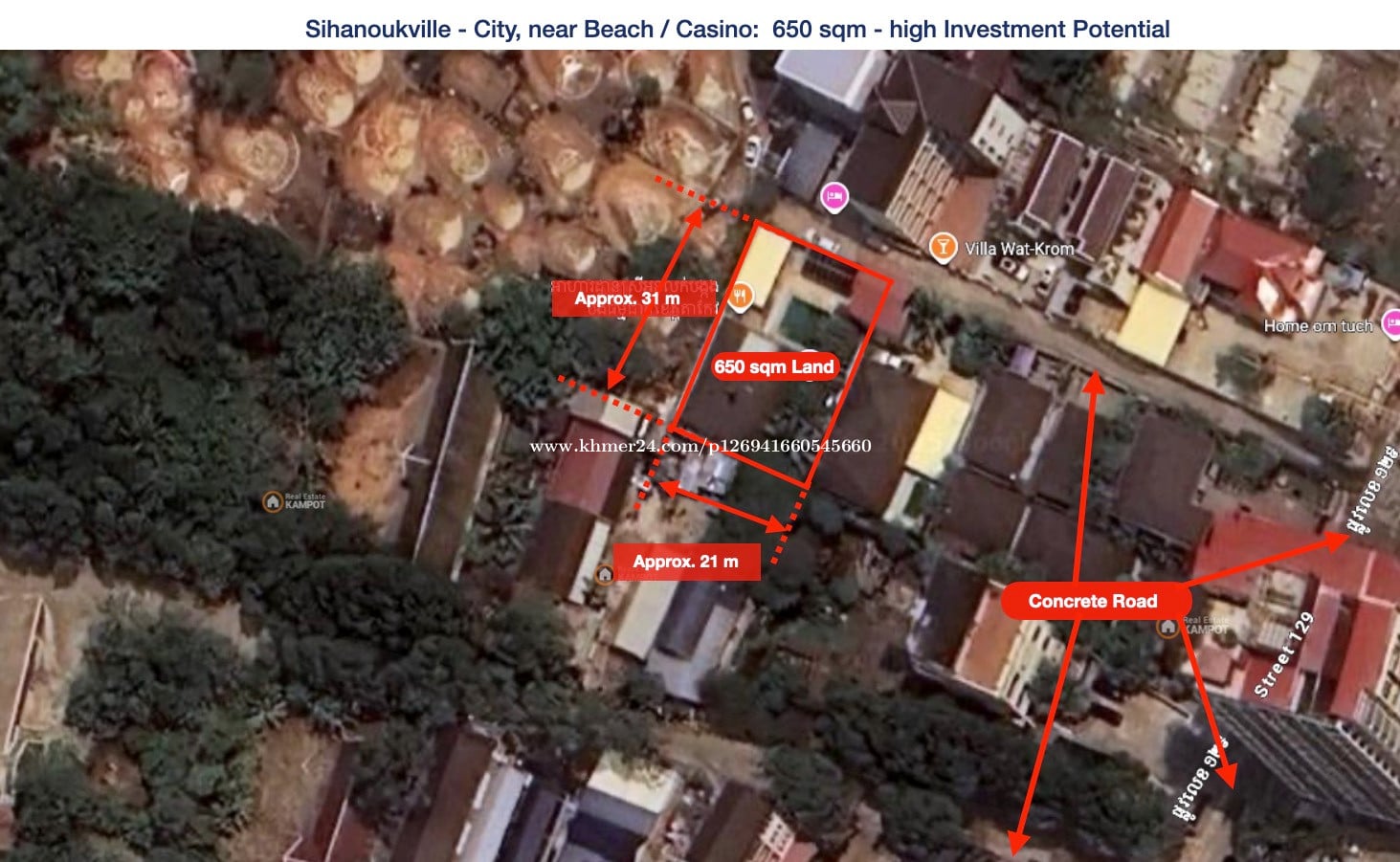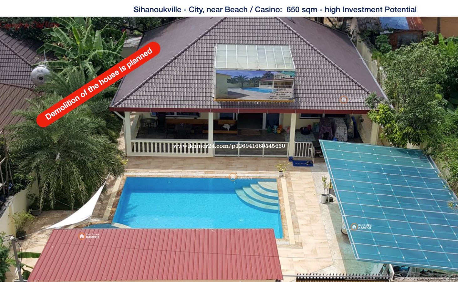 Perfect real estate (land) at a favorite area, very closed to the Beach, Casinos, a high growing tourist place for a House, Hotel or Guesthouse. The land is connected to a concrete road and has a strong cambodian hard title for your safety buying process and ownership. Currently at the land is a western style house with pool, before selling this object, the seller want to be demolition the house. Phone: 0978312xxxClick To Call Telegram: https://t.me/RealEstateKampot