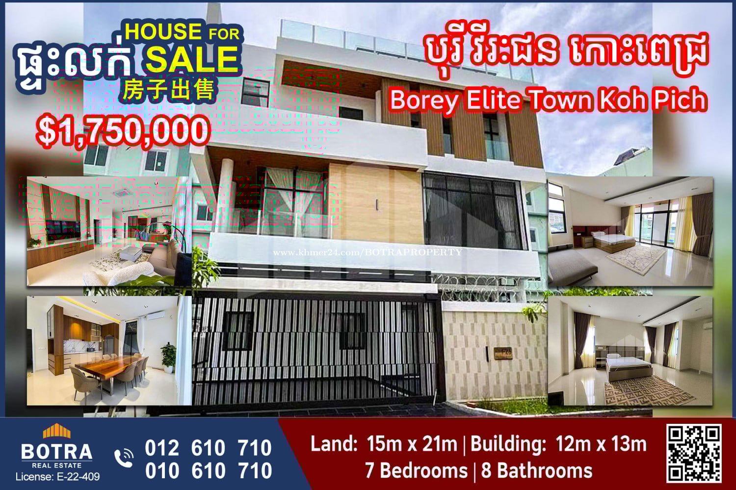 Single Villa for Sale ๐ก ๐ Borey Elite Town Koh Pich โข Price: $1,750,000 Negotiable โข Land Size: 15m x 21m โข House Size: 12m x 13m โข Bedrooms: 7 / Bathrooms: 8 โข Transfer of Title Deed โข Facing South โโโโโโโโโ Contact us now ๐ 012610xxxClick To Call (Cellcard) ๐ 010610xxxClick To Call (Smart) โถ๏ธ t.me/BotraRealEstate (Chat)
