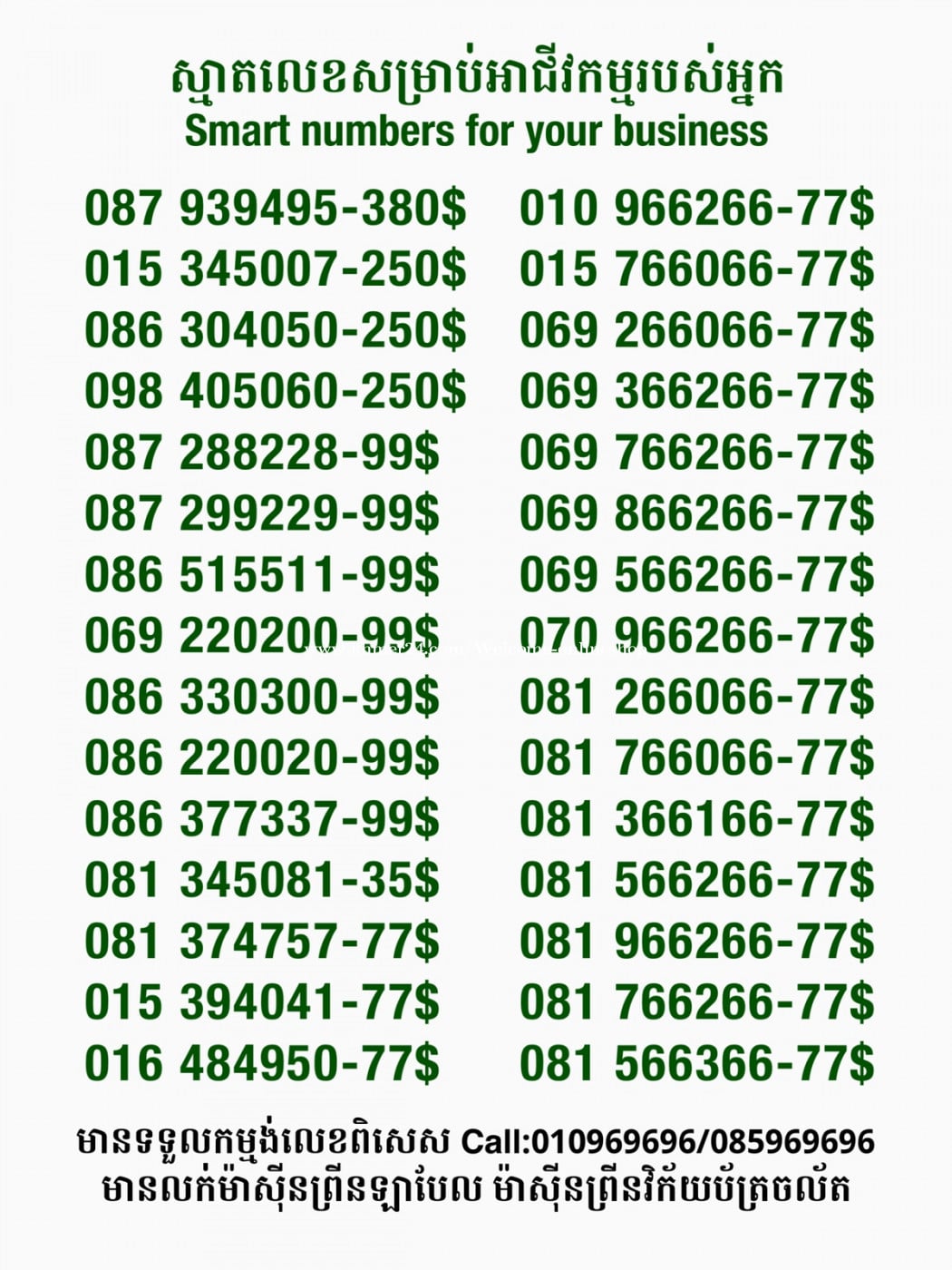 មានលក់លេខពិសេស មានទទួលកម្មង់លេខពិសេស មានលក់ម៉ាស៊ីនព្រីនឡាបែល មានលក់ម៉ាស៊ីនព្រីនវិក័យប័ត្រ មានលក់សម្ភារៈប្រើប្រាស់ក្នុងគ្រួសារ Smart Prime II 1=30$ Smart hero 1=40$ ទូរសព្ទថ្មីក្នុងប្រអប់ លក់ធូរៗរហូតអស់ពីស្តុក អាចប្រើជាឧបករណ៍សម្រាប់ស៊ែរ wifi បាន ទំនាក់ទំនង(ខ្មែរ | English | 中文):010969696 | 085969696 Telegram: https://t.me/W9696 Telegram group: https://t.me/konkonnada អាសយដ្ឋាន:ផ្ទះលេខ២៣ ផ្លូវបេតុងលេខ១ ភូមិទួលពង្រ សង្កាត់ចោមចៅ ខណ្ឌពោធិ៍សែនជ័យ រាជធានីភ្នំពេញ ទីតាំង https://goo.gl/maps/8moqW4iTHUfJEvWQ9 ដើម្បីស្វែងរកលេខអាជីវកម្មដែលលោកអ្នកពេញចិត្ត សូមចូលទៅកាន់:https://www.khmer24.com/Welcome-onlineshop