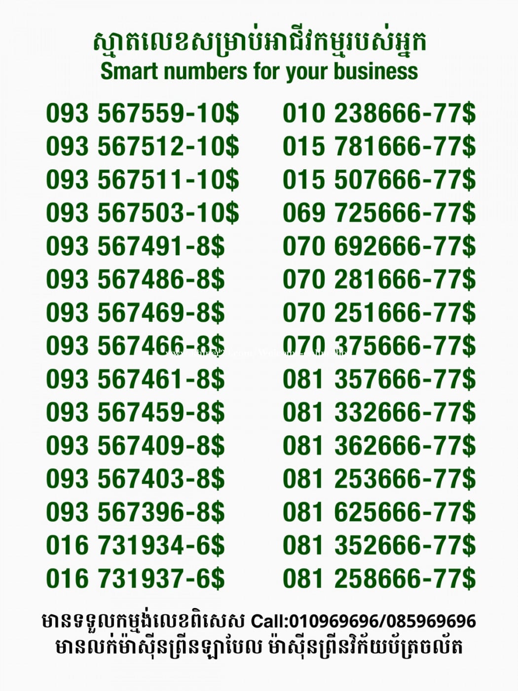 មានលក់លេខពិសេស មានទទួលកម្មង់លេខពិសេស មានលក់ម៉ាស៊ីនព្រីនឡាបែល មានលក់ម៉ាស៊ីនព្រីនវិក័យប័ត្រ មានលក់សម្ភារៈប្រើប្រាស់ក្នុងគ្រួសារ Smart Prime II 1=30$ Smart hero 1=40$ ទូរសព្ទថ្មីក្នុងប្រអប់ លក់ធូរៗរហូតអស់ពីស្តុក អាចប្រើជាឧបករណ៍សម្រាប់ស៊ែរ wifi បាន ទំនាក់ទំនង(ខ្មែរ | English | 中文):010969696 | 085969696 Telegram: https://t.me/W9696 Telegram group: https://t.me/konkonnada អាសយដ្ឋាន:ផ្ទះលេខ២៣ ផ្លូវបេតុងលេខ១ ភូមិទួលពង្រ សង្កាត់ចោមចៅ ខណ្ឌពោធិ៍សែនជ័យ រាជធានីភ្នំពេញ ទីតាំង https://goo.gl/maps/8moqW4iTHUfJEvWQ9 ដើម្បីស្វែងរកលេខអាជីវកម្មដែលលោកអ្នកពេញចិត្ត សូមចូលទៅកាន់:https://www.khmer24.com/Welcome-onlineshop