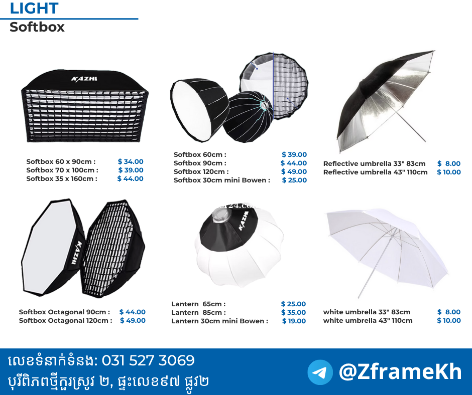 Softbox Professional Quick Set-up Deep Softbox With Grid and Bowen Mount for Studio Led Light Softbox kz-gs-60cm : 39$ Softbox kz-gs-90cm : 44$ Softbox kz-gs-120cm : 49$ Softbox kz-rgx-70-100cm : 39$ Softbox kz-rgx-35-160cm : 44$ Balloon kz-65cm-rgq : 25$ Balloon kz-85cm-rgq : 35$ មានក្នុងស្ចុកស្រាប់ អាចទាក់ទងមកបានឫ ឆាតមកផេកក៌បាន៕ ហេីយមានលក់ ដូចជា សំភារៈសម្រាប់កាមេរ៉ា កំព្យូរទ័រ មានតម្លៃសមរម្យ: លេខទំនាក់ទំនង: 012387xxxClick To Call / 2000 តេលេក្រាម : t.me/ZframeKh https://www.facebook.com/zframekh Google maps : https://g.co/kgs/ukpxkbg បុរីពិភពថ្មីកួរស្រូវ ២, ផ្ទះលេខ៩៧ ផ្លូវ២ Borey New World Kor Srov II, #97 street 2 Can delivery +24H to PNH, 24/48h in all 25 province #zframe #camera #filmmaking #filmmaker #Sony #lumix #blackmagic #nikonphotography #fujifilm #zframekh #sigma #cinema #phnompenh #Cambodia
