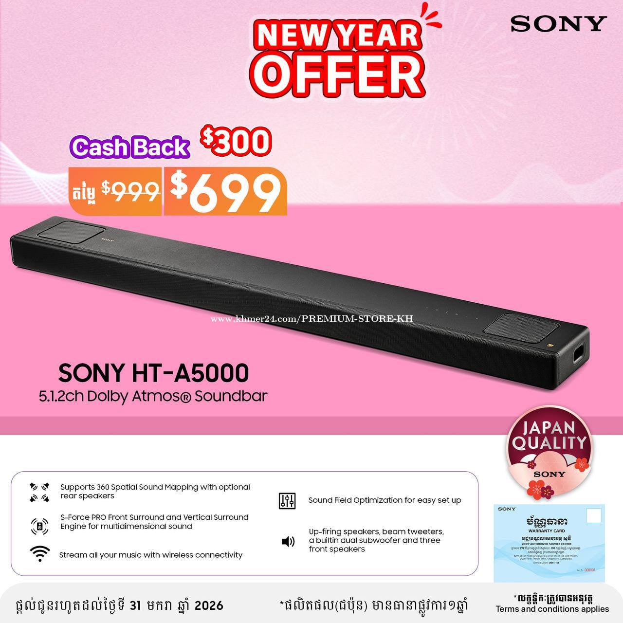 ๐น Model:SONY HT-A5000 ๐น แแแแแแแ แแ แปแแแแแแ: $699 (แแแแแแแแ $999) ๐น แแแแแแแแทแแแ:Portable Bluetooth Speaker ๐ แแแแแแแแทแแแแแแแถแแแ -5.1.2ch Dolby Atmosยฎ Soundbar แแแแแแแแแทแแแแแแแแแแแแแปแแแทแแแผแ แแถแแแถแแแแแ แแแแแถแ 5.1.2 channels แแแแแถแแแแแแแแแ แแแถแแแแปแแแทแ แแทแแแพแแแแแแแแกแพแแแธแแพแแแแถแแ -360 Spatial Sound Mapping (แแถแแฝแแแแแแธแแแแแแแแแ) แแแแแพแแแแแแแแแแแแแแปแแแทแแแทแแแถแแแขแแ แแแแขแถแ แแแแถแแแแถแแฝแ wireless rear speakers แแผแ แแถ SA-RS3S แฌ SA-RS5แ -S-Force PRO Front Surround & Vertical Surround Engine แแแแแพแแแแแแแแแปแแแทแแแผแ แแแแแทแแ แถแแแถแ แแแถแแแแแแธแแแแ แแแพแแ -Up-firing Speakers แแทแ Beam Tweeters แแแแ แแแแแแแแแกแพแแแพ แแทแแแแแแผแแแแแแแแแถแแแแแถแแ แฒแแแแถแแขแถแแแแแแแแทแแแถแแธแแแถแแแนแแแถแแแแแแ -Built-in Dual Subwoofer & Three Front Speakers แแแแแแแแแแแ Bass แแแแ แแทแแแแ แแแแแแแแแแแแแ แแแถแแแแแแแถแแแแถแแแแแถแแแแแแแแแธ แแทแแแพแแแถแแแแแแ -Sound Field Optimization แแแแพ Microphone แแแแปแแแแแฝแแแแแแถแแแแถแแแแแแแแ แแพแแแแธแแแแแแแฝแแแแแแแแฒแแแแแแแแแแนแแแแทแแถแแถแแ แแถแแแแแถแแแแถแแแแแฝแ แแทแแแถแแแแแแแแผแแแธแแธแแ แขแถแ แแแแถแแแแถแ Bluetoothยฎ, Wi-Fiยฎ, HDMI eARC, Optical แแทแ USBแ แแแแแแแแถแแฝแ Music Center App แขแถแ แแแแแแแแแ EQ, bass, แแทแ setting แแแแแแแแถแแแแแถแแ แแแผแแ แแแแถแแแแแแ 017555xxxClick To Call