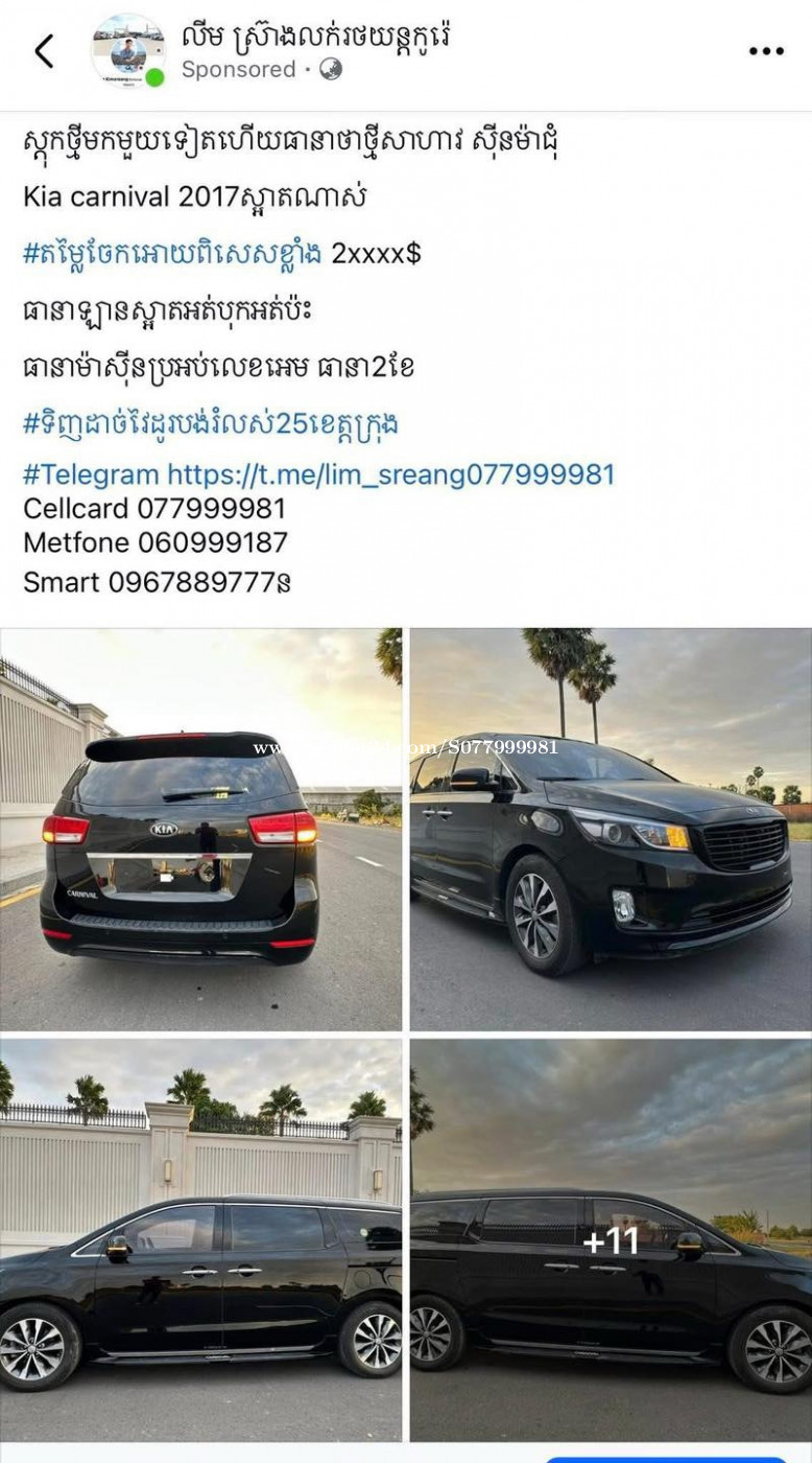 តោះបងប្អូនចូលស្តុកច្រេីនណាស់ ស្របពេលជិតឆ្លងឆ្នាំល្មម ដាក់ប្រូម៉ូសិនម៉ាពេញចិត្តជូនបងប្អូន សំរាប់ឡានStarex Carnival ទិញឥឡូវ -បញ្ចុះតំលៃអោយ1000$ភ្លាម -ថែម កង់ថ្មី4គ្រាប់ -ថែមស្លាក់លេខវែង -ប្ដូរប្រេងម៉ាសុីន ប្រេងប្រអប់លេង ថ្មី -កំរាលVIP ស្រោមចង្កូត កុំរាលតាបឡូថ្មី Cellcard 077999xxxClick To Call Smart 0967889xxxClick To Call Metfone 060999xxxClick To Call តេលេក្រាម https://t.me/lim_sreang077999xxxClick To Call