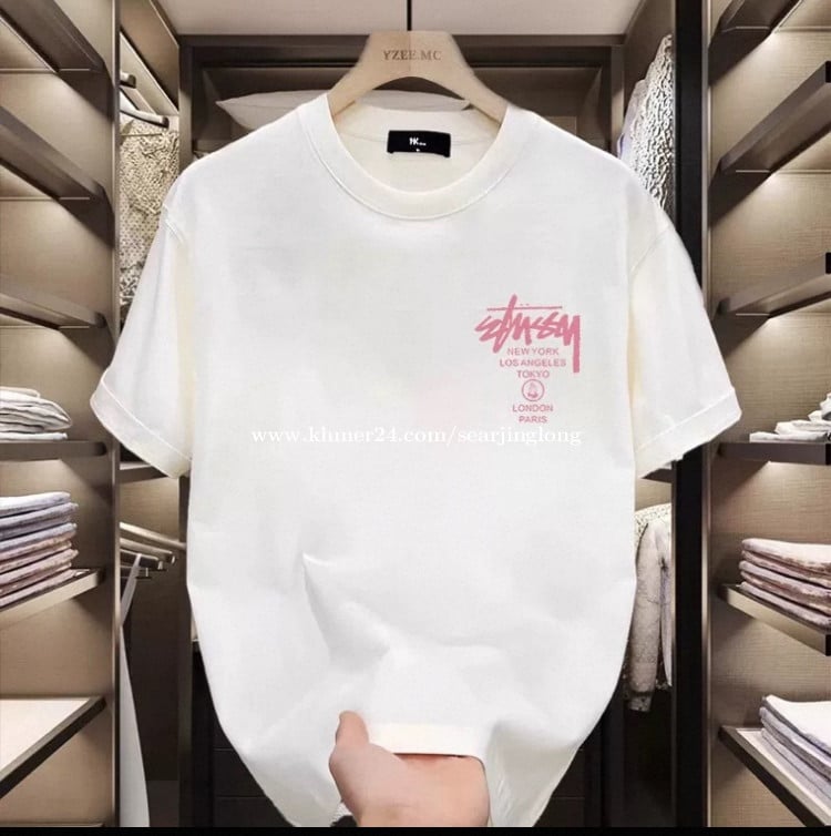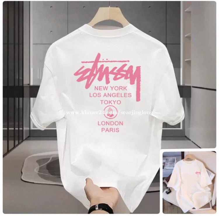 Comfortable white tee featuring the bold pink STUSSY script logo and a list of global cities (New York, LA, Tokyo) on the back. Perfect unisex fit for effortless street style.