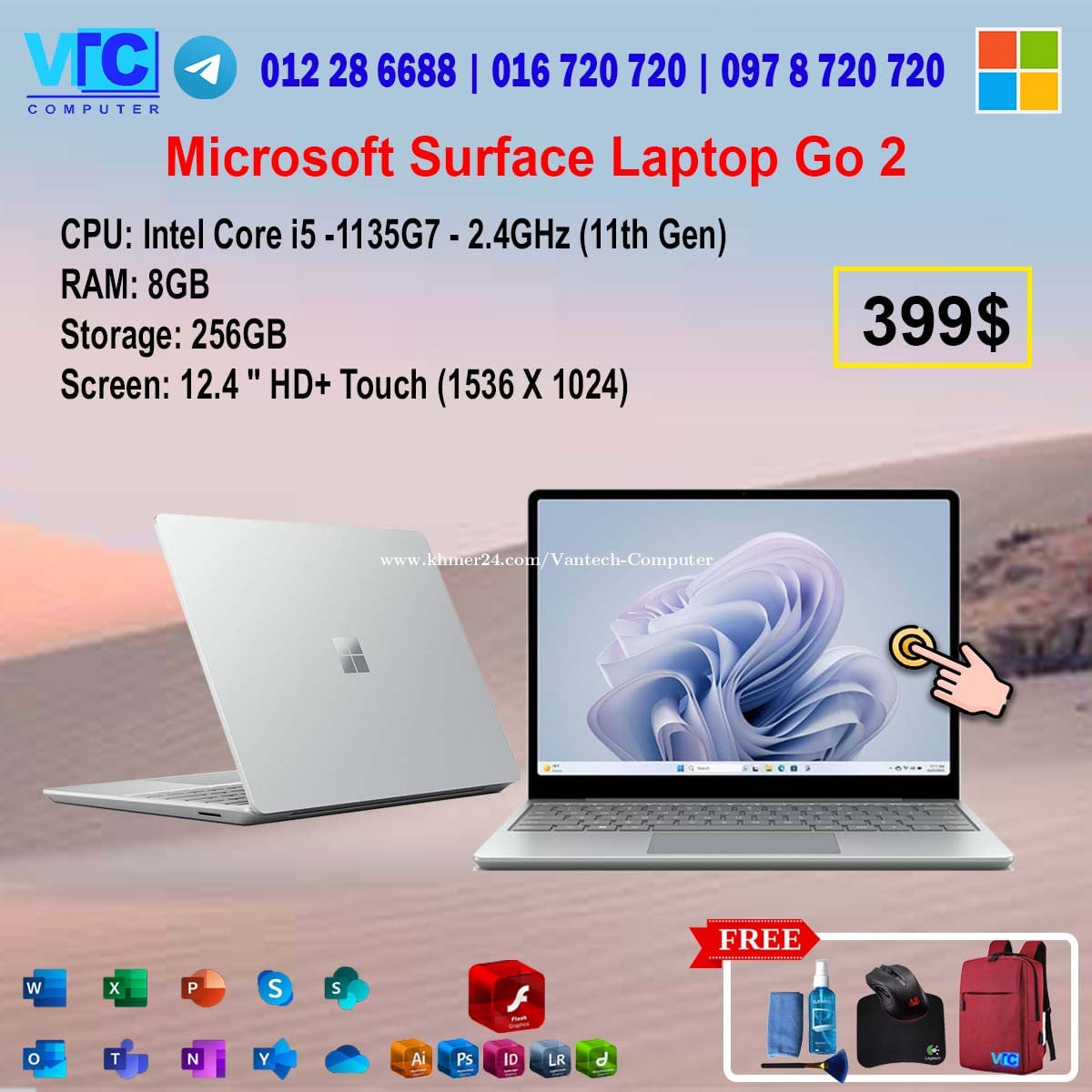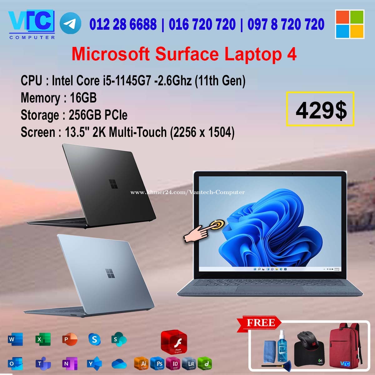 - Surface Laptop 5 . $529 ( Colors: Matte Black) i5- 1245U (12th Gen)/ RAM 16GB / 256GB / 13.5" QHD Multi-Touch - Surface Laptop 4 . $399 ( Colors: Matte Black, Silver) i5-1145G7 -2.6Ghz (11th Gen)/ Ram 8GB / 256GB / 13.5" QHD Multi-Touch - Surface Laptop 4 . $429 ( Colors: Matte Black, Silver) i5-1145G7 -2.6Ghz (11th Gen)/ Ram 16GB / 256GB / 13.5" QHD Multi-Touch - Surface Laptop 4 . $469 ( Colors: Matte Black, Silver) i5-1145G7 -2.6Ghz (11th Gen)/ Ram 16GB / 512GB / 13.5" QHD Multi-Touch - Surface Laptop 4 . $499 ( Colors: Matte Black, Silver) i7-1185G7 -3.0Ghz (11th Gen)/ RAM 16GB / 256GB / 13.5" QHD Multi-Touch - Surface Laptop 4 . $549 ( Colors: Matte Black, Silver) i7-1185G7 -3.0Ghz (11th Gen)/ RAM 16GB / 512GB / 13.5" QHD Multi-Touch - Surface Laptop 4 . $669 ( Colors: Matte Black) i7-1185G7 -3.0Ghz(11th Gen / Memory: 32GB/ 1TB PCIe/ 13.5" 2K Multi-Touch - Surface Pro 6 / Core i5-8350U-1.7GHz / Ram: 8GB/128GB / 12.3'' QHD + Keyboard . $249 Silver - Surface Pro 6 / Core i5-8350U-1.7GHz / Ram: 8GB/256GB / 12.3'' QHD + Keyboard. $299 Black - Surface Pro 7 / i5- 1035G4 (10th Gen)/ Ram 16GB/ 256GB / 12.3” 2K + Keyboard. $369 Silver - Surface Pro 7 / i5- 1035G4 (10th Gen)/ Ram 16GB/ 256GB / 12.3” 2K Touch + Keyboard. $399 Silver - Surface Pro 7 / i7- 1065G7 (10th Gen)/ Ram 16GB / 256GB / 12.3” 2K Touch + Keyboard. $449 Silver - Surface Pro 7 Plus / i5 - 1135G7 - 2.4Ghz (11th Gen)/ Ram: 8GB / 256GB/ 12.3” 2K +Keyboard. $389 Silver - Surface Pro 7 Plus / i5 - 1135G7 - 2.4Ghz (11th Gen)/ Ram 16GB / 256GB/ 12.3” 3K Touch + Keyboard. $459 Silver - Surface Laptop Go . $299 ( Color : silver) i5 -1035G1 (10th Gen)/ RAM : 4GB/ 256GB/ Screen : 12.4 " HD+ Touch - Surface Laptop Go . $339 ( Color : silver) i5 -1035G1 (10th Gen)/ RAM : 8GB/ 256GB/ Screen : 12.4 " HD+ Touch - Surface Laptop Go . $369 ( Color : silver) i5 -1035G1 (10th Gen)/ RAM : 16GB/ 256GB/ Screen : 12.4 " HD+ Touch - Surface Laptop Go 2 . $399 ( Color : silver) i5 -1135G7 - 2.4GHz (11th Gen)/ 8GB / 256GB/ 12.4 " HD+ Touch / Silver - Surface Laptop 3 . $329 ( Colors: Matte Black, Cobalt Blue, Silver) i5-1035G7-1.2Ghz (10th Gen)/ RAM : 8GB / 256GB / 13.5" 2K Touch - Surface Laptop 3 . $359 ( Colors: Matte Black, Cobalt Blue, Silver) i5-1035G7-1.2Ghz (10th Gen)/ RAM 16 GB / 256GB / 13.5" 2K Touch - Surface Laptop 3 . $419 ( Colors: Matte Black, Cobalt Blue, Silver) i7-1065G7 (10th Gen)/ RAM 16GB / 256GB / 13.5" 2K Touch - New Keyboard surface Pro in box (Black ) $95 - New Keyboard surface Pro in box (Gray) $95 - New Keyboard surface Pro in box (Red ) $99 - New Pen surface Pro (Blue, Red, Black ) - $79
