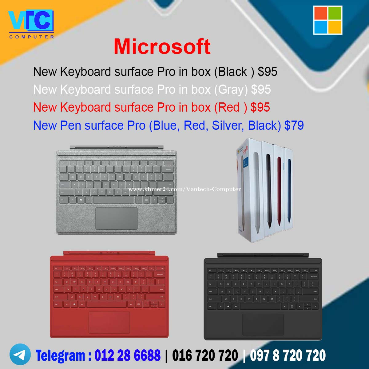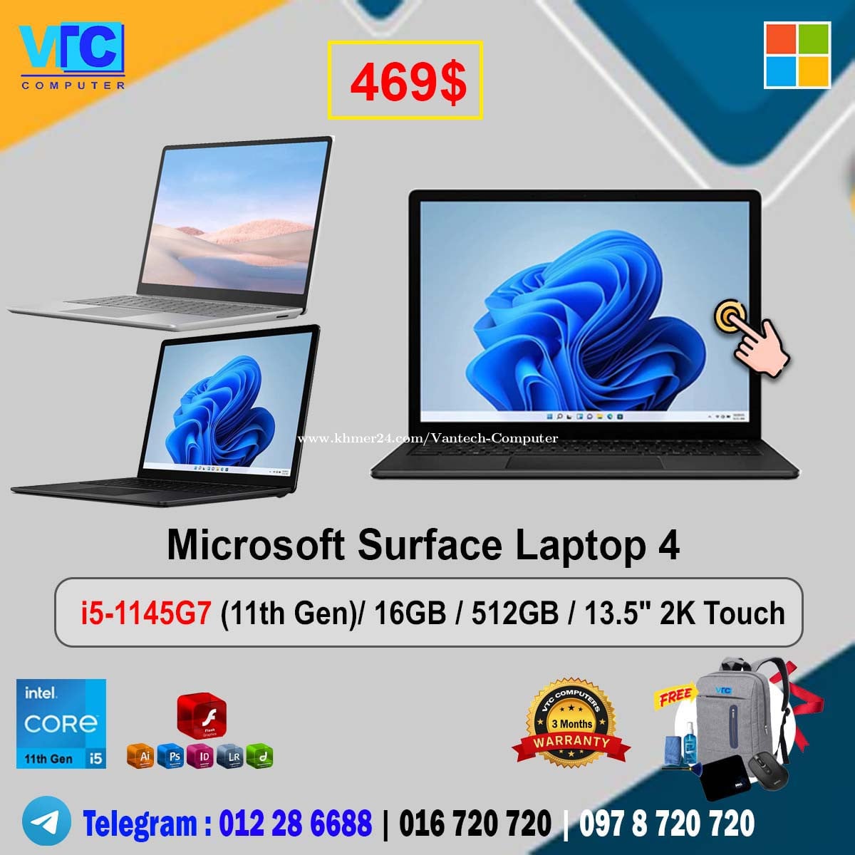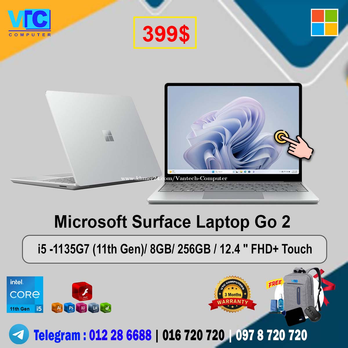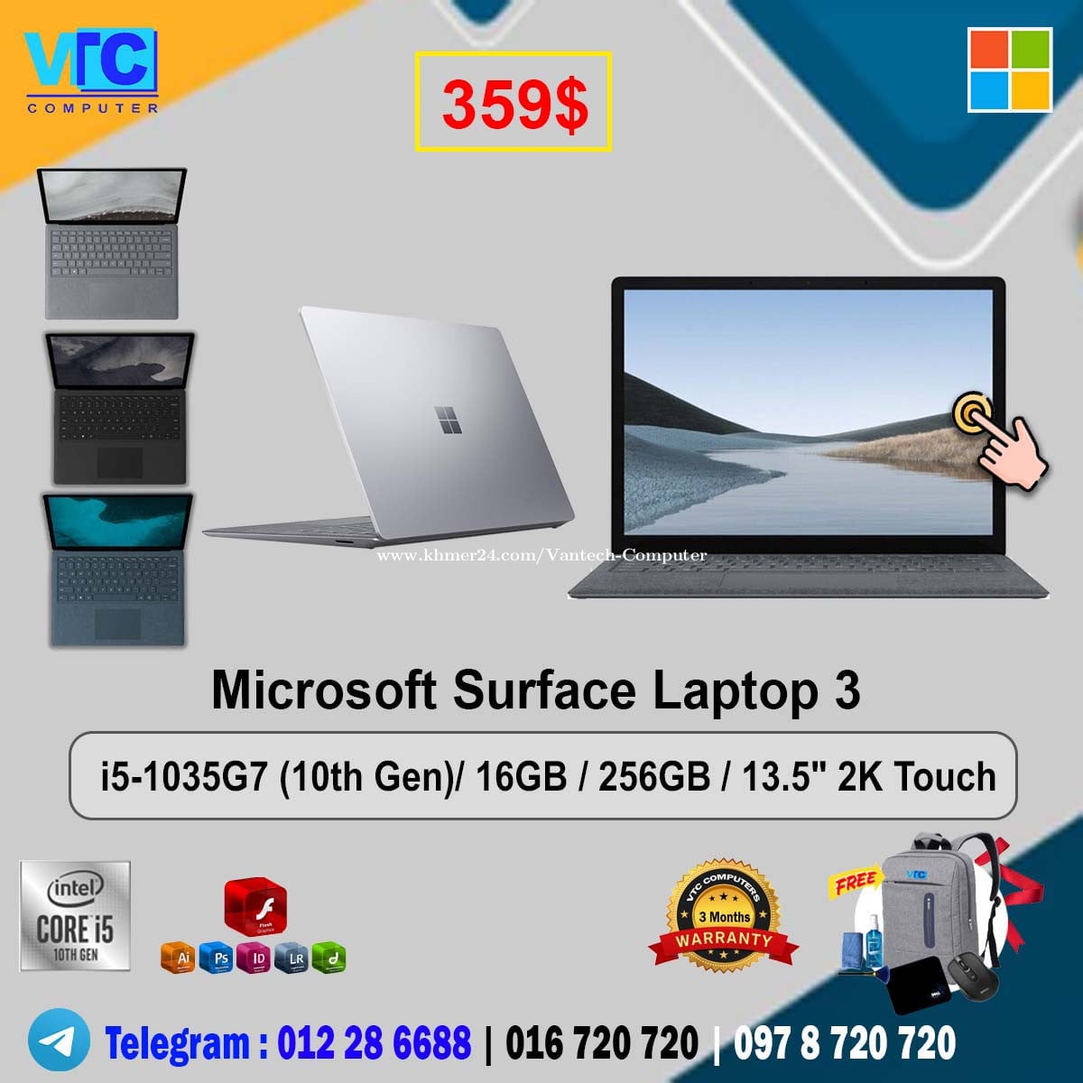 - Surface Laptop Go . $319 ( Color : silver) i5 -1035G1 (10th Gen)/ RAM : 8GB/ 256GB/ Screen : 12.4 " FHD+ Touch - Surface Laptop Go . $349 ( Color : silver) i5 -1035G1 (10th Gen)/ RAM : 16GB/ 256GB/ Screen : 12.4 " FHD+ Touch - Surface Laptop Go 2 . $399 ( Color : silver) i5 -1135G7 - 2.4GHz (11th Gen)/ 8GB/ 256GB/ 12.4 " FHD+ Touch / Silver - Surface Laptop 3 . $329 ( Colors: Matte Black, Cobalt Blue, Silver) i5-1035G7-1.2Ghz (10th Gen)/ RAM : 8GB / 256GB / 13.5" 2K Touch - Surface Laptop 3 . $359 ( Colors: Matte Black, Cobalt Blue, Silver) i5-1035G7-1.2Ghz (10th Gen)/ RAM 16 GB / 256GB / 13.5" 2K Touch - Surface Laptop 3 . $419 ( Colors: Matte Black, Cobalt Blue, Silver) i7-1065G7 (10th Gen)/ RAM 16GB / 256GB / 13.5" 2K Touch - Surface Laptop 4 . $429 ( Colors: Matte Black, Silver) i5-1145G7 -2.6Ghz (11th Gen)/ Ram 16GB / 256GB / 13.5" QHD Multi-Touch - Surface Laptop 4 . $469 ( Colors: Matte Black, Silver) i5-1145G7 -2.6Ghz (11th Gen)/ Ram 16GB / 512GB / 13.5" QHD Multi-Touch - Surface Laptop 4 . $499 ( Colors: Matte Black, Silver) i7-1185G7 -3.0Ghz (11th Gen)/ RAM 16GB / 256GB / 13.5" QHD Multi-Touch - Surface Laptop 5 . $529 ( Colors: Matte Black) i5- 1245U (12th Gen)/ RAM 16GB / 256GB / 13.5" QHD Multi-Touch - Surface Pro 5 / Core i5-7300U-2.7GHz / Ram: 8GB/128GB / 12.3'' QHD (2nd) . $169 Silver - Surface Pro 6 / Core i5-8350U-1.7GHz / Ram: 8GB/128GB / 12.3'' QHD (2nd)+ Keyboard . $249 Silver - Surface Pro 6 / Core i5-8350U-1.7GHz / Ram: 8GB/256GB / 12.3'' QHD (2nd) + Keyboard. $299 Black - Surface Pro 7 / i5- 1035G4 (10th Gen)/ Ram 16GB/ 256GB / 12.3” 3K Touch + Keyboard. $399 Silver - Surface Pro 7 / i7- 1065G7 (10th Gen)/ Ram 16GB / 256GB / 12.3” 3K Touch + Keyboard. $449 Silver - Surface Pro 7 Plus for Busines / i5 - 1135G7 - 2.4Ghz (11th Gen)/ Ram: 16GB / 256GB/ 12.3” 3K Touch + Keyboard. $459 Silver - New Keyboard surface Pro in box (Black ) $95 - New Keyboard surface Pro in box (Gray) $95 - New Keyboard surface Pro in box (Red ) $99 - New Pen surface Pro (Blue, Red , Silver, Black ) - $79