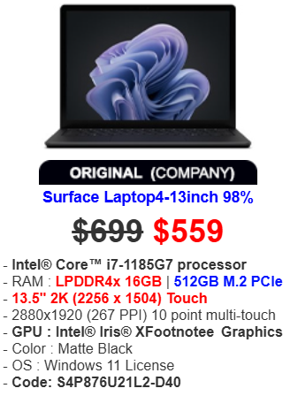 Surface Laptop4-13inch 98% - Intel® Core™ i7-1185G7 processor - RAM : LPDDR4x 16GB | 512GB M.2 PCIe - 13.5" 2K (2256 x 1504) Touch - 2880x1920 (267 PPI) 10 point multi-touch - GPU : Intel® Iris® XFootnotee Graphics - Color : Matte Black - OS : Windows 11 License