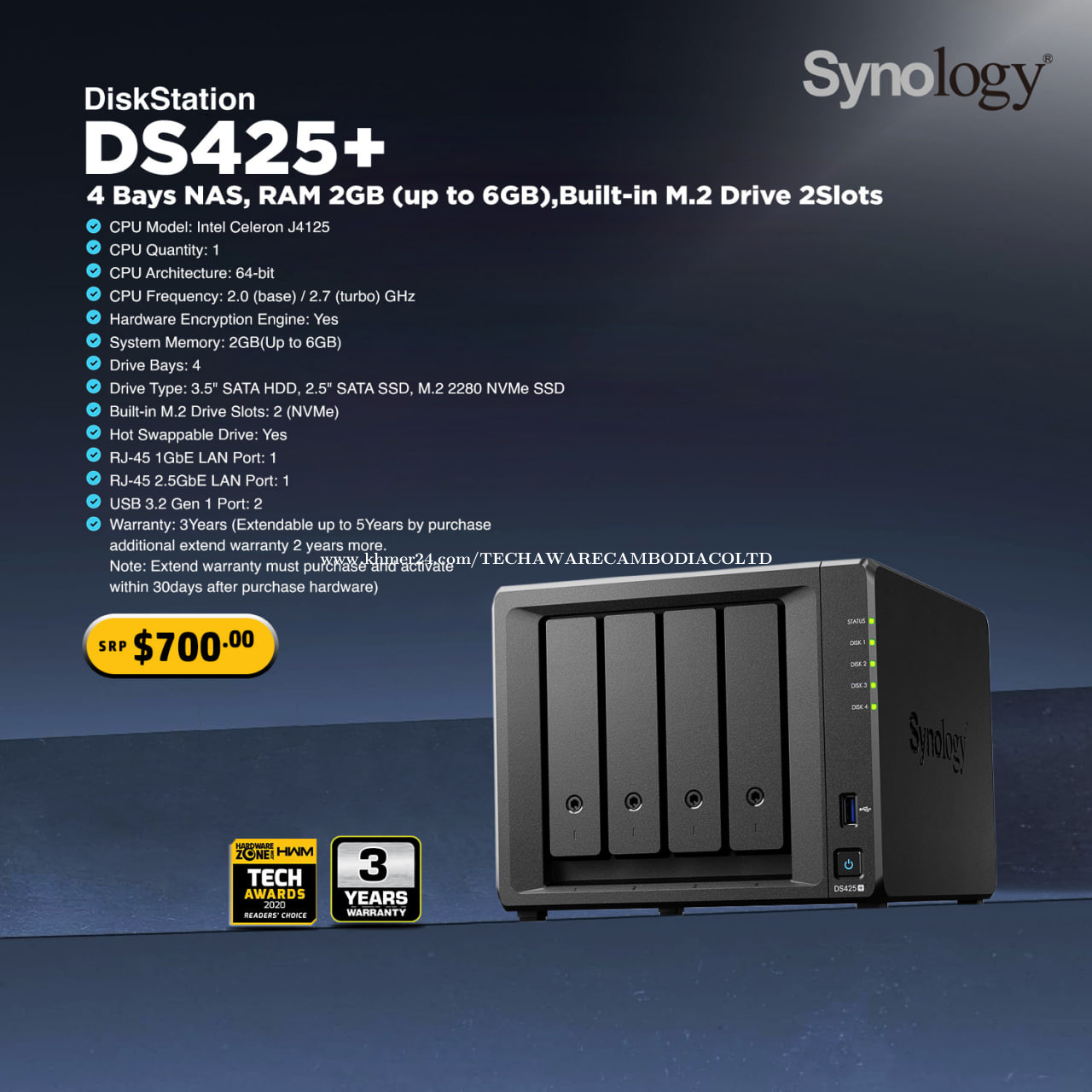Synology DS425+ ផ្ទុក ផ្ទេរ និងទាញយកឯកសារបានគ្រប់ទីកន្លែងនៅលើ Synology NAS តាមរយះស្មាតហ្វូន ឫកុំព្យូទ័រ ងាយស្រួលគ្រប់គ្រងនិងមានសុវត្ថិភាពបំផុត។ ************************************* Synology DiskStation DS425+ 4 Bays NAS, RAM 2GB (up to 6GB),Built-in M.2 Drive 2Slots - CPU Model: Intel Celeron J4125 - CPU Quantity: 1 - CPU Architecture: 64-bit - CPU Frequency: 2.0 (base) / 2.7 (turbo) GHz - Hardware Encryption Engine: Yes - System Memory: 2GB(Up to 6GB) - Drive Bays: 4 - Drive Type: 3.5" SATA HDD, 2.5" SATA SSD, M.2 2280 NVMe SSD - Built-in M.2 Drive Slots: 2 (NVMe) - Hot Swappable Drive: Yes - RJ-45 1GbE LAN Port: 1 - RJ-45 2.5GbE LAN Port: 1 - USB 3.2 Gen 1 Port: 2 - Warranty: 3Years ************************************* ទំនាក់ទំនងមកឥឡូវនេះ ដើម្បីទទួលបាននូវតម្លៃពិសេស និងការដឹកជញ្ជូនឥតគិតថ្លៃ!ផលិតផលសុទ្ធរបស់ក្រុមហ៊ុន 100% រកទិញបាននៅ First Electronics BOREY HONG LAY, Toul PongRo 🏠Address: #85, St.01, Sangkat Prey Sar, Phnom Penh 🎯https://goo.gl/maps/DPQB66KGvaBDYS4V6 ☎️077973xxxClick To Call / 069360xxxClick To Call 012288xxxClick To Call/ 016288xxxClick To Call / 0972288xxxClick To Call ✅https://t.me/chhenghoryan ✅https://t.me/ChhanSopha #FirstElectronics #Synology