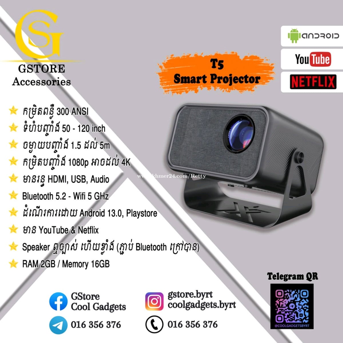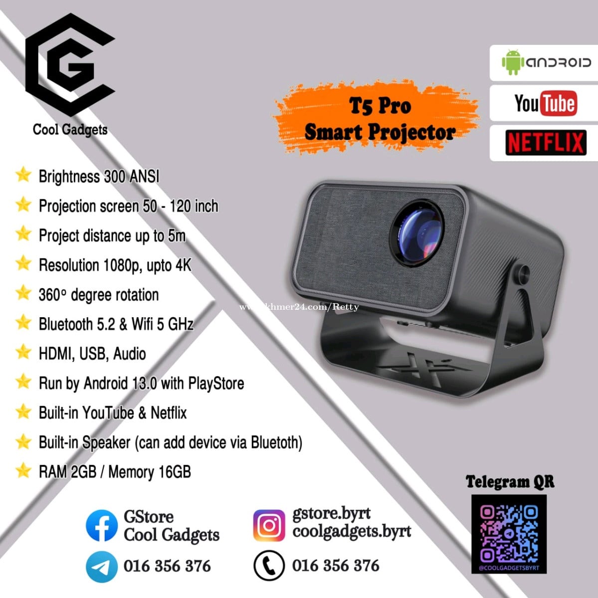 ⭐Brightness 300 ANSI ⭐Projection screen 50 - 120 inch ⭐Project distance up to 5m ⭐Resolution 1080p, upto 4K ⭐360° degree rotation ⭐Bluetooth 5.2 & Wifi 5 ⭐HDMI, USB, Audio ⭐Run by Android 9.0 with PlayStore ⭐Built-in YouTube, Netflix, speaker ⭐RAM 2GB / Memory 16GB ✨ Come with free smart keyboard 🥇 Come with warranty 🏍️ Nationwide delivery ☎️ Contact 📞 +8551635xxxClick To Call6 📞 Telegram https://t.me/coolgadgetsbyrt https://vt.tiktok.com/ZSMwhERLC/
