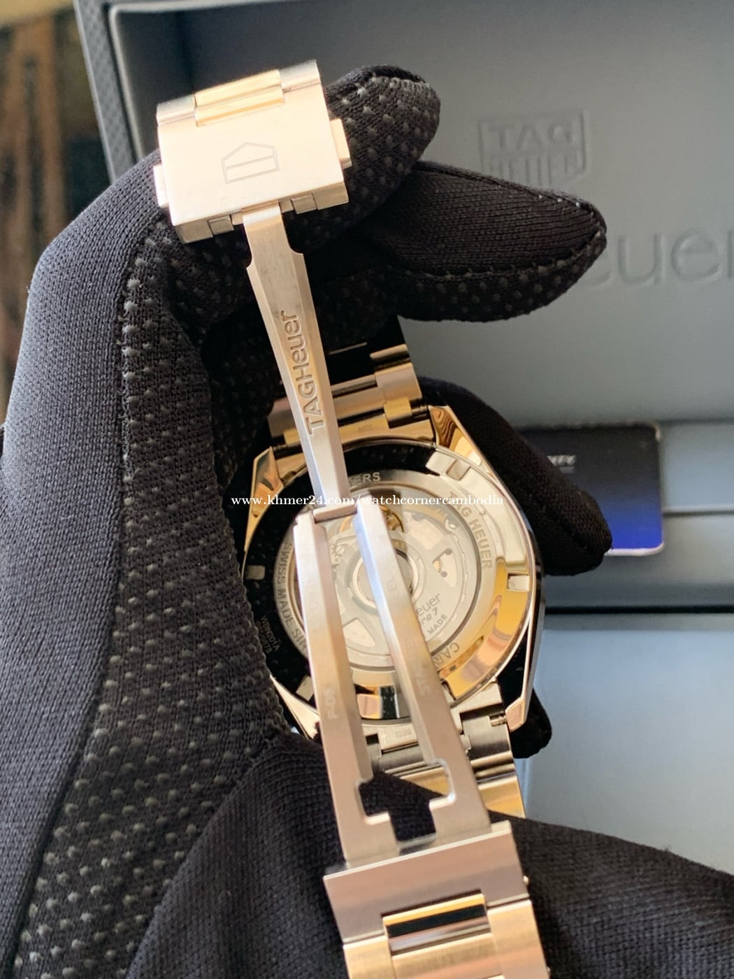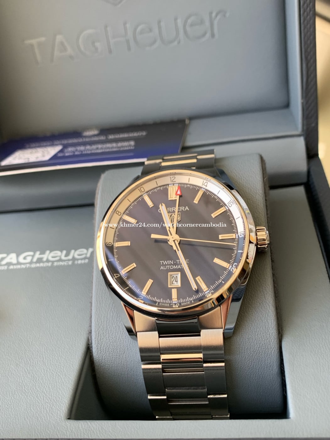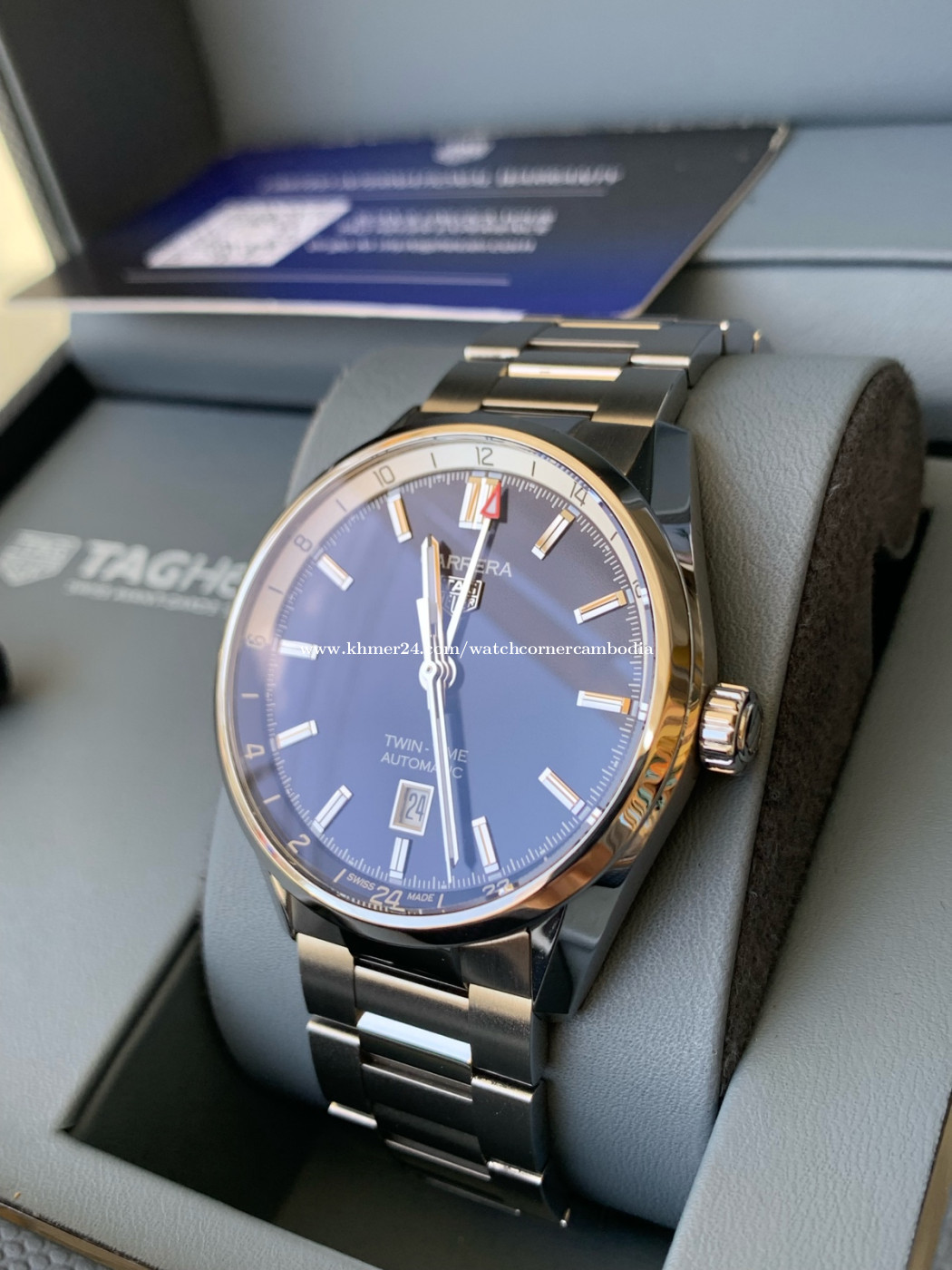 -Tagheuer carrera Twin-time GMT -year 2023 new model -Case size 41mm -Movement automatic( power reserve 50 hour ) -Glass sapphire crystal -condition used 98% like new -come with box warranty card and paper full sets -Delivery 25 province in Cambodia -contact us 086 386838( Telegram) -๐Watch corner Cambodia Facebook page ๐ ๐ขNote this watch new in botique 3900$ Our price 2500$ guarantee original all parts !