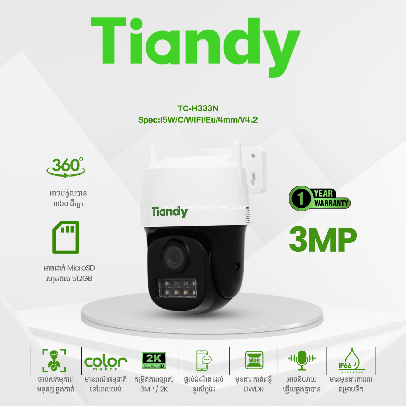 TC-H333N Spec:I5W/C/WIFI/Eu/4mm/V4.2 | camera Wifi 3MP អាចនិយាយឆ្លើយឆ្លងបាន ✅3MP Wi-Fi 1/2.9'' CMOS, F1.6 Fixed Iris ✅Digital WDR ✅Up to 2304x1296@25fps ✅IR Range: 50m ✅Built-in Mic/Speaker ✅WiFi,Support Human Detection and Tracking ✅DC12V,25fps, European standard power adapter សូមទំនាក់ទំនងមកកាន់ប្រអប់សារ ឬលេខទូរស័ព្ទ ☎️ 099555xxxClick To Call ☎️ 098555xxxClick To Call 📲 https://t.me/SL718