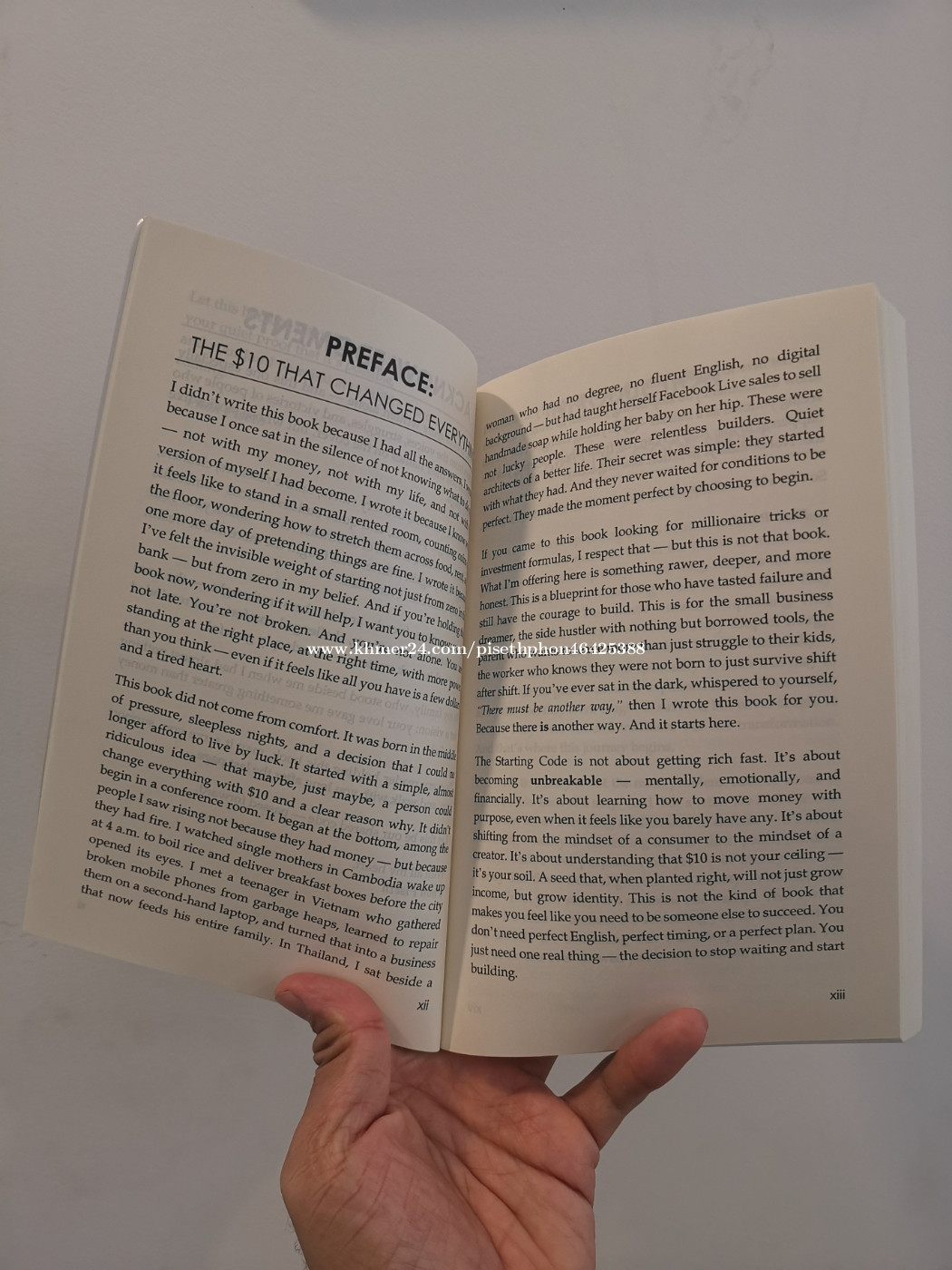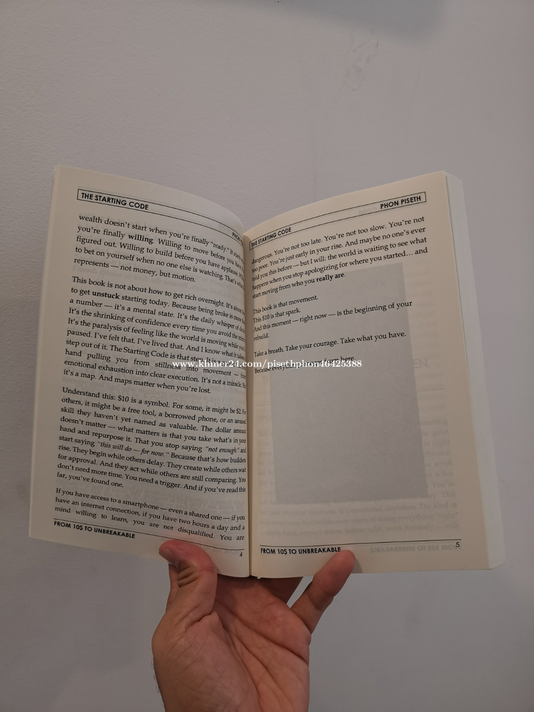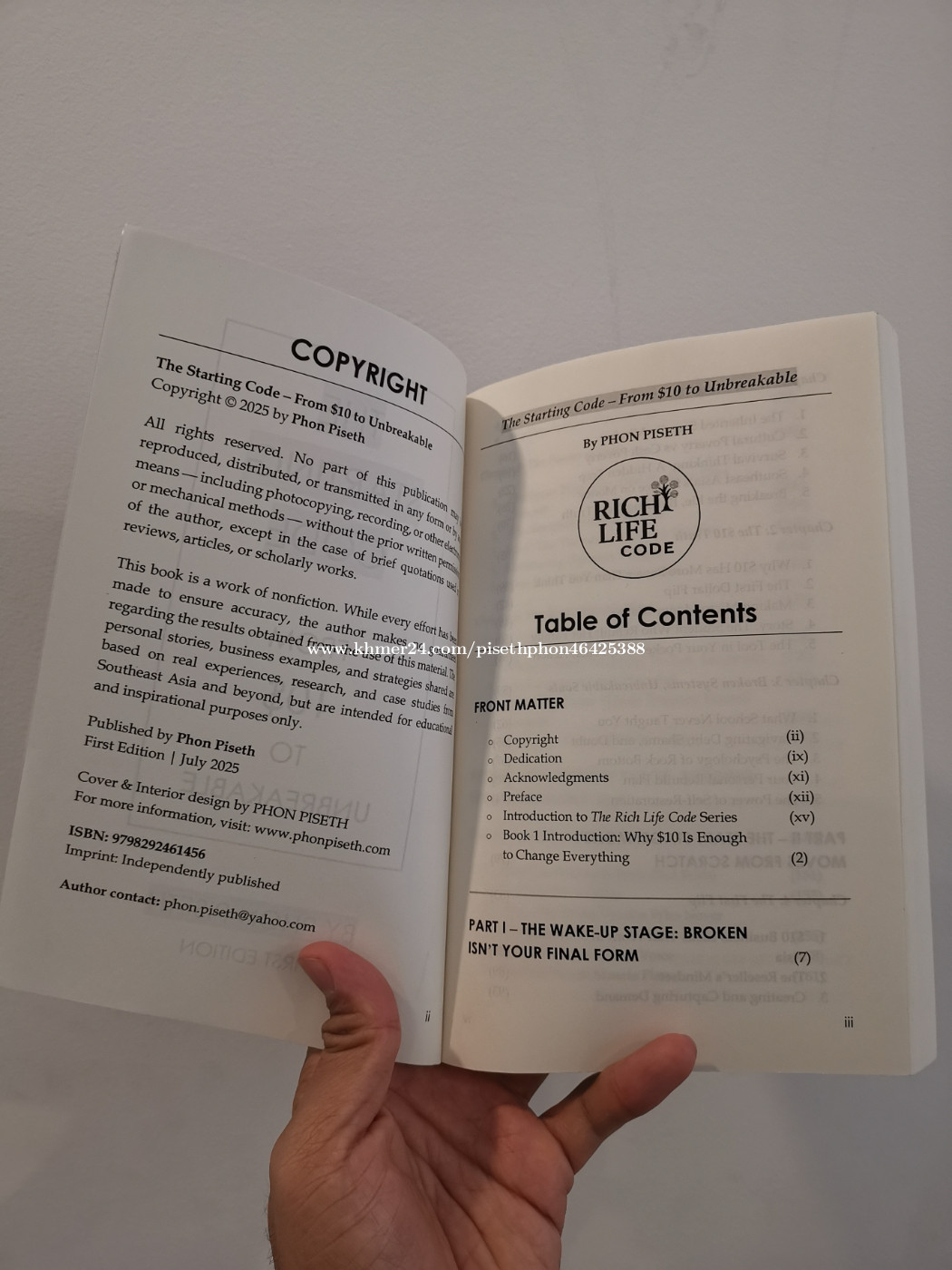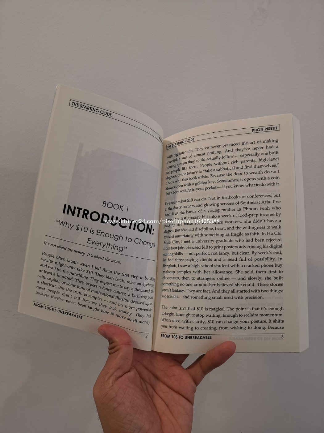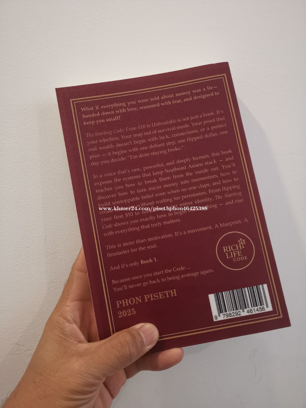 Product Details ------------------ The Starting Code – From $10 to Unbreakable is the first book in The Rich Life Code series by Cambodian author Phon Piseth. It is a blueprint for anyone starting with almost nothing—those who have felt broke, stuck, or overlooked, but still carry the fire to build. Piseth blends raw personal experience with real-life stories from Cambodia, Vietnam, Thailand, and across Southeast Asia to show how just $10 can ignite a rebuild. This is not a get-rich-quick book—it is a guide to becoming unbreakable in mindset, discipline, and daily action. Readers will learn how to: • Break free from the inherited scarcity mindset and cultural poverty. • Transform $10 into a starting point for growth through practical flips and micro-businesses. • Build identity, confidence, and resilience as foundations for wealth. • Create daily rituals that turn small wins into long-term momentum. • Move from broke survival to builder rhythm, one step at a time. Book Specifications: • Trim Size: 6 × 9 inches (15.24 × 22.86 cm) • Page Count: 298 pages • Format: High-Quality Creamy Paperback The Starting Code is more than a book—it’s a movement for those who refuse to stay silent, small, or stuck. If you’ve ever whispered, “There must be more to life than this,” this book is your answer. ✨ If you are living in the US, UK, or any other part of the world, you can easily purchase this book through Amazon.com via this link: https://a.co/d/ehmqyFF