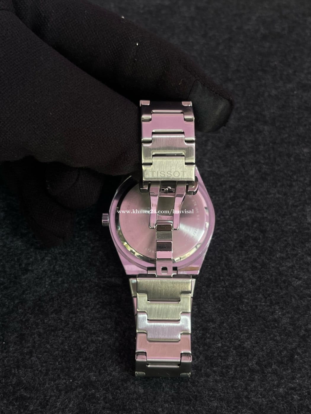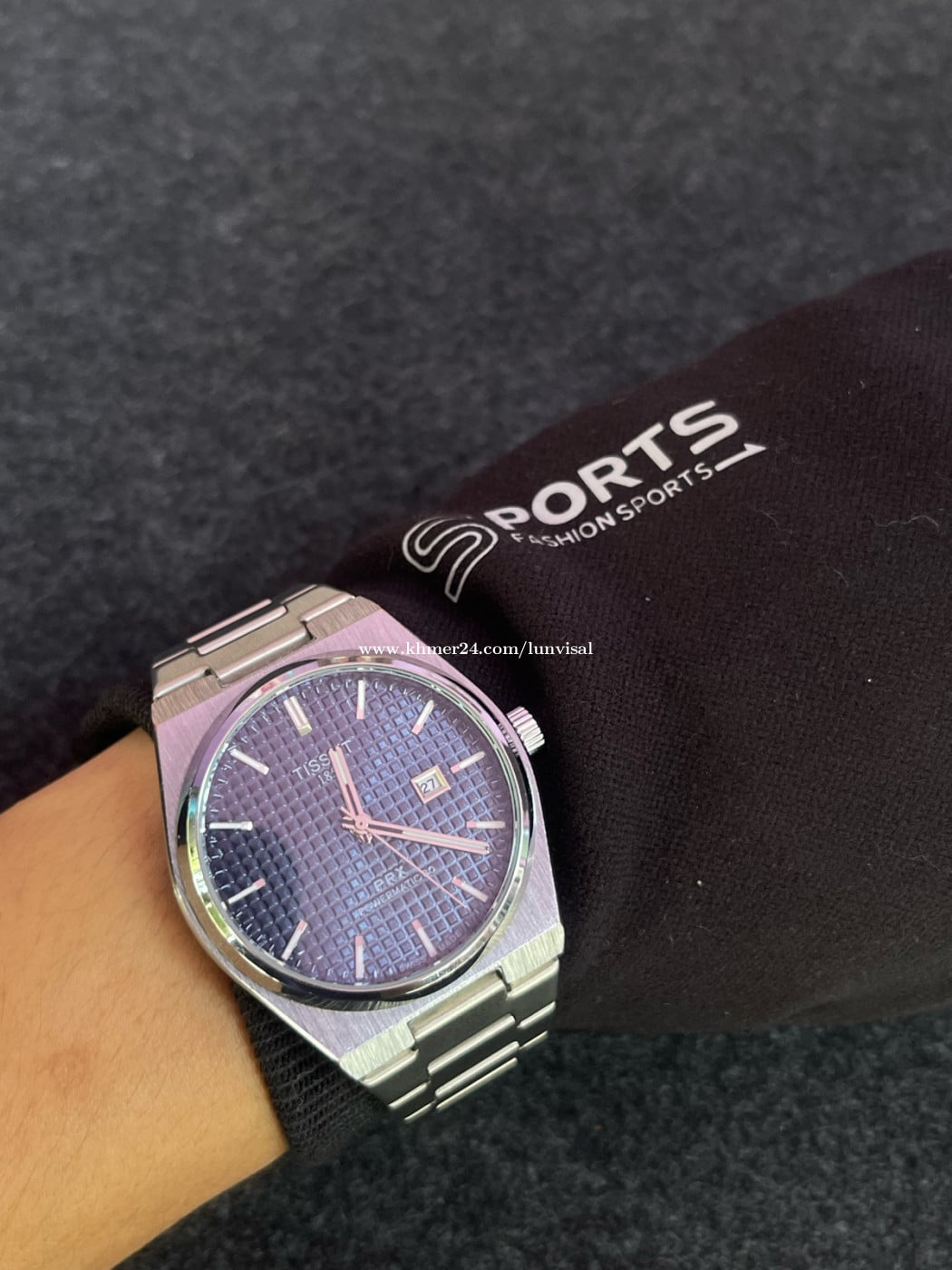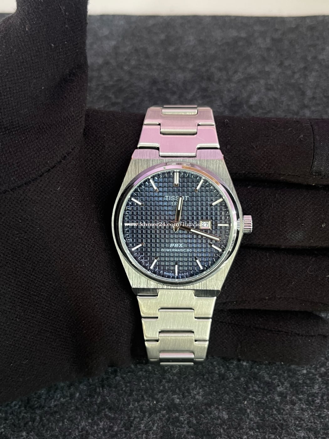 Tissot PRX Powermatic 80 watch with a navy blue waffle dial and stainless steel integrated bracelet.