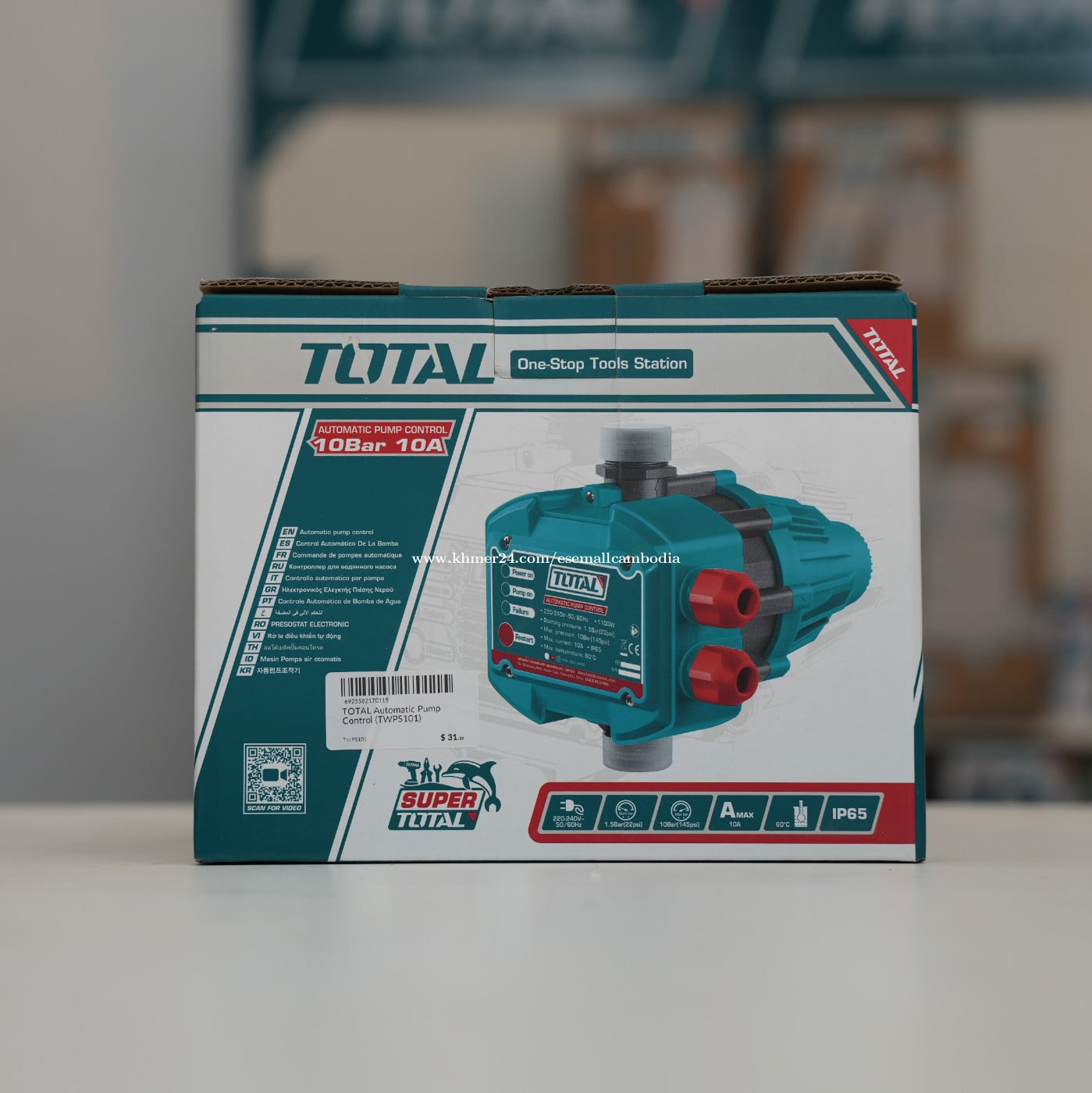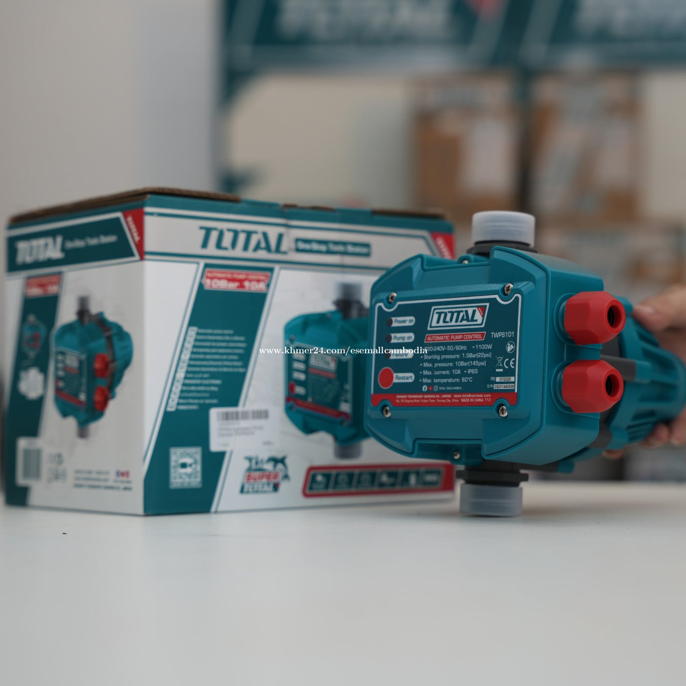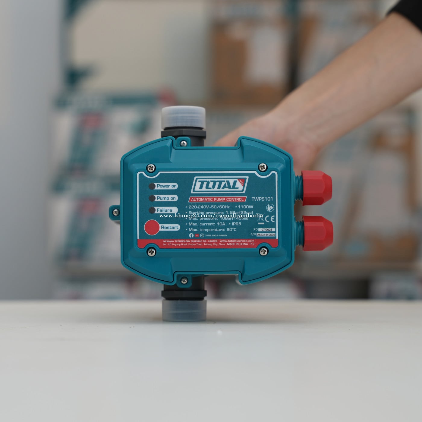 TOTAL Automatic Pump Control 10Bar 10A (TWPS101) តម្លៃ៖ $31.20 សភាព៖ ថ្មី 100% ប្រភេទ៖ ឧបករណ៍គ្រប់គ្រងម៉ាស៊ីនបូមទឹក / Pump Controller ម៉ាក៖ TOTAL ម៉ូដែល៖ TWPS101 ពណ៌នាផលិតផល TOTAL Automatic Pump Control 10Bar 10A គឺជាឧបករណ៍គ្រប់គ្រងម៉ាស៊ីនបូមទឹកដោយស្វ័យប្រវត្តិ ដែលជួយបើក និងបិទម៉ាស៊ីនបូមទឹកដោយស្វ័យប្រវត្តិពេលមានការប្រើប្រាស់ទឹក។ ជួយការពារម៉ាស៊ីនបូមទឹកពីការដំណើរការដោយគ្មានទឹក (Dry Run Protection) និងបង្កើនអាយុកាលប្រើប្រាស់។ រចនារឹងមាំ មិនជ្រាបទឹក សាកសមសម្រាប់ការប្រើប្រាស់ក្នុងផ្ទះ និងសំណង់។ លក្ខណៈបច្ចេកទេស (Specifications) ប្រភេទ៖ Automatic Pump Control វ៉ុលភ្លើង៖ 220–240V ~ 50/60Hz ថាមពលអតិបរមា៖ 1100W សម្ពាធអតិបរមា៖ 10 Bar (145 psi) សម្ពាធចាប់ផ្តើម៖ 1.5 Bar (22 psi) ចរន្តអតិបរមា៖ 10A សីតុណ្ហភាពអតិបរមា៖ 60°C កម្រិតការពារ៖ IP65 មុខងារ៖ Automatic Start/Stop, Dry Run Protection, Restart Button ពណ៌៖ ខៀវ (TOTAL Design) អត្ថប្រយោជន៍ បើក/បិទម៉ាស៊ីនបូមទឹកដោយស្វ័យប្រវត្តិ ការពារម៉ាស៊ីនបូមទឹកពេលគ្មានទឹក រចនាមិនជ្រាបទឹក IP65 ប្រើបានយូរ ងាយដំឡើង និងងាយប្រើ សន្សំថាមពល និងថែទាំងាយ សាកសមសម្រាប់ ម៉ាស៊ីនបូមទឹកក្នុងផ្ទះ ប្រព័ន្ធទឹកសួនច្បារ ផ្ទះជាន់ និងអគារតូច អ្នកប្រើប្រាស់ផ្ទះ និងអ្នកជាង