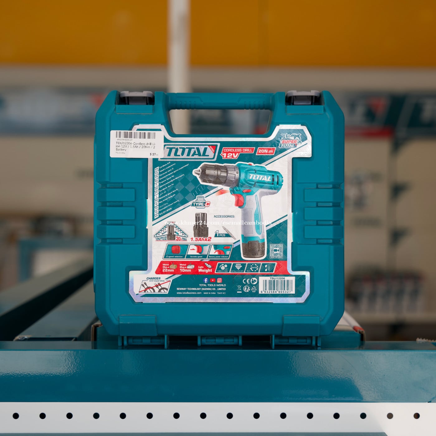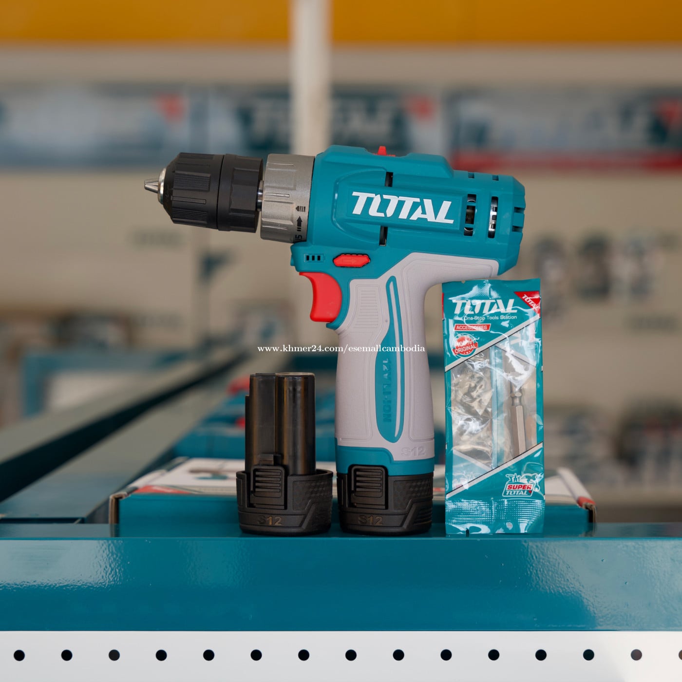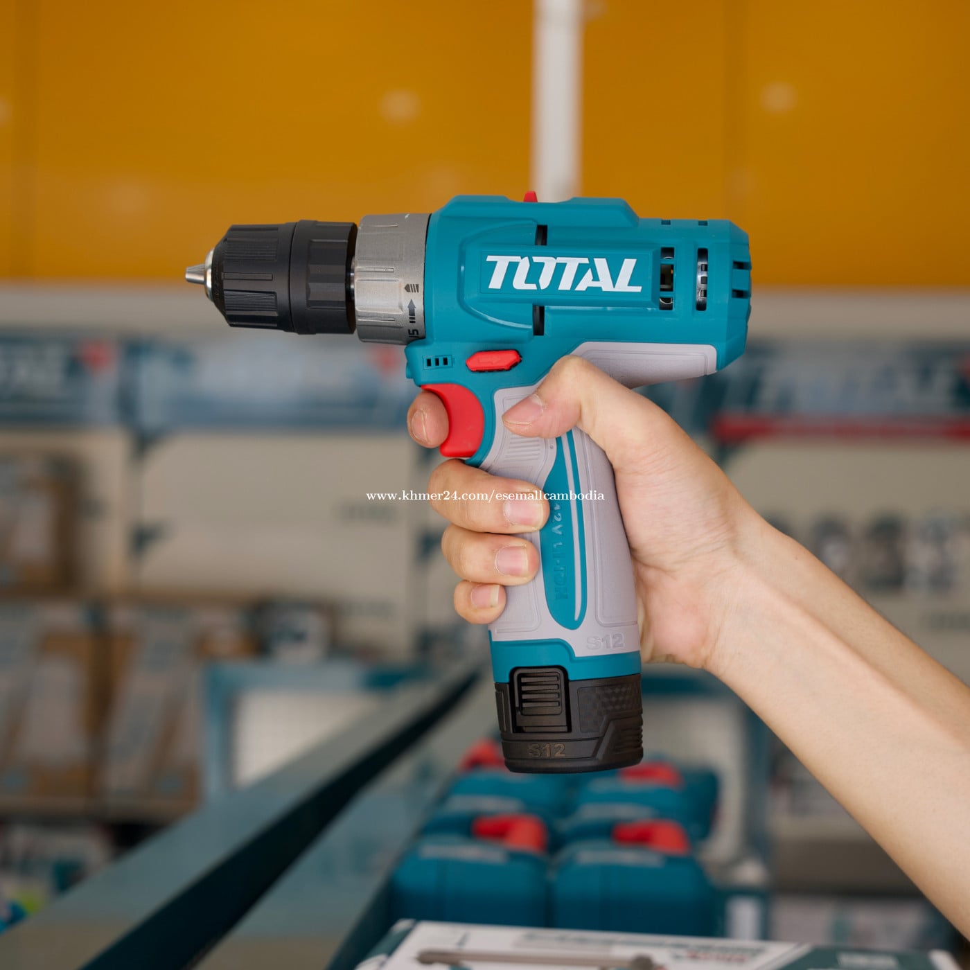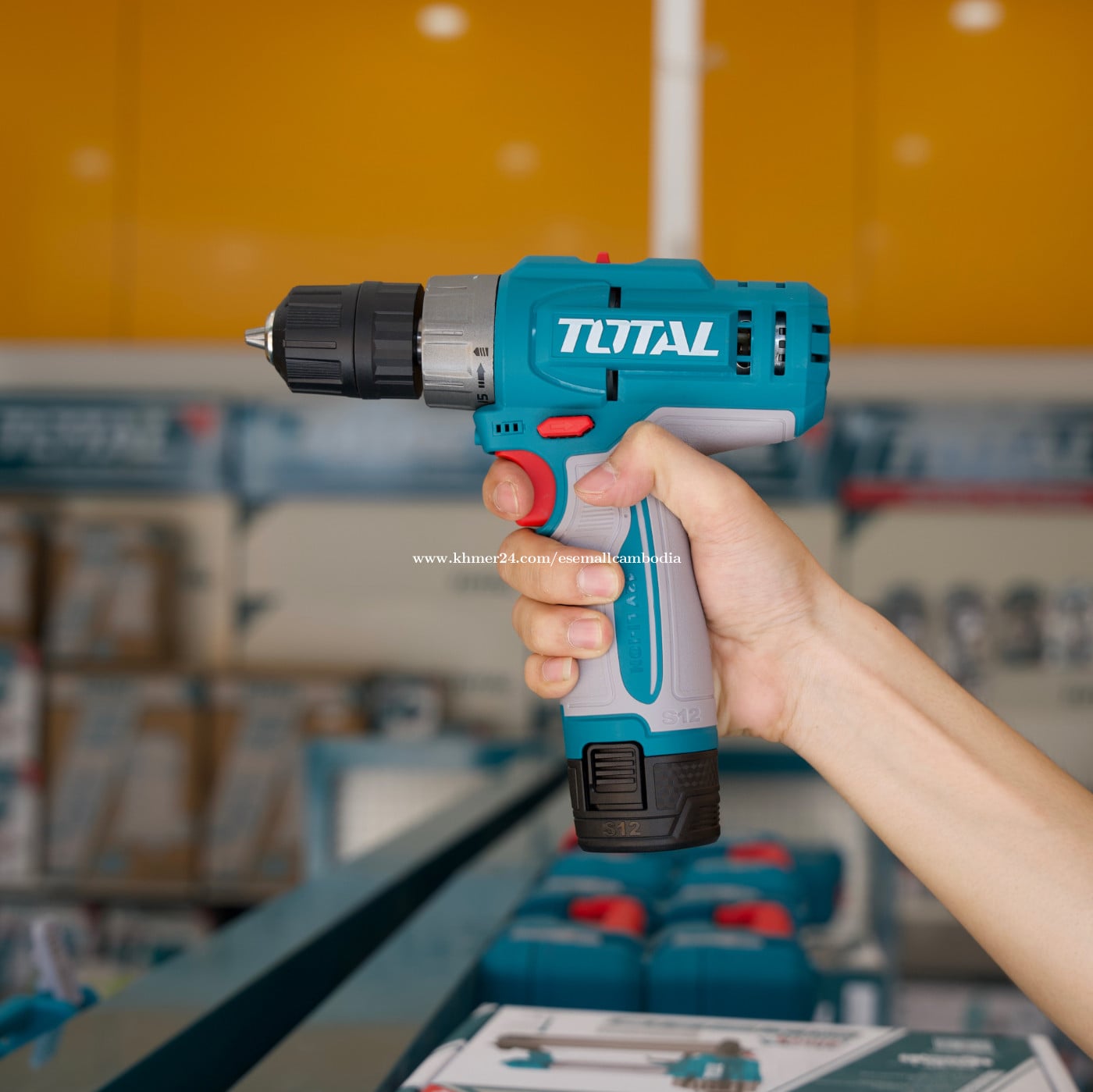 TOTAL Cordless Drill 12V (Lithium-Ion) (TDLI12206) តម្លៃ៖ $37.70 សភាព៖ ថ្មី 100% ប្រភេទ៖ ម៉ាស៊ីនខួងឥតខ្សែ / Cordless Drill ម៉ាក៖ TOTAL វ៉ុលថាមពល៖ 12V ⭐ ពណ៌នាផលិតផល TOTAL Cordless Drill 12V គឺជាម៉ាស៊ីនខួងឥតខ្សែប្រើថ្ម Lithium-Ion ដែលមានទំហំតូច ប៉ុន្តែមានកម្លាំងល្អ សាកសមសម្រាប់ការងារខួង និងវីសទូទៅ។ រចនាបែបស្រាល ងាយកាន់ មានចំណុចកាន់មិនរអិល អាចប្រើបានយូរ មិនធ្វើឲ្យដៃនឿយហត់។ សាកសមសម្រាប់ការងារជាង ការជួសជុល និងការប្រើប្រាស់ក្នុងផ្ទះ។ 🔍 លក្ខណៈបច្ចេកទេស (Specifications) ប្រភេទ៖ Cordless Drill / Screwdriver វ៉ុលថាមពល៖ 12V ប្រភេទថ្ម៖ Lithium-Ion ក្បាលចាប់ដុំខួង (Chuck):Keyless ការបញ្ជាល្បឿន៖ Variable Speed ប្រព័ន្ធបង្វិល៖ Forward & Reverse ចំណុចប្តូរកម្លាំង (Torque):ច្រើនកម្រិត ការរចនា៖ Ergonomic Design ម៉ាក៖ TOTAL 📦 អ្វីដែលមានក្នុងប្រអប់ ម៉ាស៊ីន TOTAL Cordless Drill 12V ថ្ម Lithium-Ion ឆ្នាំងសាក (Charger) ក្បាលដុំខួង / អាគុយស្រោម (Accessories) ប្រអប់ផ្ទុក (Plastic Carry Case) ⭐ អត្ថប្រយោជន៍ ✔ ឥតខ្សែ ងាយស្រួលប្រើគ្រប់ទីកន្លែង ✔ ទំហំតូច ស្រាល ងាយកាន់ ✔ បញ្ជាល្បឿន និងកម្លាំងបានច្រើនកម្រិត ✔ សាកសមសម្រាប់ខួង និងវីស ✔ ថ្ម Lithium-Ion មានអាយុកាលប្រើប្រាស់បានយូរ ✔ គុណភាពស្តង់ដារពី TOTAL 🏠 សាកសមសម្រាប់ ការងារជាងទូទៅ ការជួសជុលក្នុងផ្ទះ ដំឡើងគ្រឿងសង្ហារឹម ការងារ DIY ការប្រើប្រាស់ប្រចាំថ្ងៃ