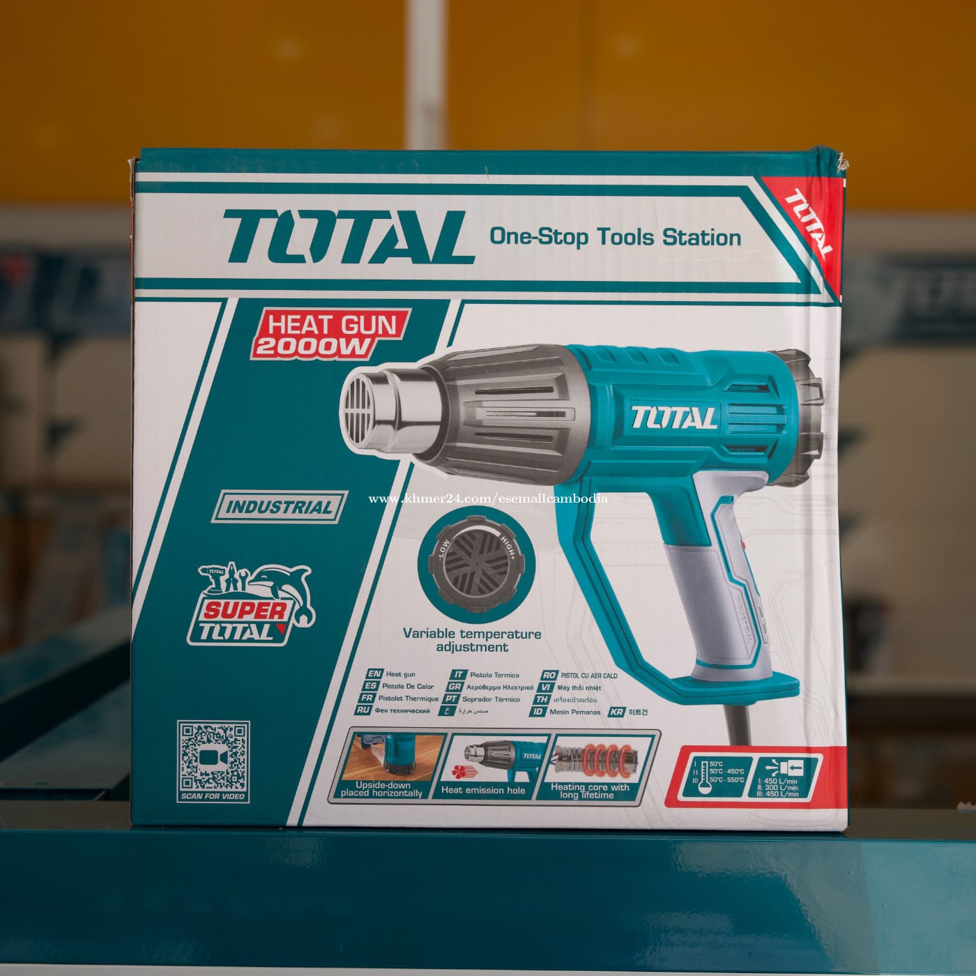 TOTAL Heat Gun 2000W (Industrial) (TB20025) តម្លៃ: $27.30 សភាព: ថ្មី 100% ប្រភេទ: ម៉ាស៊ីនបាញ់ខ្យល់ក្តៅ / Heat Gun ម៉ាក: TOTAL ថាមពល: 2000W ពណ៌នាផលិតផល TOTAL Heat Gun 2000W គឺជាម៉ាស៊ីនបាញ់ខ្យល់ក្តៅសម្រាប់ការងារឧស្សាហកម្ម និងការងារជួសជុលទូទៅ ដែលត្រូវការកម្តៅខ្ពស់ និងការគ្រប់គ្រងសីតុណ្ហភាពបានត្រឹមត្រូវ។ មានមុខងារ កំណត់សីតុណ្ហភាពអថេរ (Variable Temperature Adjustment) និងរចនារឹងមាំ ងាយកាន់ សាកសមសម្រាប់ការប្រើប្រាស់ជាប្រចាំ។ លក្ខណៈបច្ចេកទេស (Specifications) ប្រភេទ: Heat Gun ថាមពល: 2000W កម្រិតសីតុណ្ហភាព: Level I: 50°C Level II: 50°C – 450°C Level III: 50°C – 550°C បរិមាណខ្យល់: Level I: 250 L/min Level II: 350 L/min Level III: 450 L/min មុខងារ: Variable temperature control កម្រិតប្រើប្រាស់: Industrial វ៉ុល: AC 220–240V / 50–60Hz អត្ថប្រយោជន៍ កម្លាំង 2000W កម្តៅខ្លាំង និងស្ថេរភាព កំណត់សីតុណ្ហភាពបានតាមប្រភេទការងារ រចនាមានតុល្យភាព ងាយកាន់ មិនធ្ងន់ដៃ ប្រើបានទាំងការងារតូច និងការងារឧស្សាហកម្ម គ្រាប់កម្តៅអាយុកាលយូរ អ្វីដែលមានក្នុងប្រអប់ TOTAL Heat Gun 2000W ក្បាលបាញ់ខ្យល់ (Nozzles) ច្រើនប្រភេទ ឧបករណ៍ជំនួយសម្រាប់ការងារកម្តៅ សាកសមសម្រាប់ ដោះស្លាក និងស្កotch បត់បែនប្លាស្ទិក / PVC បាញ់កម្តៅលើថ្នាំពណ៌ ការងារជួសជុលអគ្គិសនី និងឧស្សាហកម្ម ការងារផ្ទះ និងរោងជាង