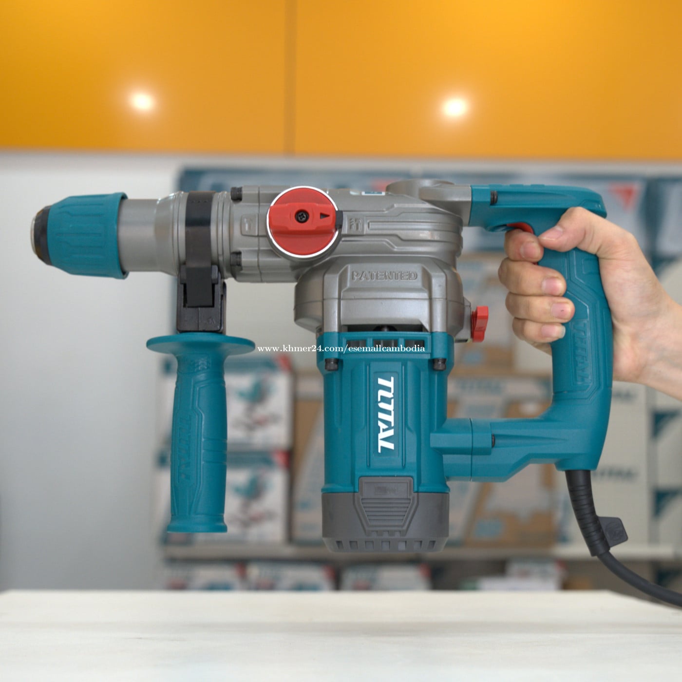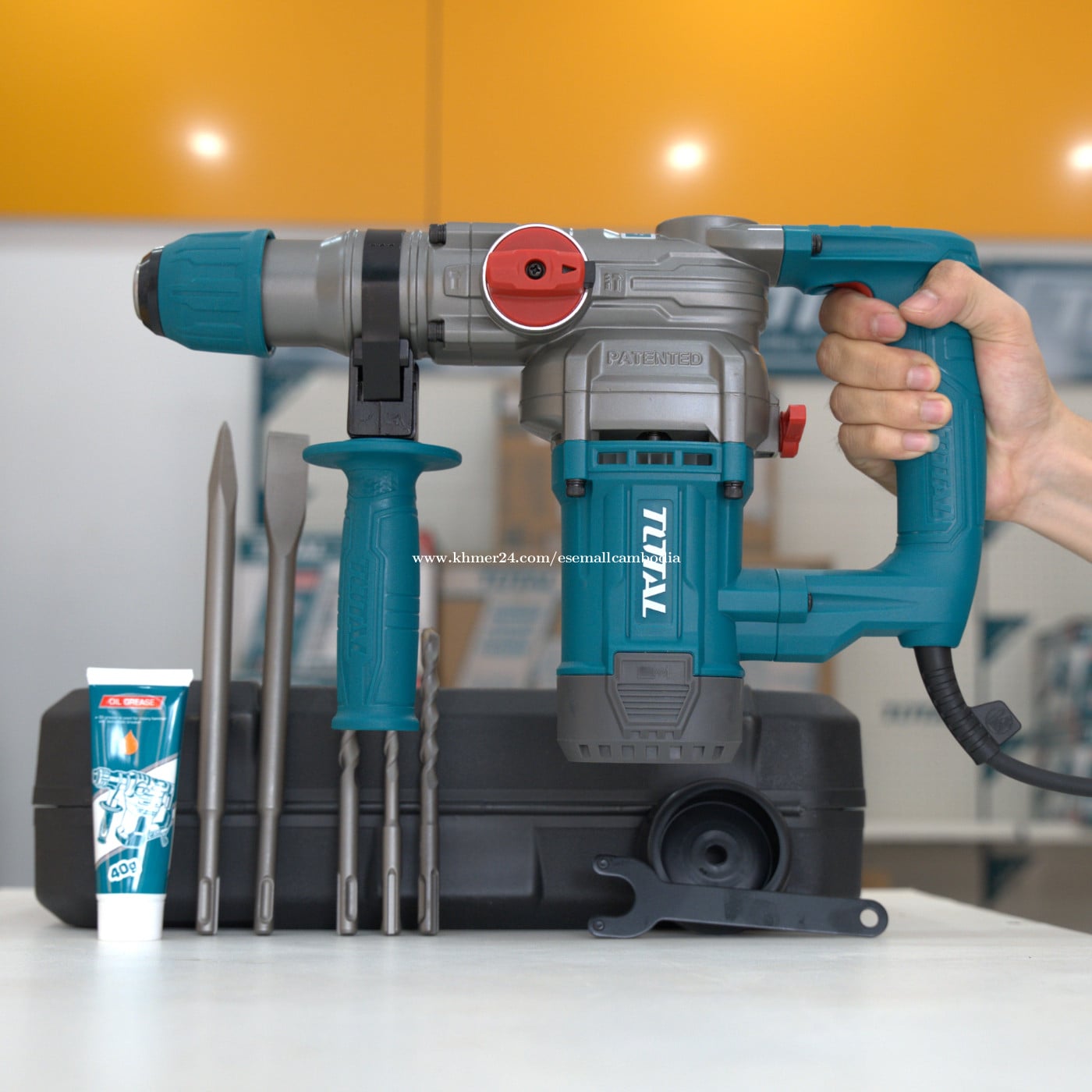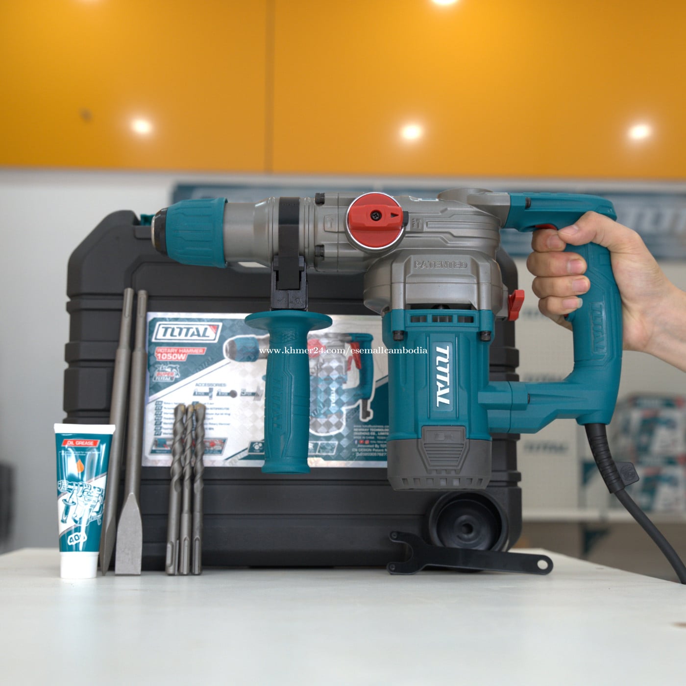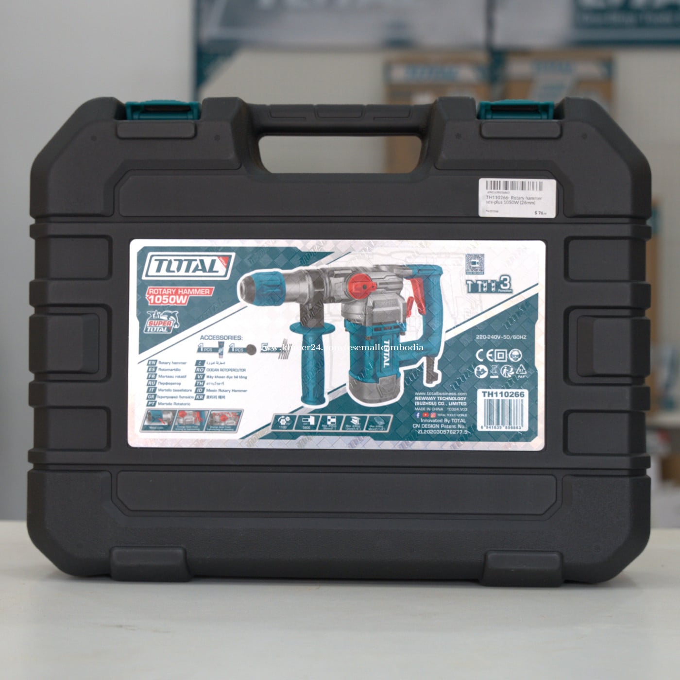 TOTAL Rotary Hammer 1050W SDS Plus (26mm) – ម៉ាស៊ីនដ្រ៊ីលបុក 1050W (TH110266) តម្លៃ៖ $76.70 សភាព៖ ថ្មី 100% ប្រភេទ៖ ម៉ាស៊ីនដ្រ៊ីលបុក / Power Tools ម៉ាក៖ TOTAL ម៉ូដែល៖ TH110266 ⭐ ពណ៌នាផលិតផល TOTAL Rotary Hammer 1050W SDS Plus គឺជាម៉ាស៊ីនដ្រ៊ីលបុកកម្លាំងខ្លាំង សាកសមសម្រាប់ការខួង និងបុកបំបែកលើសម្ភារៈរឹងៗ ដូចជា បេតុង ឥដ្ឋ ថ្ម និងដែក។ ម៉ូទ័រ 1050W ផ្តល់កម្លាំងខ្ពស់ និងស្ថេរភាពល្អ ធ្វើឲ្យការងារបានលឿន និងមានប្រសិទ្ធភាព។ ម៉ាស៊ីនមានមុខងារ 3-in-1 (ខួង, ខួងបុក, បុកបំបែក) ប្រើប្រព័ន្ធ SDS Plus ងាយប្តូរខួង និងមានដៃកាន់ជំនួយ កាន់ងាយ និងបង្កើនសុវត្ថិភាពពេលប្រើប្រាស់។ ⭐ លក្ខណៈបច្ចេកទេស (Specifications) ថាមពល៖ 1050W ប្រព័ន្ធខួង៖ SDS Plus អង្កត់ផ្ចិតខួងអតិបរមា (បេតុង):26mm ល្បឿនបង្វិល៖ ប្រហាក់ប្រហែល 0–900 rpm អត្រាបុក៖ ប្រហាក់ប្រហែល 4,000 bpm មុខងារ៖ ខួង / ខួងបុក / បុកបំបែក (3 Functions) វ៉ុល៖ 220–240V ~ 50/60Hz ដៃកាន់ជំនួយ៖ មាន ប្រអប់៖ មកជាមួយប្រអប់ផ្ទុករឹង (Carrying Case) ម៉ាក៖ TOTAL ⭐ អត្ថប្រយោជន៍ ✔ ម៉ូទ័រ 1050W កម្លាំងខ្លាំង សម្រាប់ការងារធ្ងន់ ✔ ប្រព័ន្ធ SDS Plus ប្តូរខួងងាយ និងរហ័ស ✔ 3 មុខងារ ប្រើប្រាស់បានច្រើនប្រភេទការងារ ✔ ដៃកាន់ជំនួយ កាន់ងាយ និងបង្កើនសុវត្ថិភាព ✔ គុណភាពស្តង់ដារ TOTAL រឹងមាំ ប្រើបានយូរ 🏠 សាកសមសម្រាប់ ការងារខួងបេតុង និងឥដ្ឋ ការងារសាងសង់ និងជួសជុល រោងជាង និងការប្រើប្រាស់អាជីព ការបុកបំបែកសម្ភារៈរឹងៗ