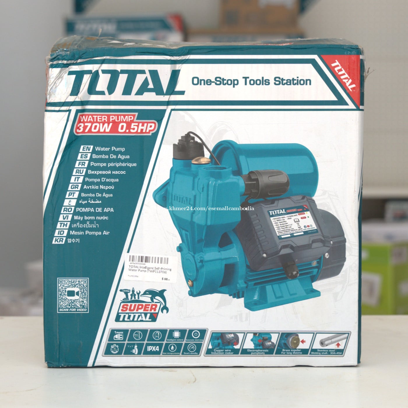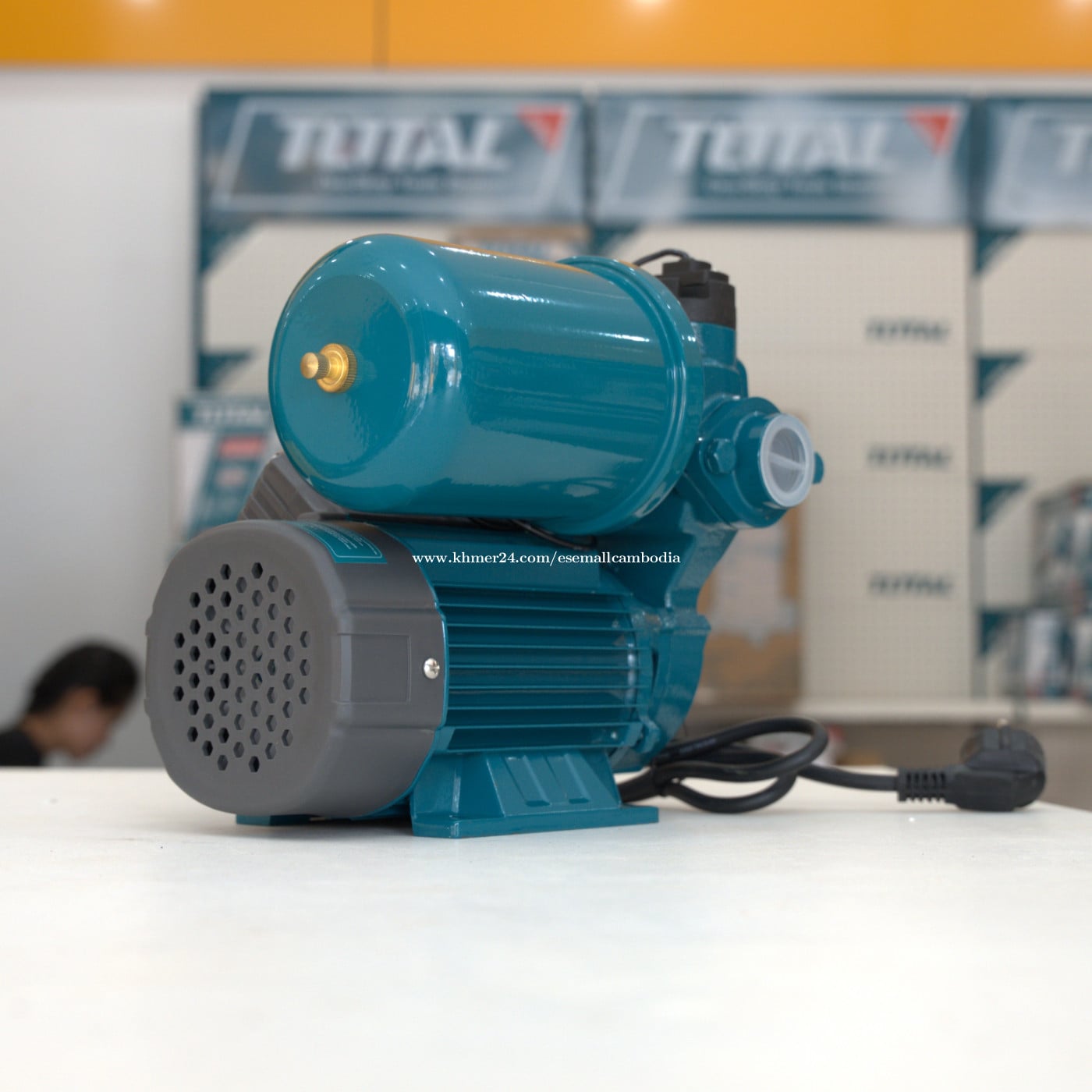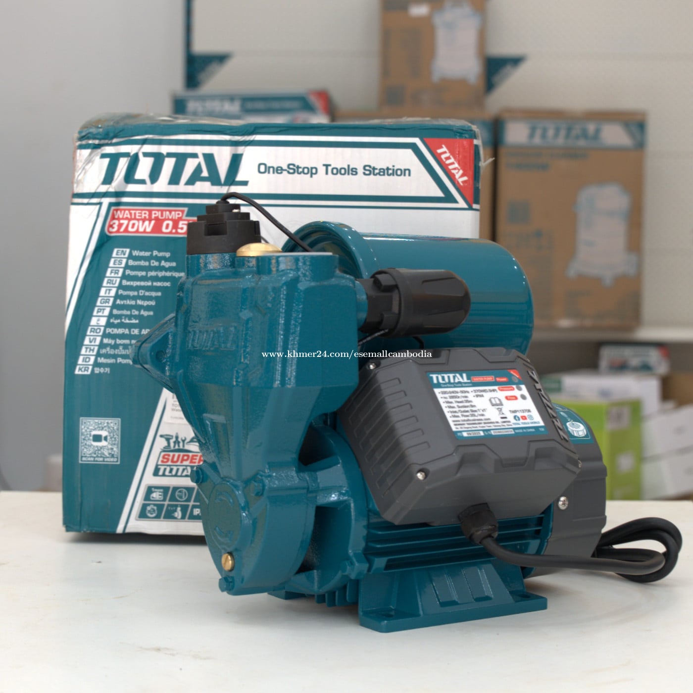 TOTAL Water Pump 370W 0.5HP (Self-Priming) (TWP113706) តម្លៃ៖ $88.40 សភាព៖ ថ្មី 100% ប្រភេទ៖ ម៉ាស៊ីនបូមទឹក / Water Pump ម៉ាក៖ TOTAL ម៉ូដែល៖ Water Pump 370W 0.5HP ពណ៌នាផលិតផល TOTAL Water Pump 370W 0.5HP គឺជាម៉ាស៊ីនបូមទឹកប្រភេទ Self-Priming ដែលមានទំហំតូច កម្លាំងសមរម្យ និងប្រសិទ្ធភាពខ្ពស់។ សាកសមសម្រាប់បូមទឹកប្រើប្រាស់ក្នុងផ្ទះ សួនច្បារ និងការងារបូមទឹកទូទៅ។ រចនារឹងមាំ ប្រើម៉ូទ័រខ្សែស្ពាន់ (Copper Wire Motor) ប្រើបានយូរ និងមានប្រព័ន្ធការពារកំដៅ (Thermal Protector)។ លក្ខណៈបច្ចេកទេស (Specifications) ប្រភេទ៖ Water Pump (Self-Priming) ថាមពលម៉ូទ័រ៖ 370W កម្លាំង៖ 0.5HP ប្រភេទប្រើប្រាស់៖ Electric (ខ្សែភ្លើង) វ៉ុលភ្លើង៖ 220–240V ~ 50Hz ម៉ូទ័រ៖ Copper Wire Motor ប្រព័ន្ធការពារ៖ Thermal Protector ប្រភេទ Impeller៖ Brass Impeller កម្រិតការពារ៖ IPX4 ពណ៌៖ ខៀវ (TOTAL Design) អត្ថប្រយោជន៍ កម្លាំង 370W សមស្របសម្រាប់ការប្រើប្រាស់ប្រចាំថ្ងៃ ប្រភេទ Self-Priming បូមទឹកបានងាយ ម៉ូទ័រខ្សែស្ពាន់ រឹងមាំ និងប្រើបានយូរ មានប្រព័ន្ធការពារកំដៅ សុវត្ថិភាព ទំហំតូច ងាយដំឡើង និងថែទាំ សាកសមសម្រាប់ បូមទឹកប្រើប្រាស់ក្នុងផ្ទះ សួនច្បារ និងផ្ទះជាន់តូច ការងារបូមទឹកទូទៅ អ្នកប្រើប្រាស់ផ្ទះ និងអ្នកជាង