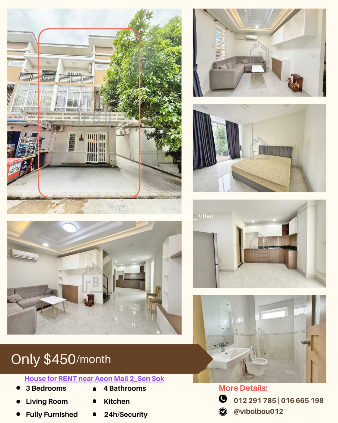 Townhouse 3 Bedrooms for RENT near AEON Mall 2_Sen Sok ๐Oknha Mong Reththy St. (1928) House Details: โ๏ธ Community Gate (Borey) โ๏ธ Floor: 3th Story โ๏ธ Land size : 6.5m x 20m โ๏ธ House size : 05m x 14m โ๏ธ Bedrooms : 3 โ๏ธ Bathrooms : 4 โ๏ธ Kitchen : 1 โ๏ธ Living Room : 1 โ๏ธ Facing to east โ๏ธ Fully Furnished โ๏ธ 24/7 Security Guards on main gate ๐ทRental Price: $450/month (Negotiate) _ _ _ _ _ _ _ _ _ _ _ _ _ _ _ โ๏ธPLEASE CONTACE US: +8551229xxxClick To Call5 / +8551666xxxClick To Call8 +Telegram: https://t.me/vibolbou012 +WhatsApp: https://wa.link/2zexez +WeChat ID: vb016665xxxClick To Call