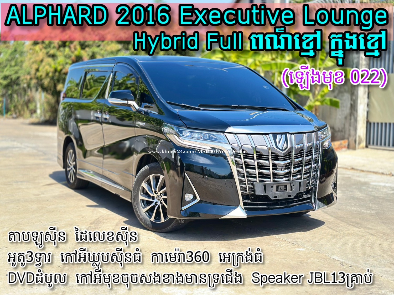ស្តុកថ្មីទើបរៀបចំរួច ធានាឡានស្អាតអត់មានបុកប៉ះ TOYOTA ALPHARD 2016 V4 Executive Lounge Hybrid Full Option ពណ៌ខ្មៅ ក្នុងខ្មៅ(ឡើងមុខ 022) *តាបឡូស៊ីន *ដៃលេខស៊ីន *កៅអីឃ្លុបស៊ីនធំ *ទ្វារអូតូ3ទ្វារ *កាមេរ៉ា360 *អេក្រង់ធំ *DVDដំបូល *Speaker JBL13គ្រាប់ *កៅអីមុខចុចសងខាងមានទ្រជើង 💵តំលៃ 59000$ 💰💵ចរចា 👉Channel Telegram: https://t.me/MSP601auto ☎️សម្រាប់ពត៌មានលម្អិតទាក់ទងទូរស័ព្ទលេខៈ 🟢087824xxxClick To Call (Smart) *Link Telegram (https://t.me/CHHAYMENG) 🟡078653xxxClick To Call (Cellcard) *Telegram 🔴068824xxxClick To Call (Metfone) *Telegram